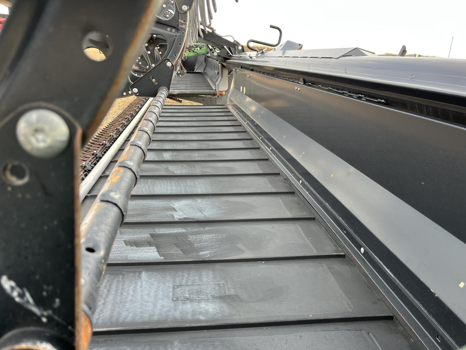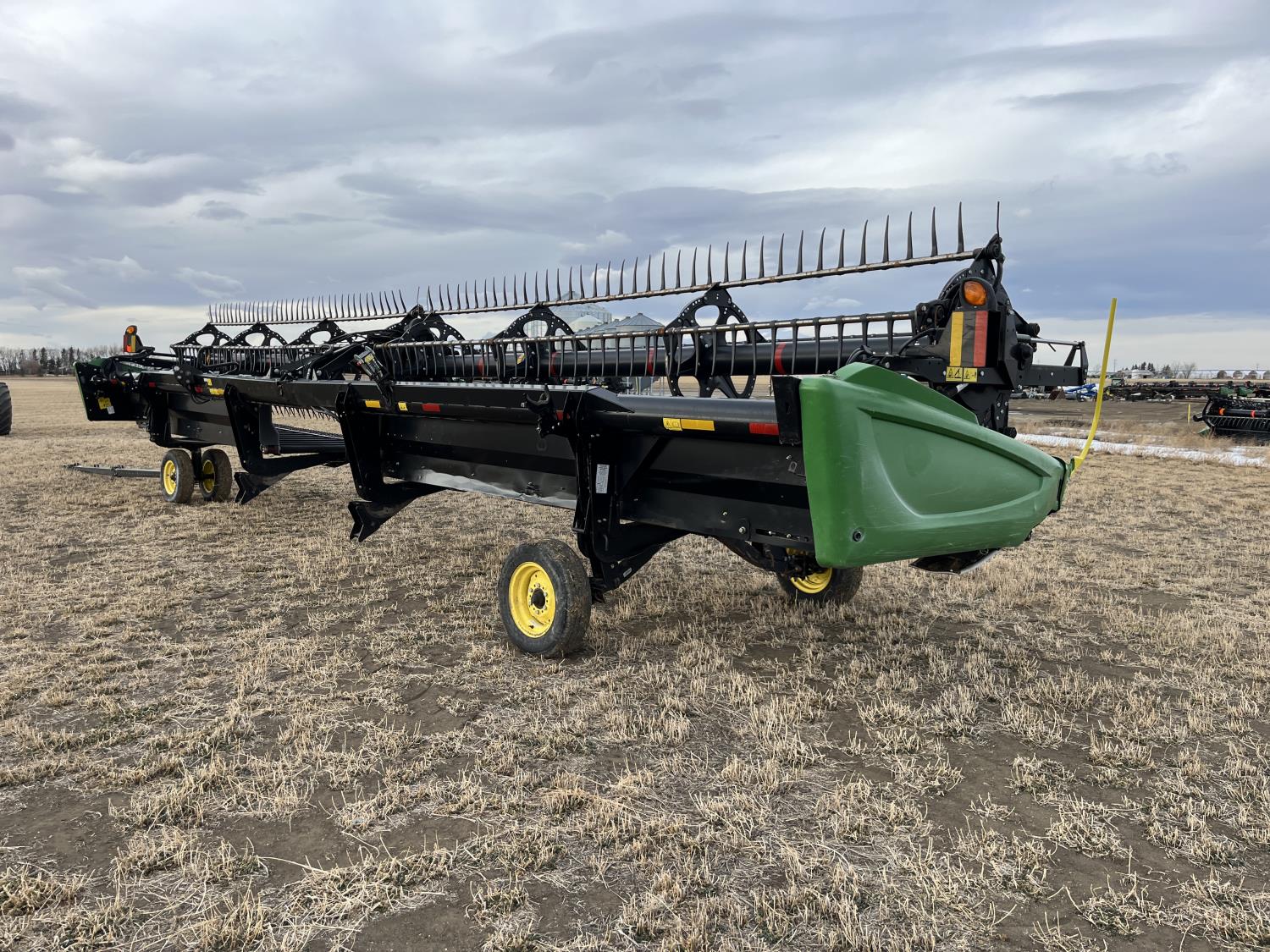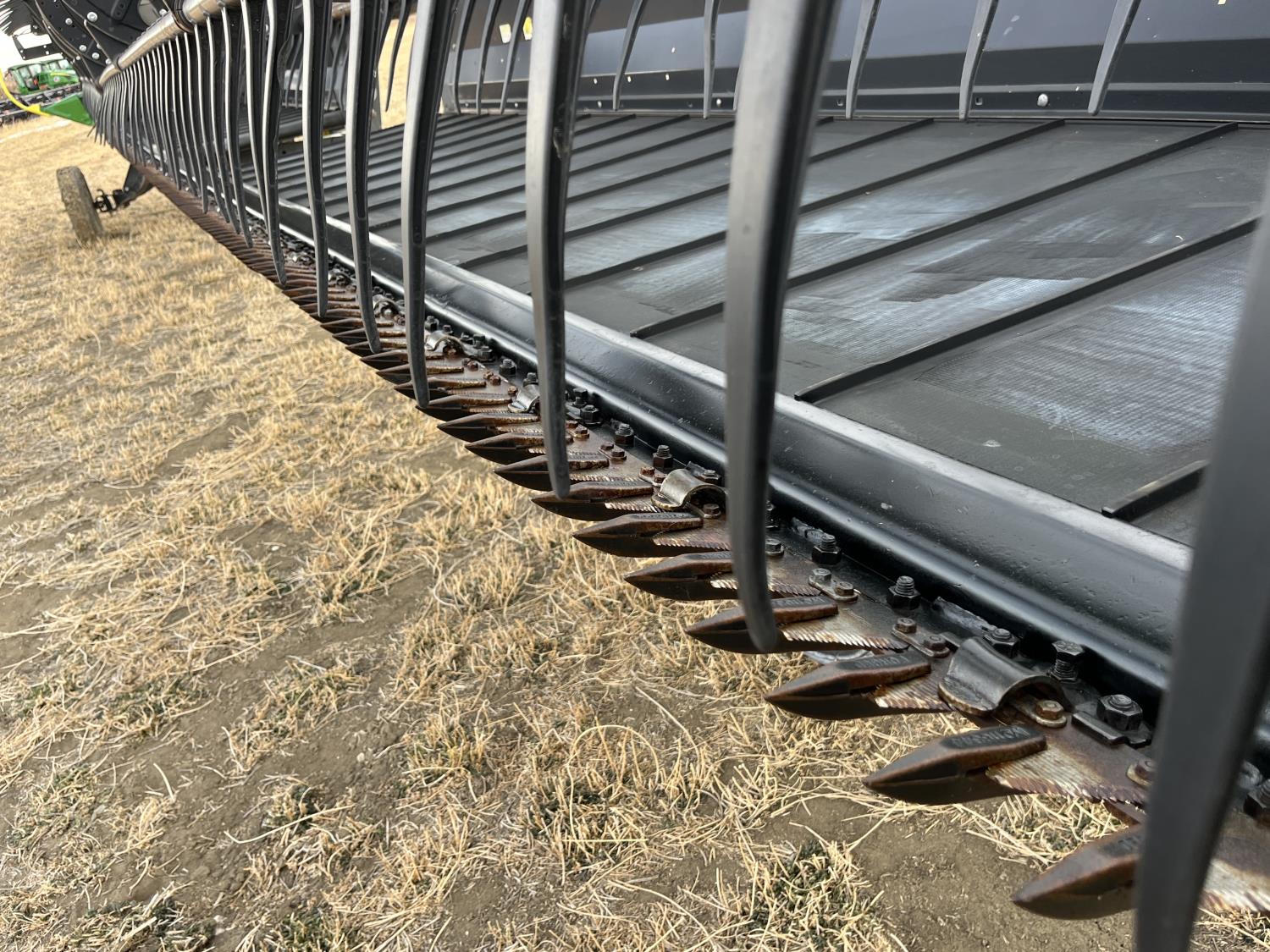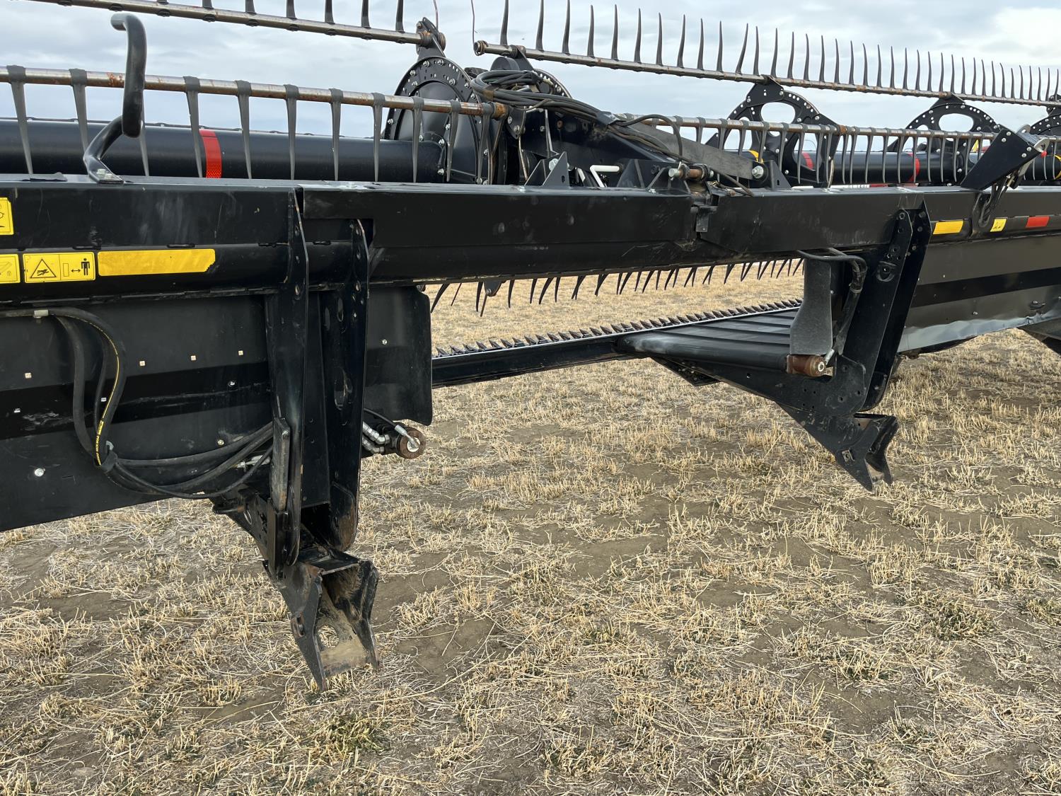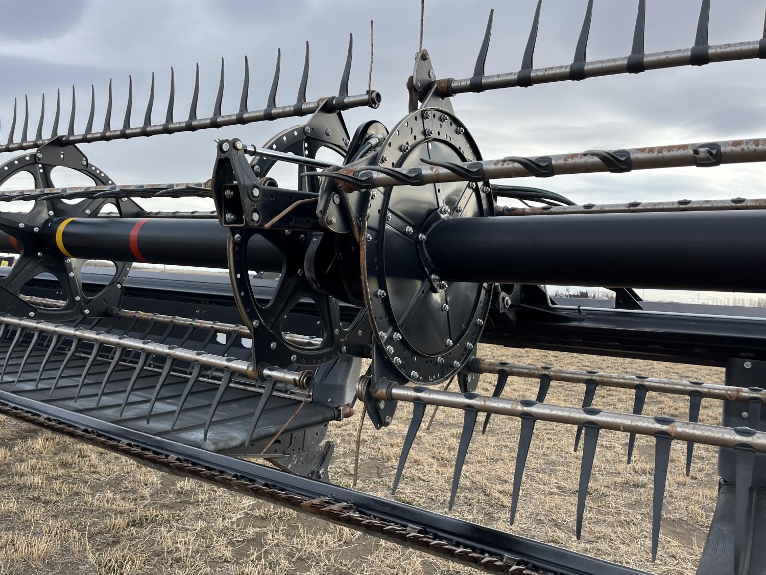 center delivery, split pickup reels, fore & aft, double knife drive, poly skid plates, crop dividers, factory transport, triple delivery ready but requires hydraulic kit