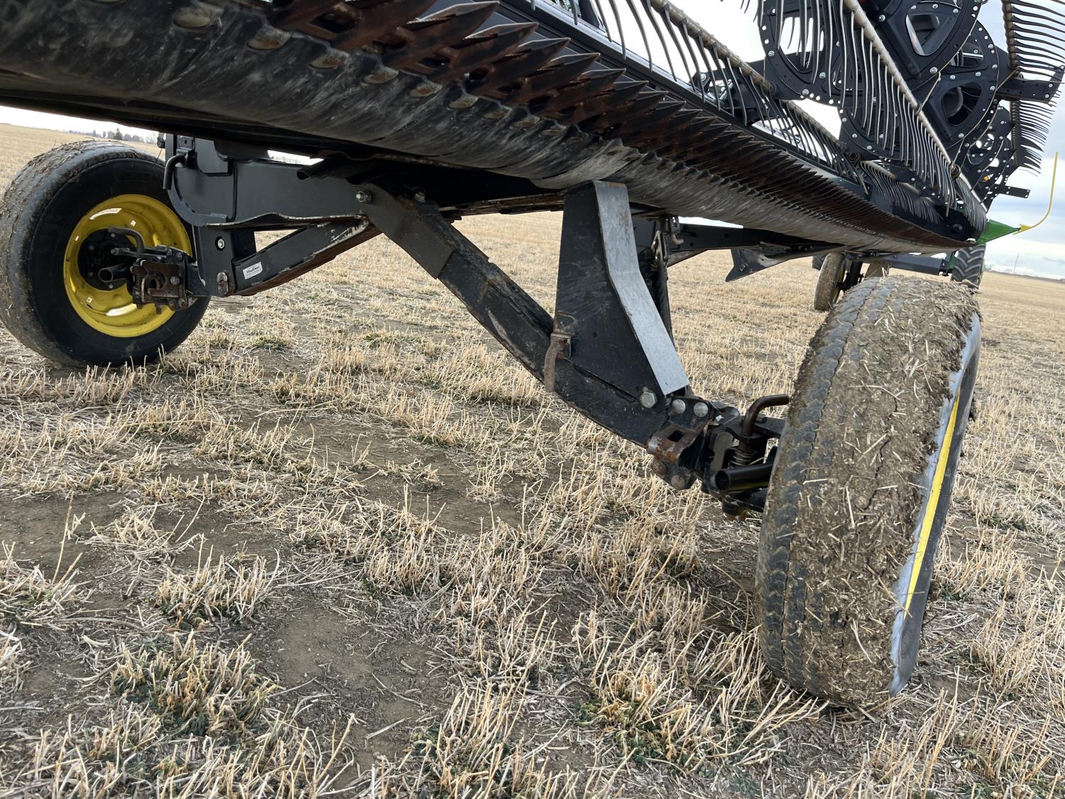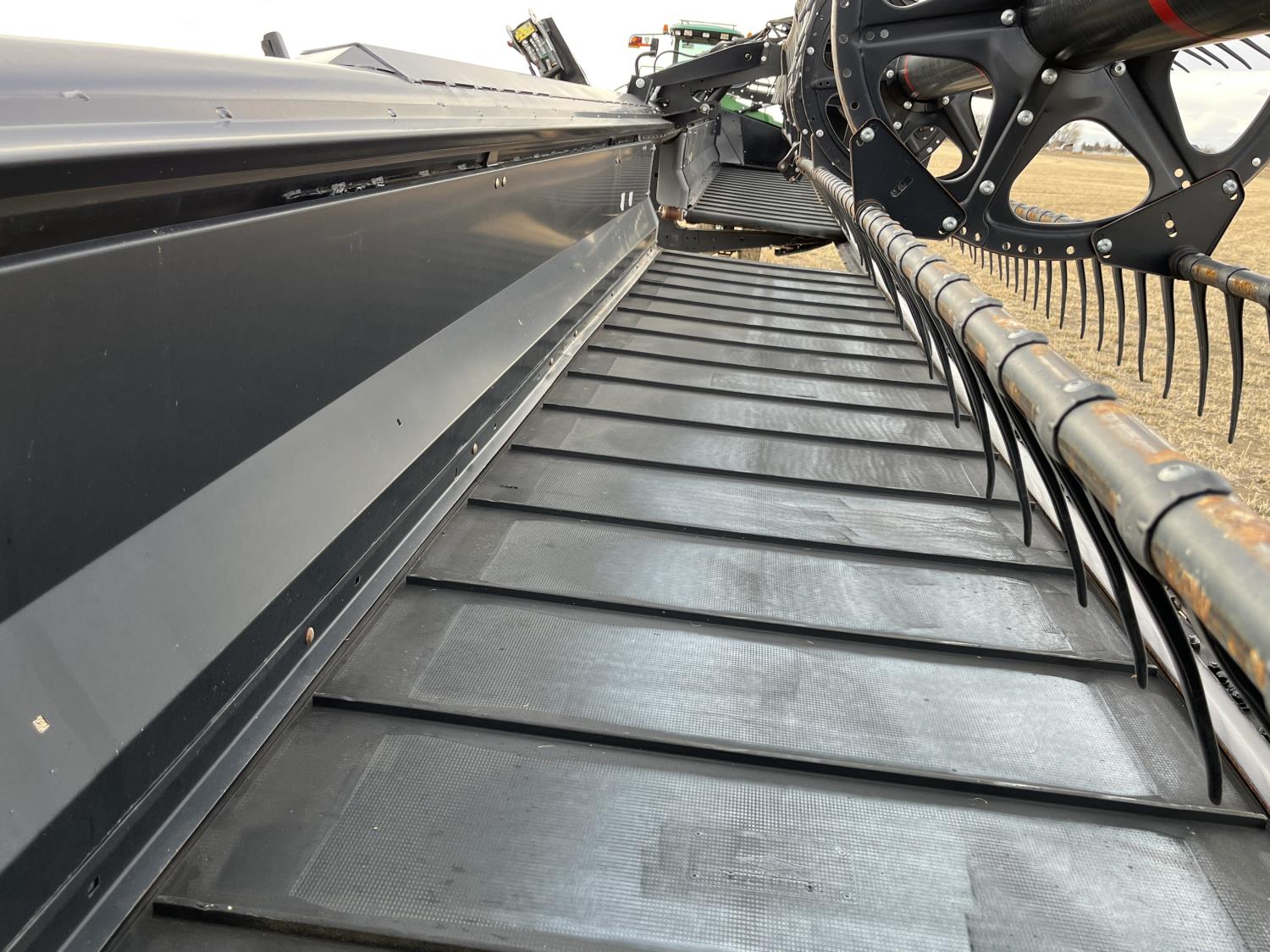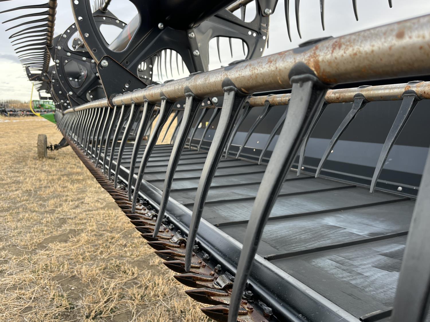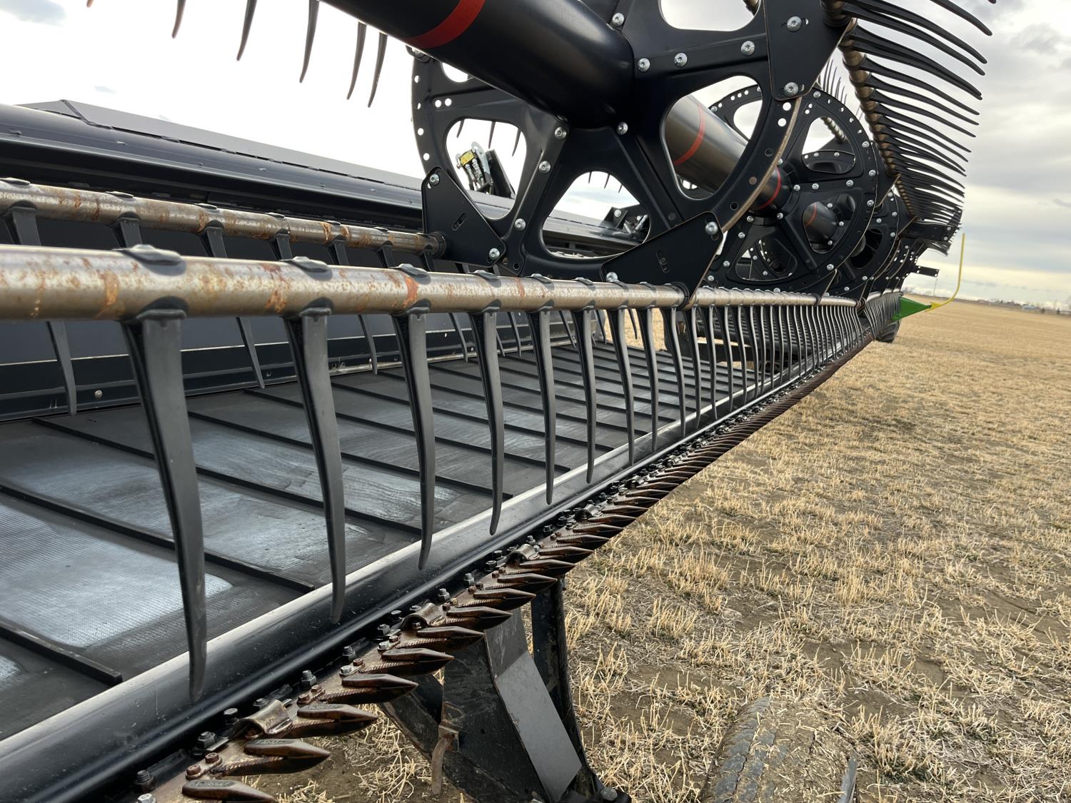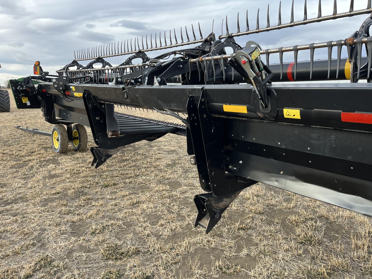 center delivery, split pickup reels, fore & aft, double knife drive, poly skid plates, crop dividers, factory transport, triple delivery ready but requires hydraulic kit