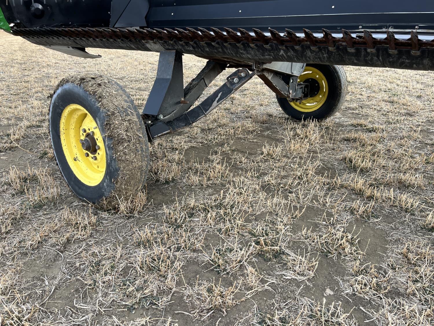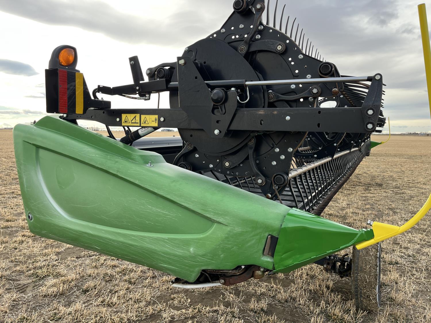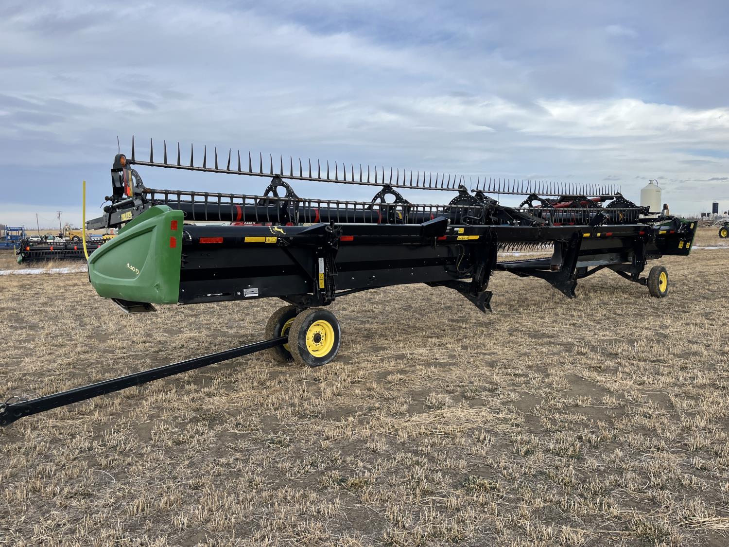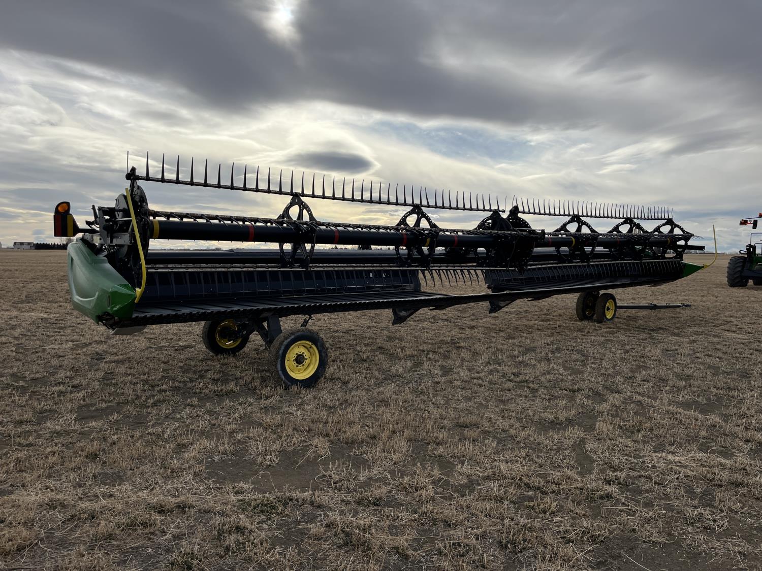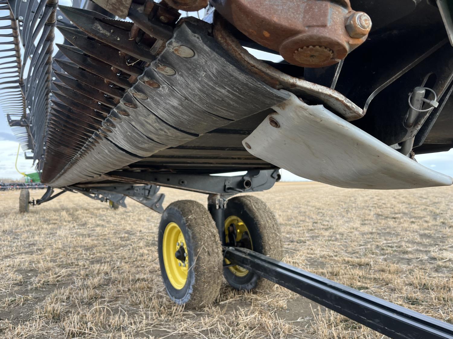 center delivery, split pickup reels, fore & aft, double knife drive, poly skid plates, crop dividers, factory transport, triple delivery ready but requires hydraulic kit