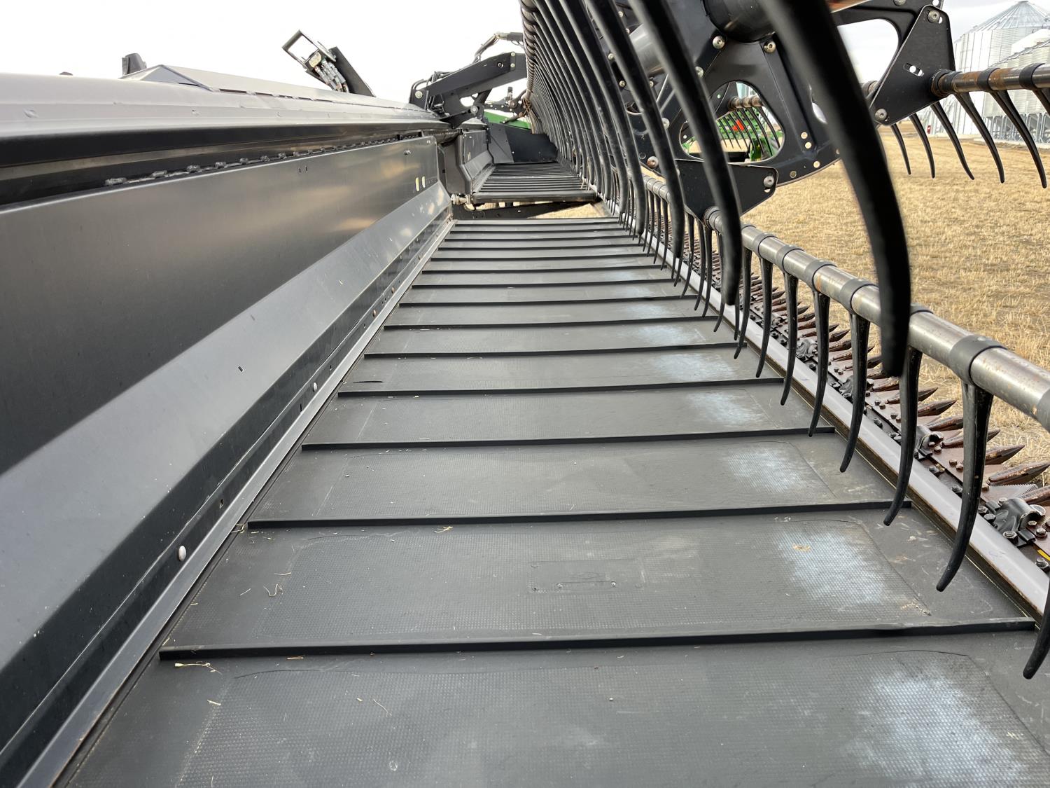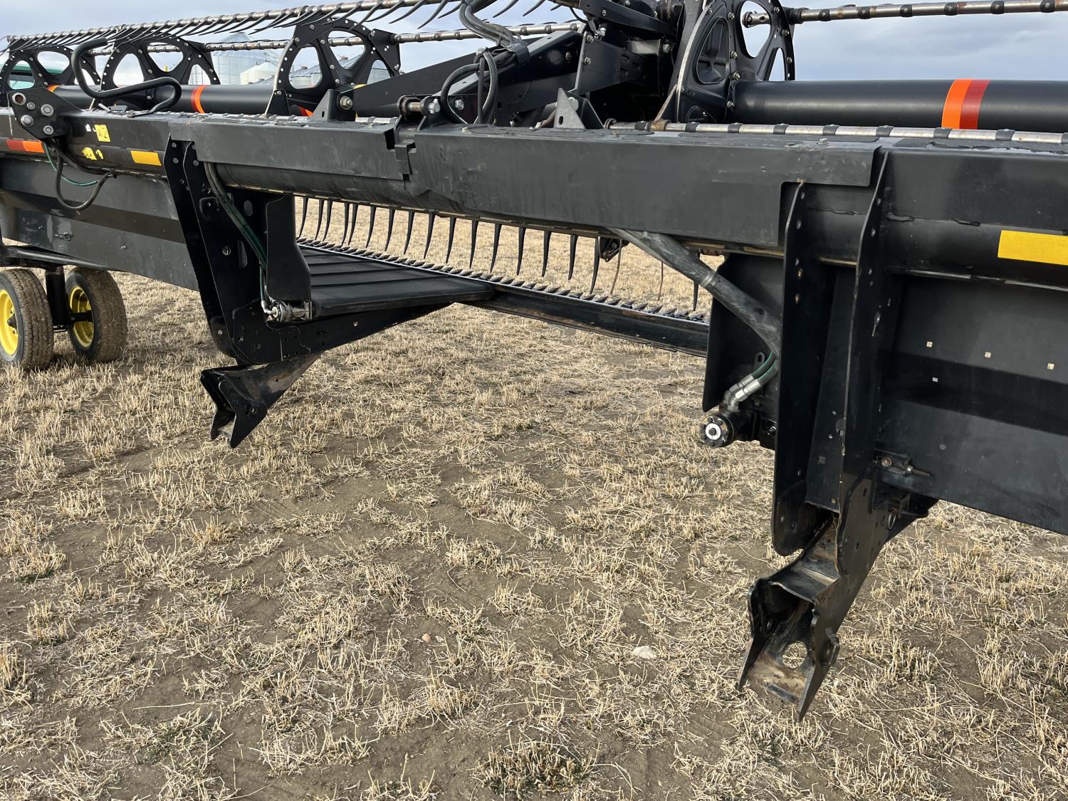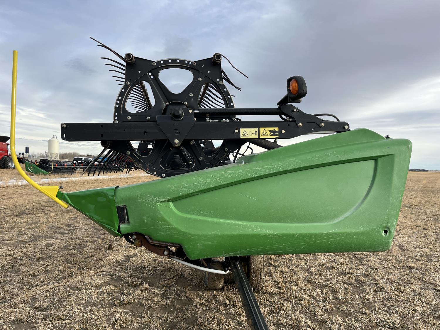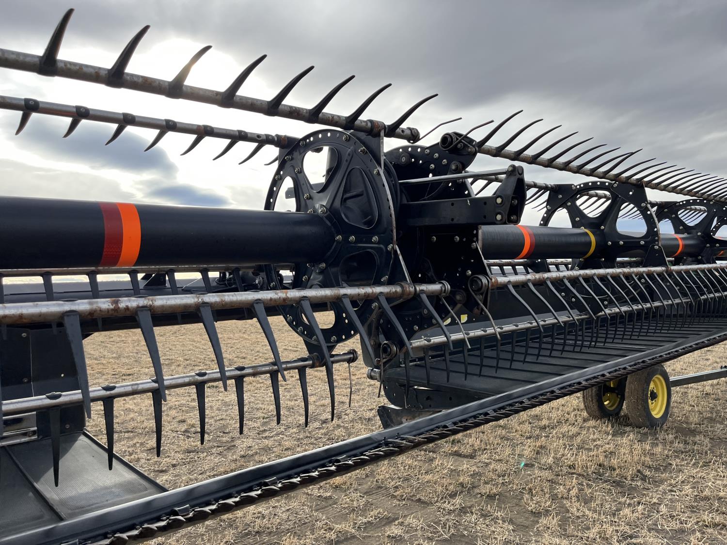 center delivery, split pickup reels, fore & aft, double knife drive, poly skid plates, crop dividers, factory transport, triple delivery ready but requires hydraulic kit