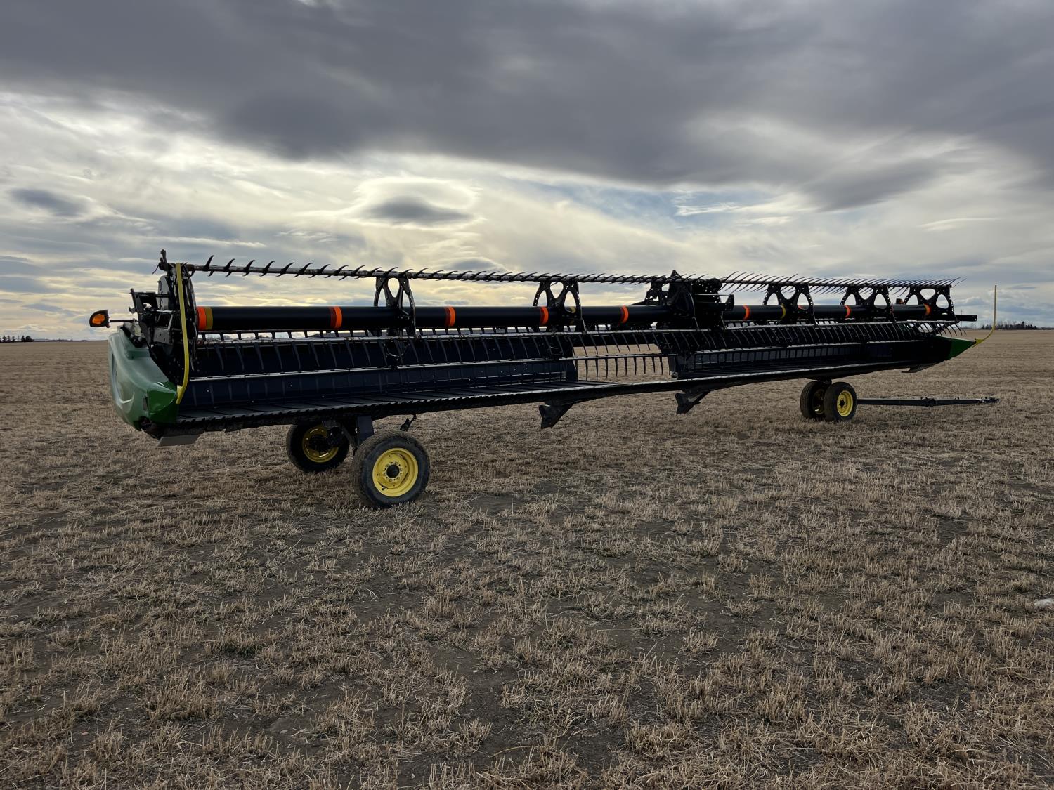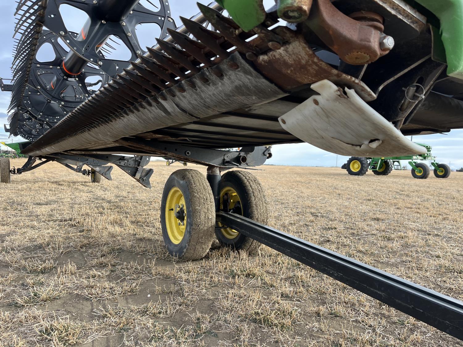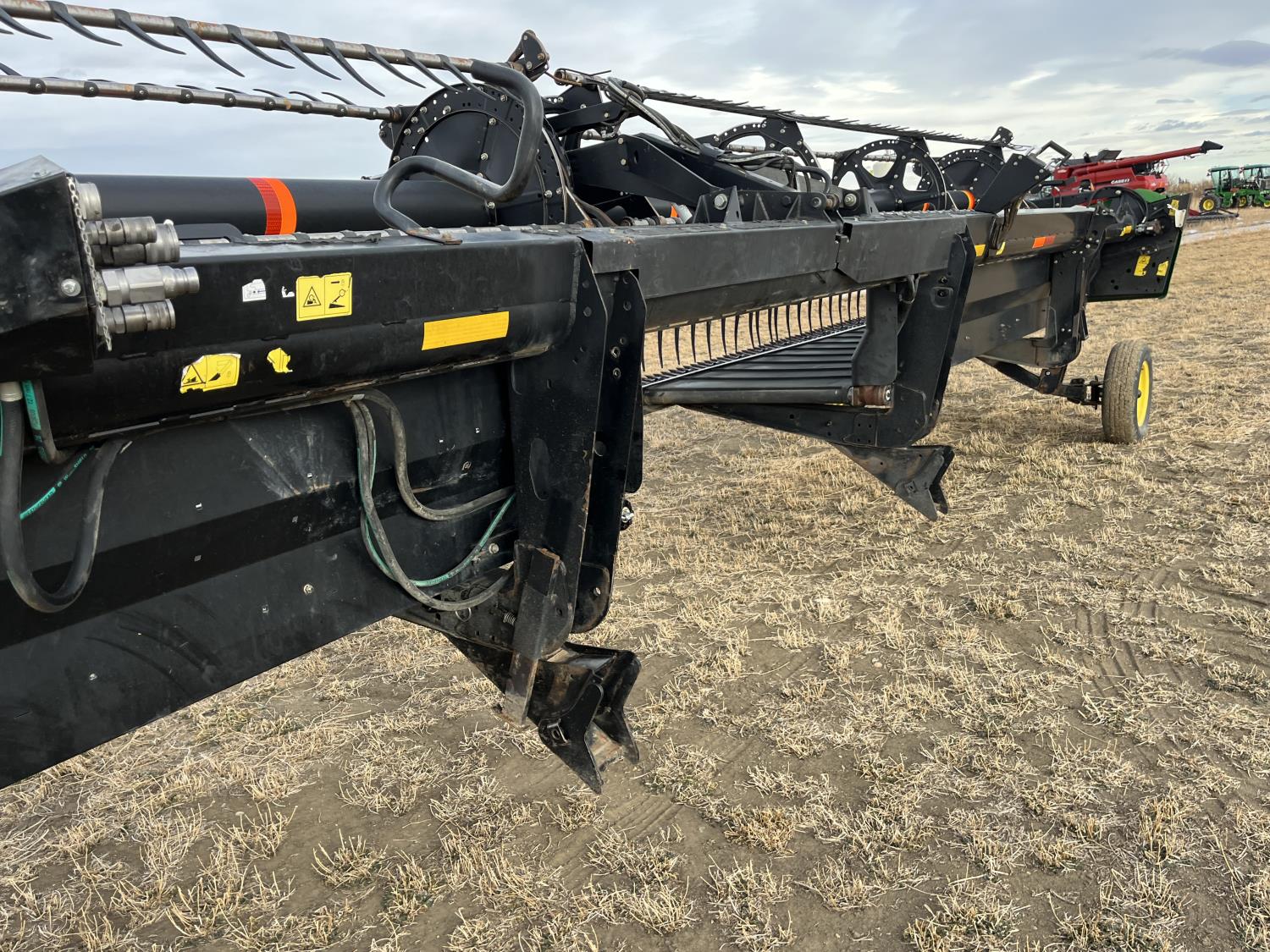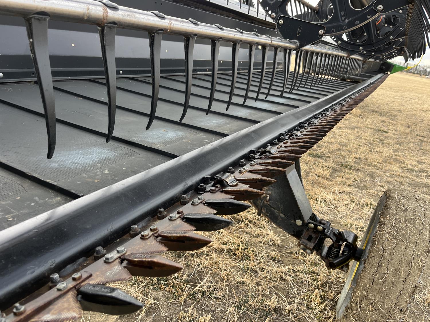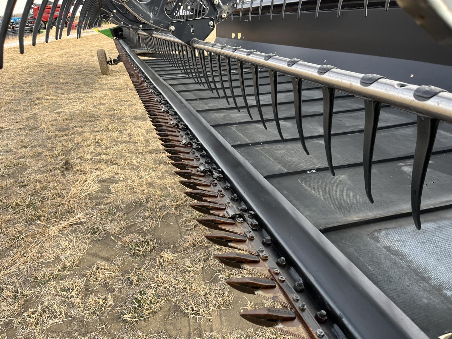 center delivery, split pickup reels, fore & aft, double knife drive, poly skid plates, crop dividers, factory transport, triple delivery ready but requires hydraulic kit