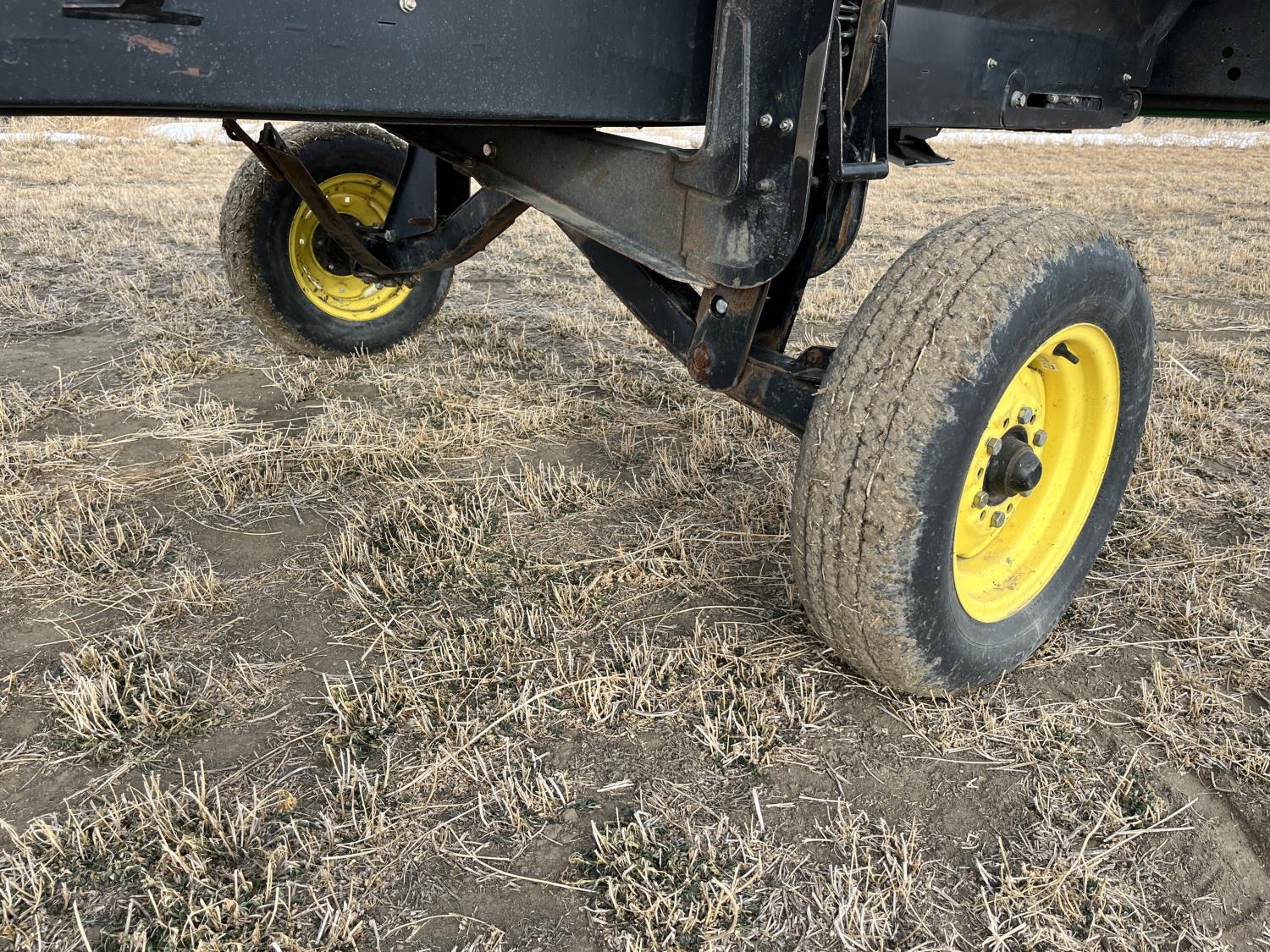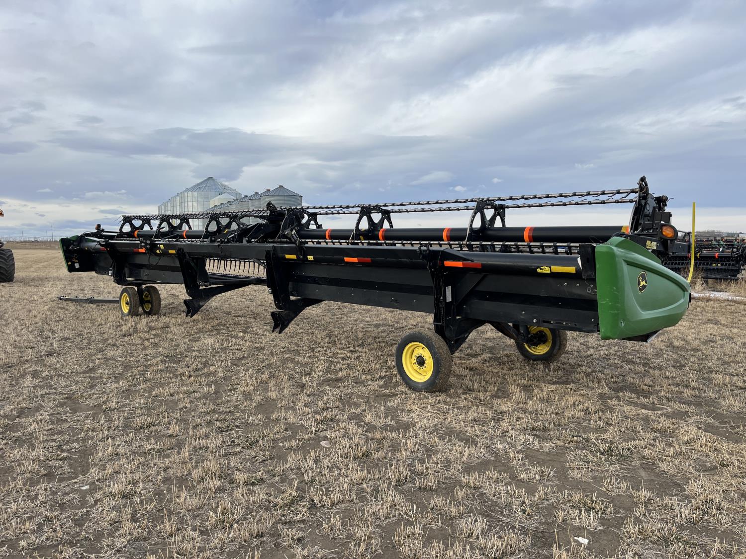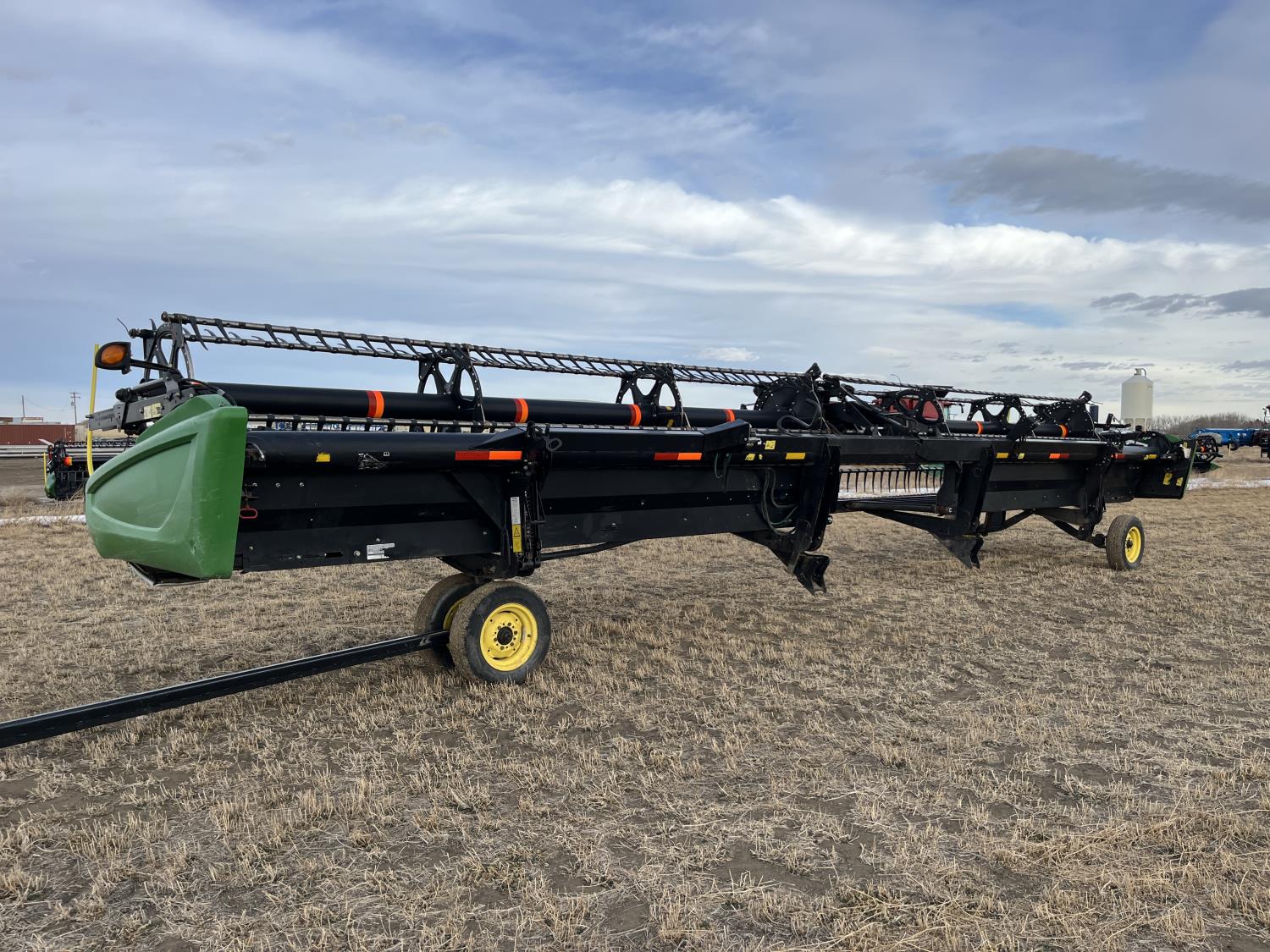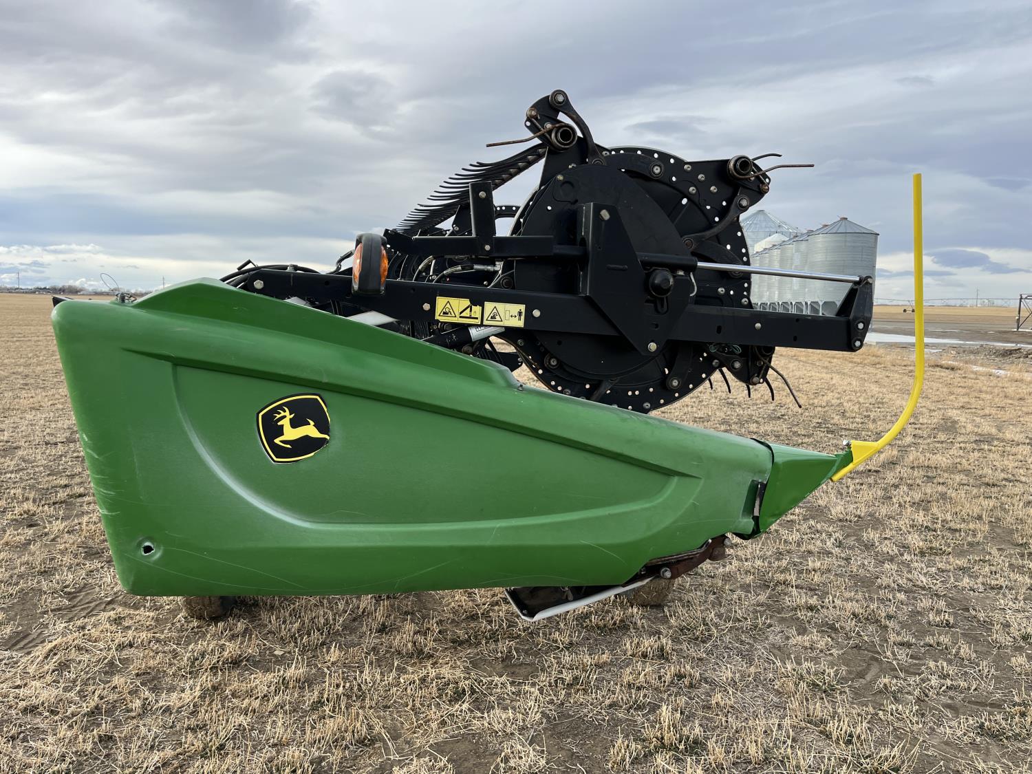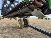 center delivery, split pickup reels, fore & aft, double knife drive, poly skid plates, crop dividers, factory transport, triple delivery ready but requires hydraulic kit