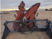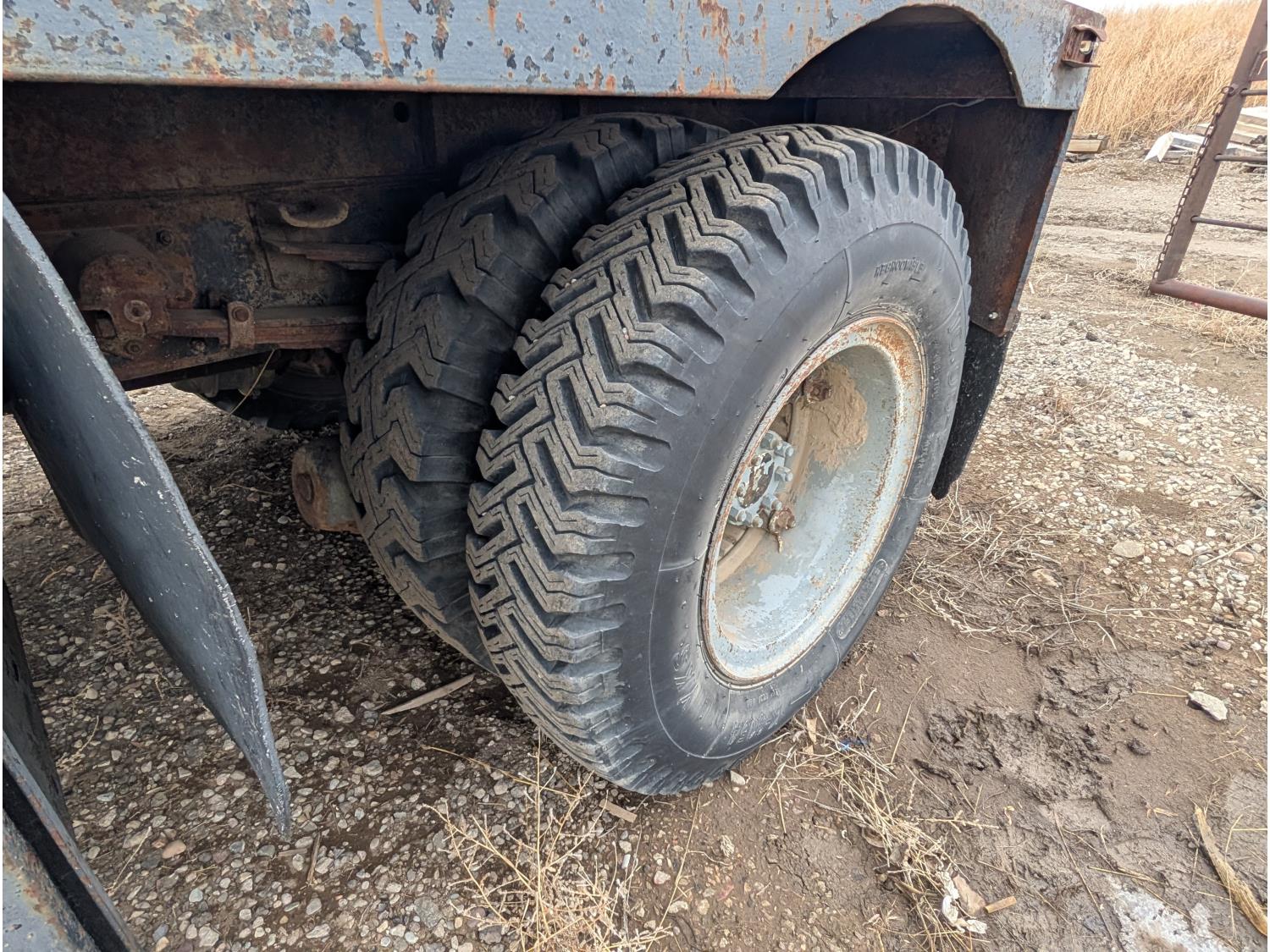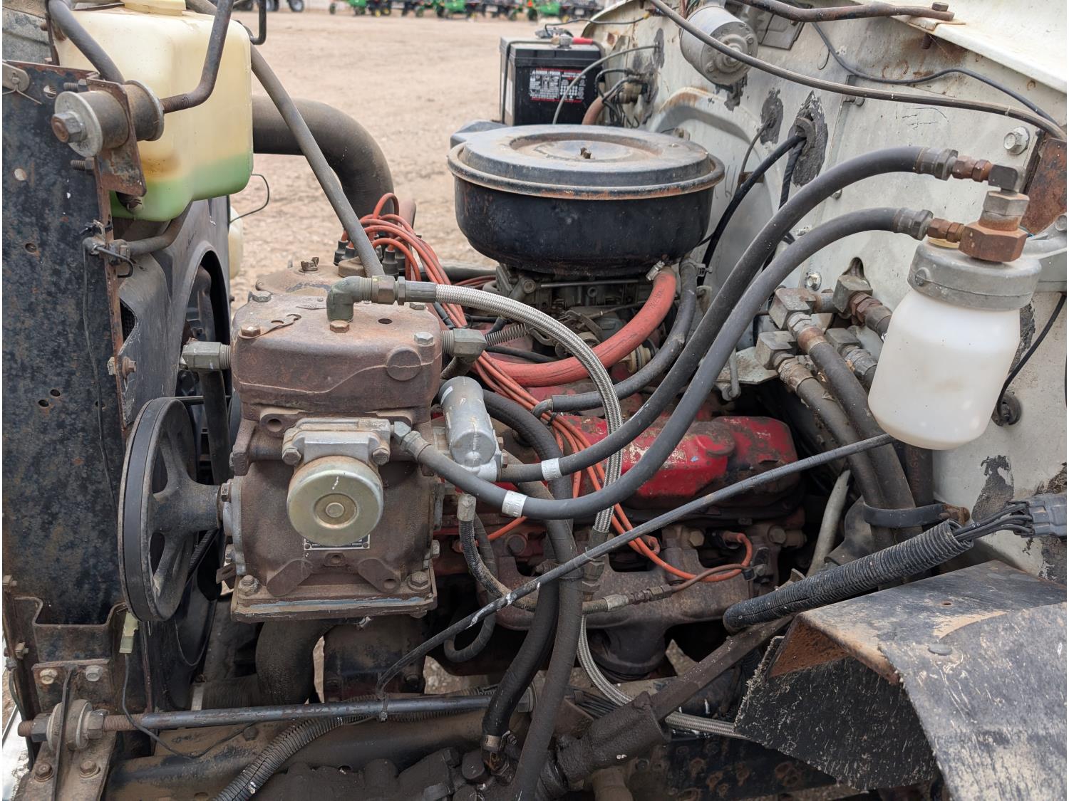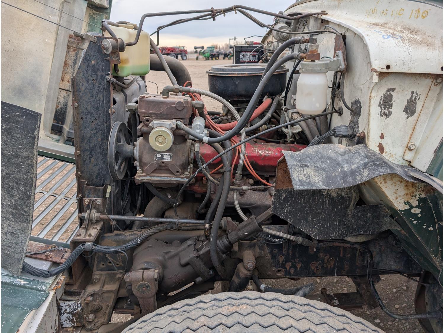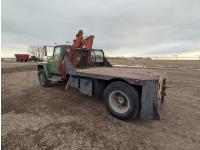V8 gas engine, 5X2 manual transmission, 28 inch x 22 inch x 19 inch steel tool boxes, 8 ft x 9 ft 10 inch deck, SKB 40008K2 3 section 20 ft knuckle front mount crane, outriggers, spring suspension, 187 inch WB, 10.00-20 tires