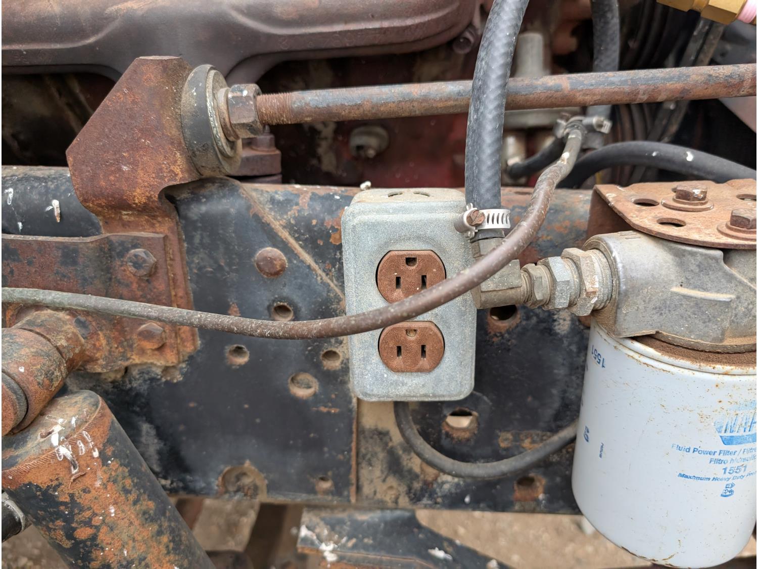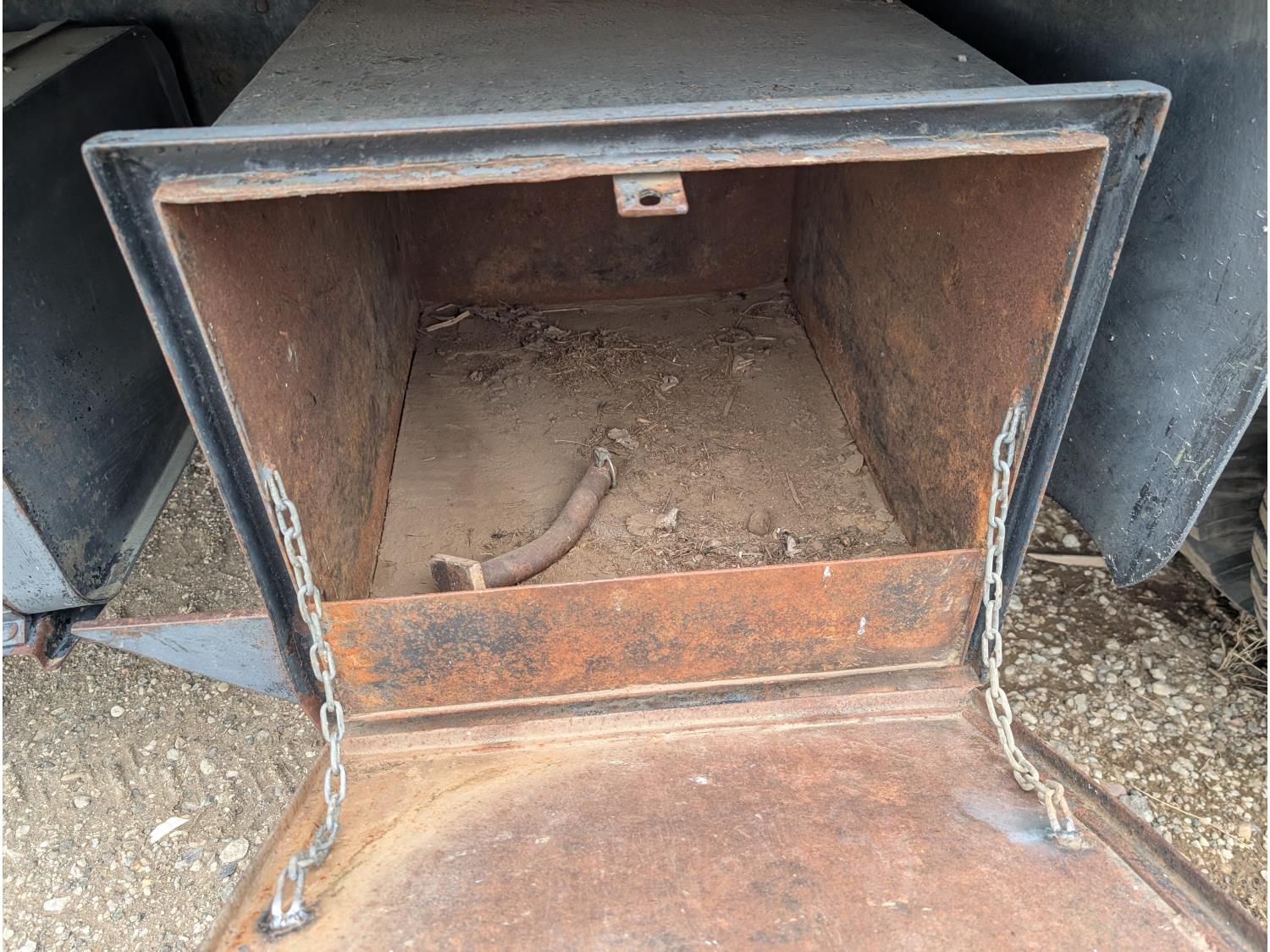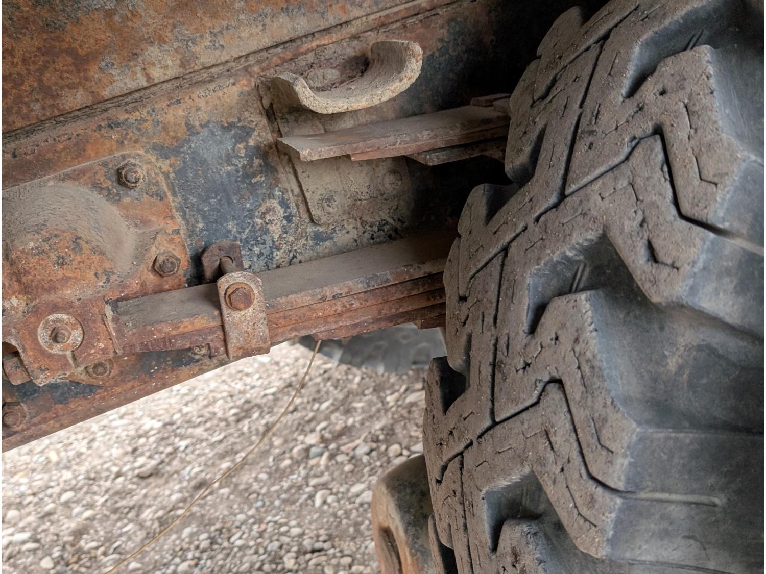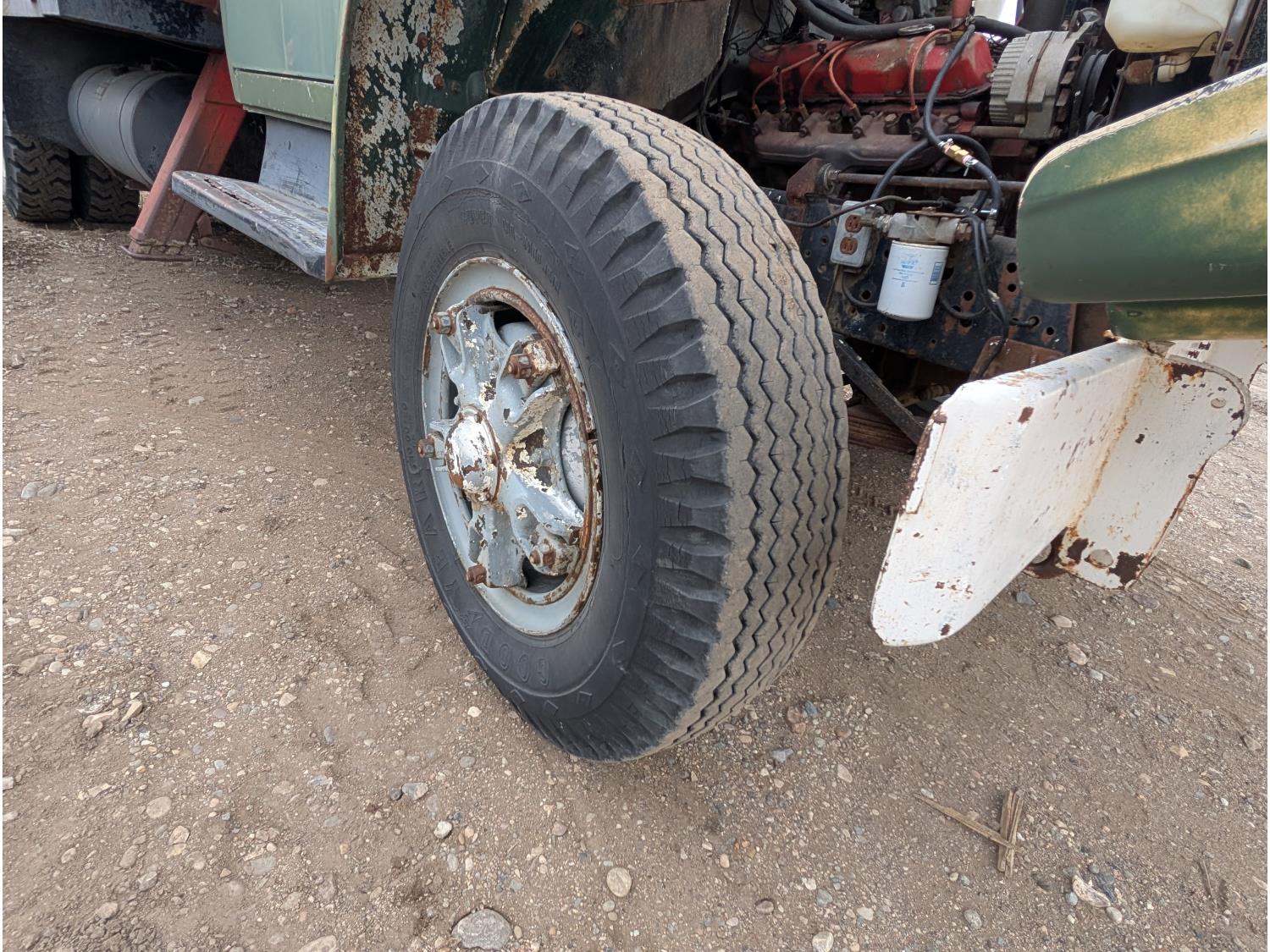 V8 gas engine, 5X2 manual transmission, 28 inch x 22 inch x 19 inch steel tool boxes, 8 ft x 9 ft 10 inch deck, SKB 40008K2 3 section 20 ft knuckle front mount crane, outriggers, spring suspension, 187 inch WB, 10.00-20 tires