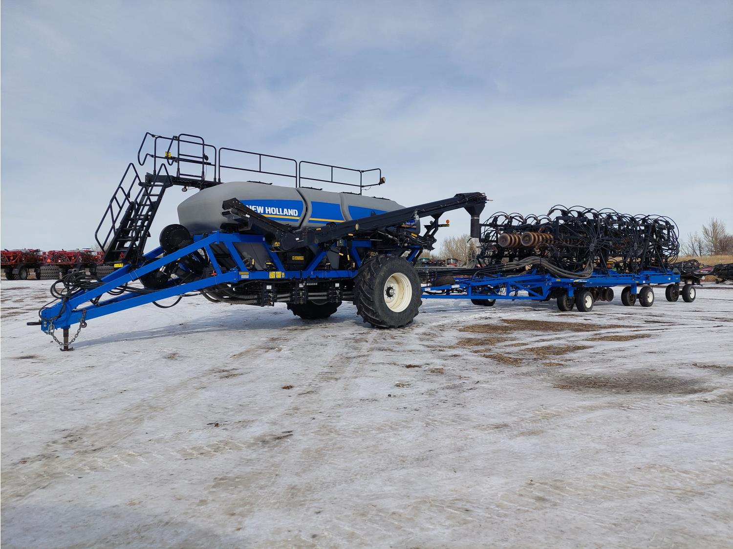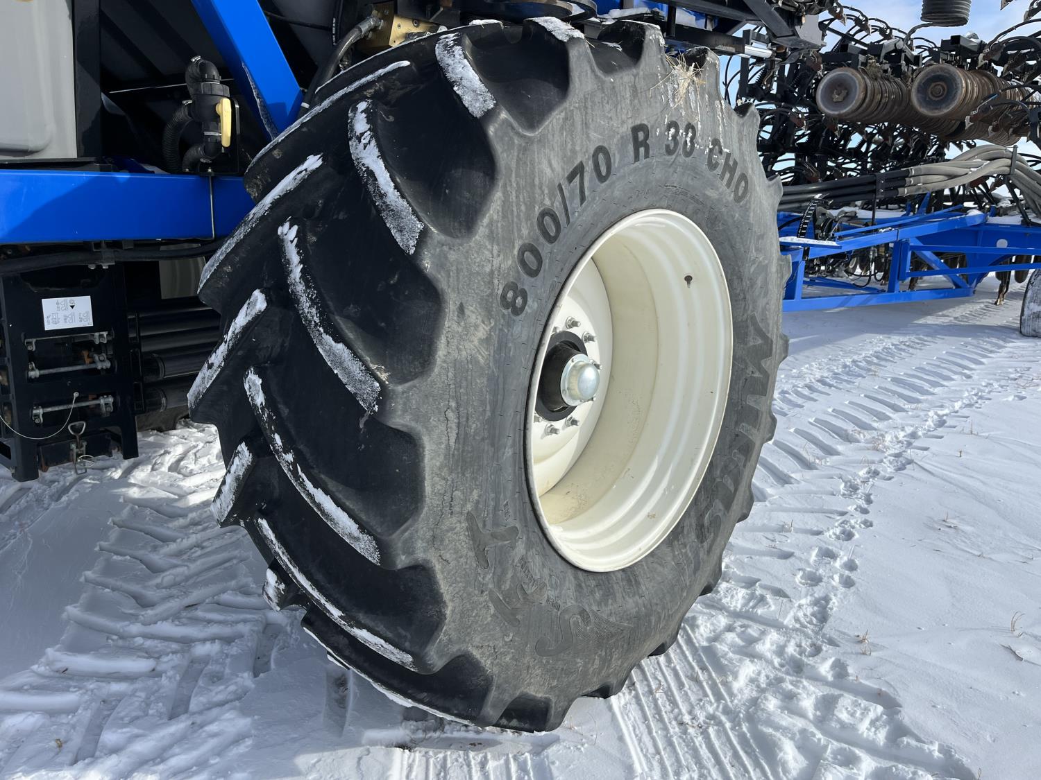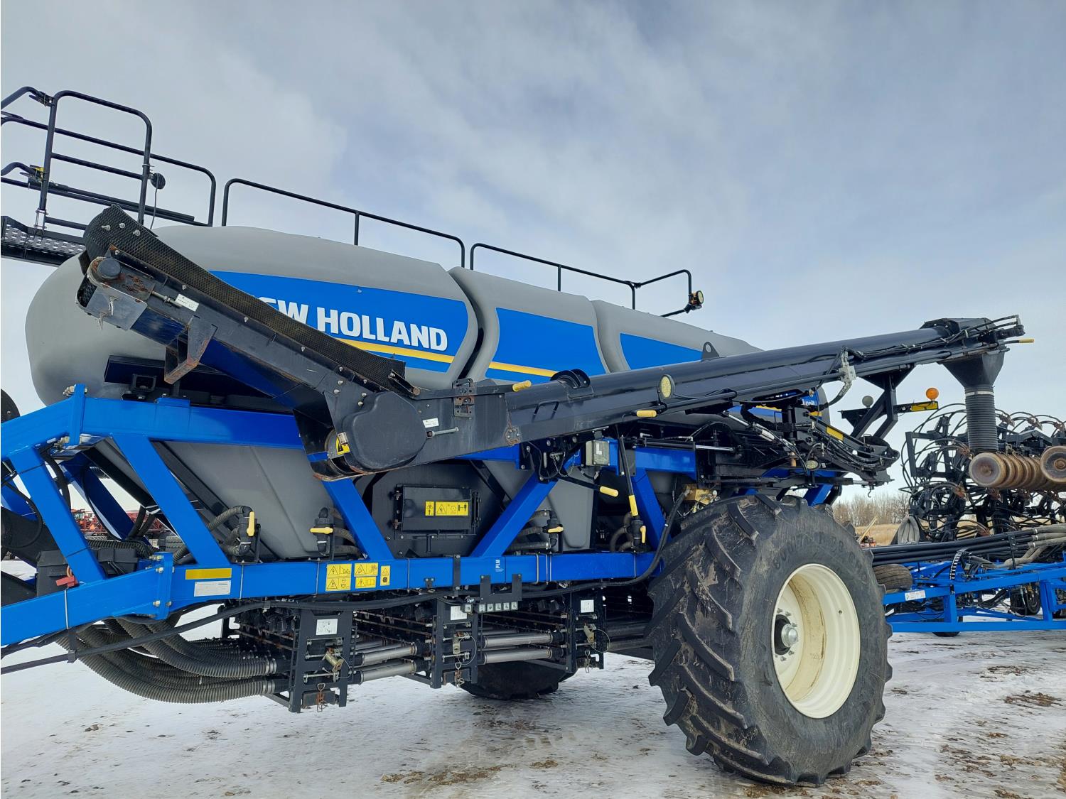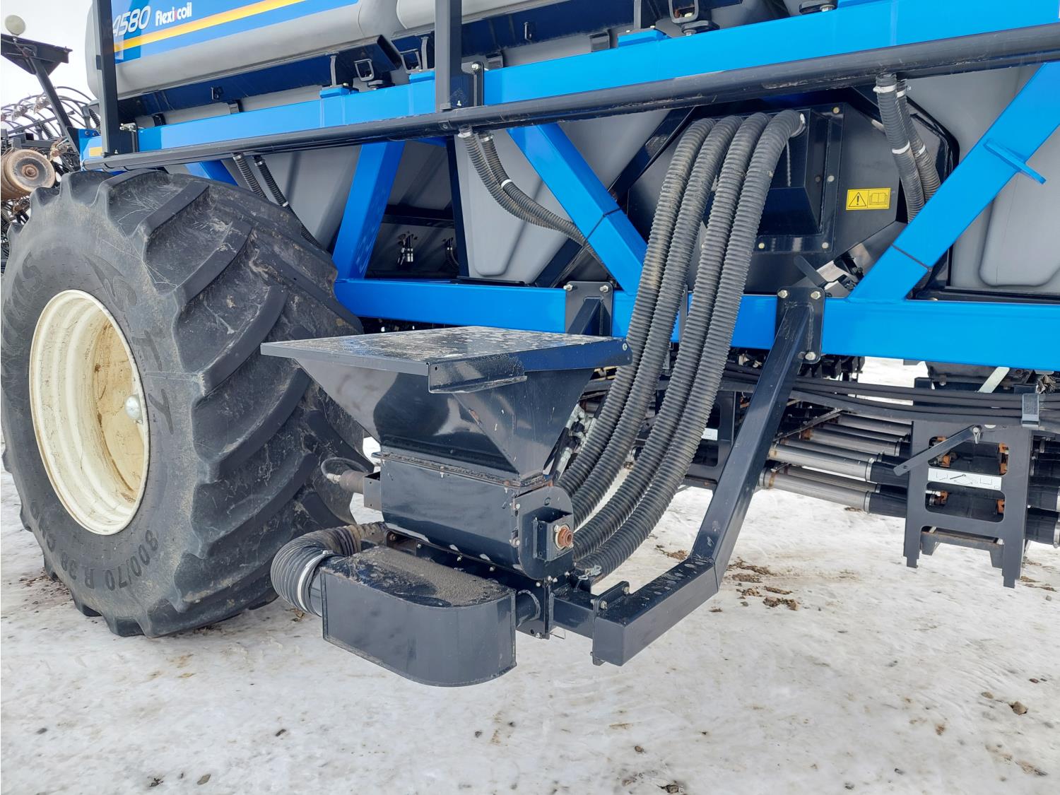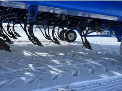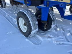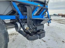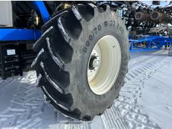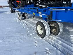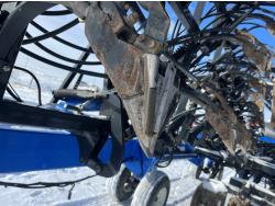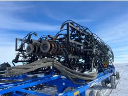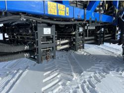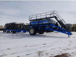 10 inch spacing, double shoot 3.5 inch Dutch openers, 4.5 inch steel packers, seed monitor, Air Cart: 4 compartments, 15 inch loading conveyor, double fan, sectional control, 800/70R33 tires, 30,100 acres seeded on cart, approx 45,000 acres seeded on drill, canola tank, New Holland Intelliview monitor