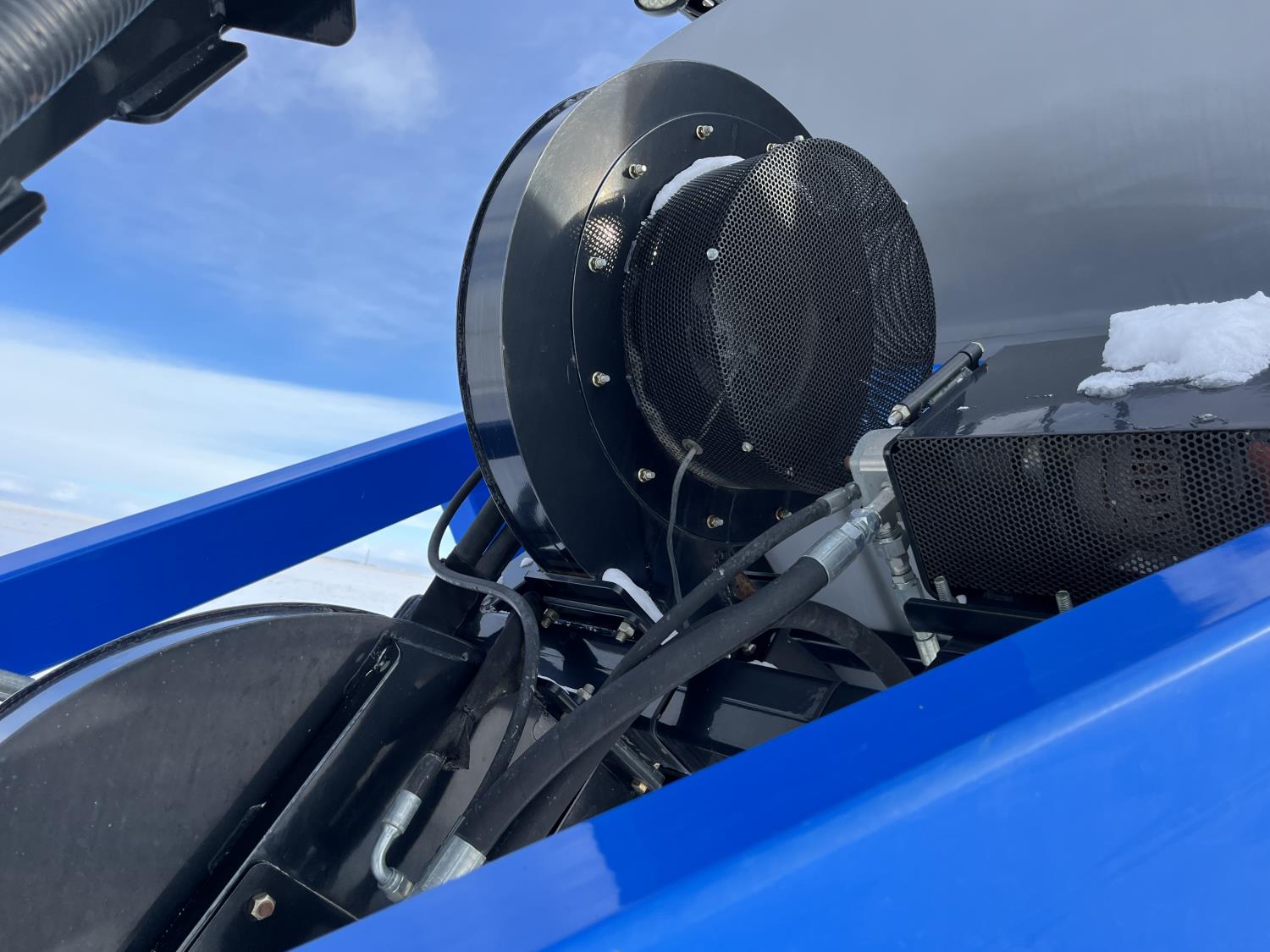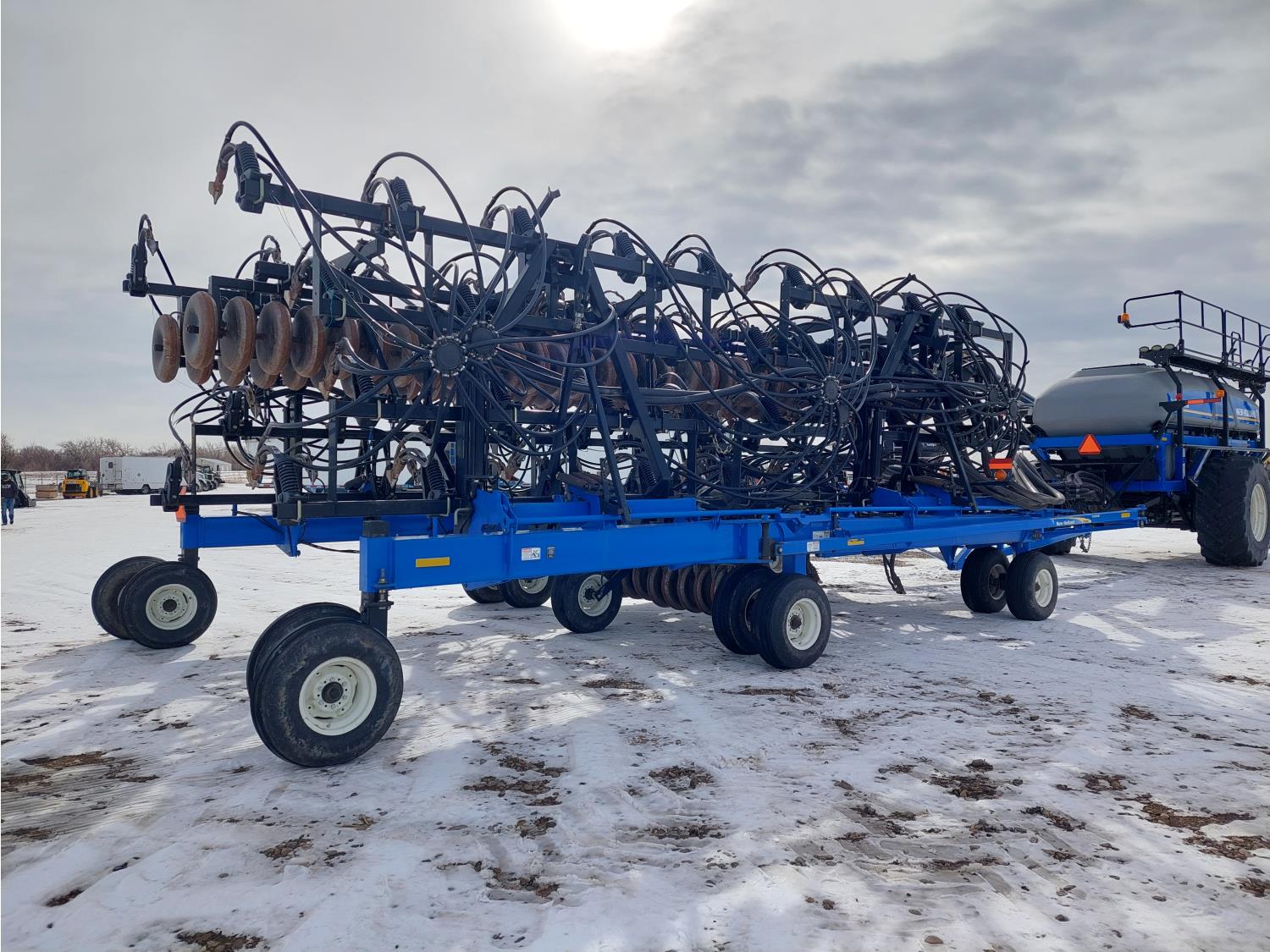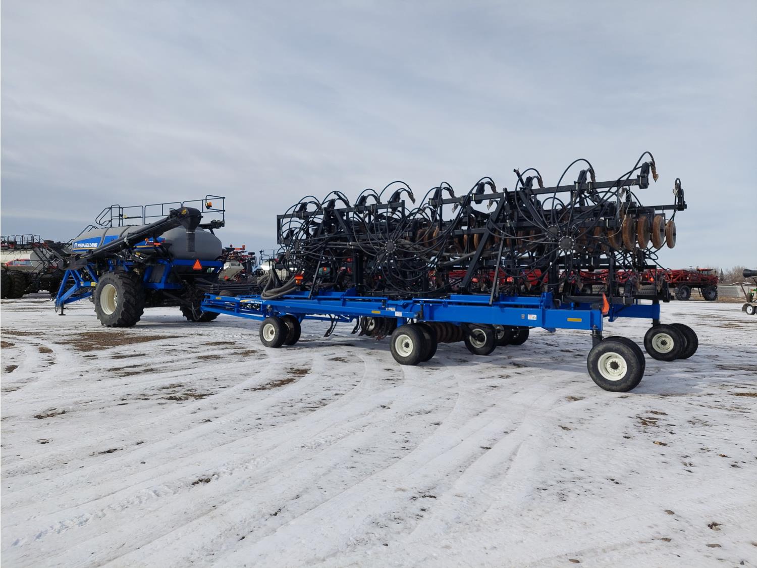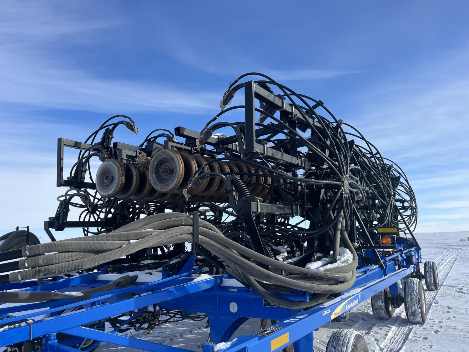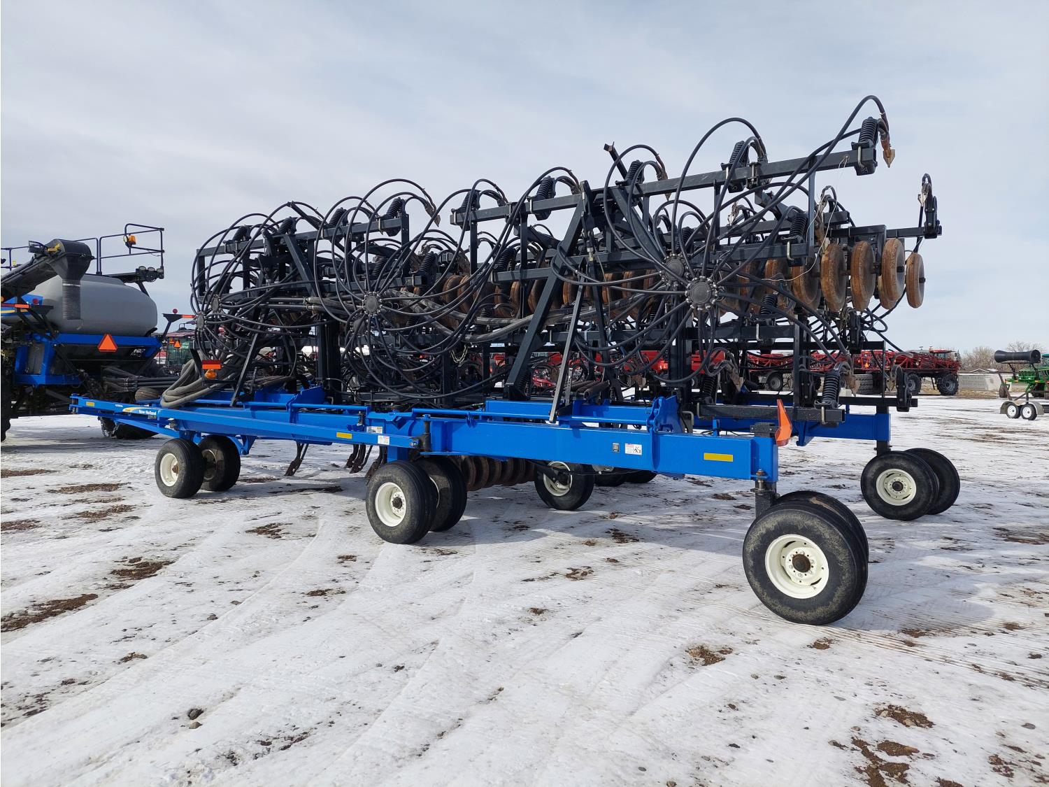 10 inch spacing, double shoot 3.5 inch Dutch openers, 4.5 inch steel packers, seed monitor, Air Cart: 4 compartments, 15 inch loading conveyor, double fan, sectional control, 800/70R33 tires, 30,100 acres seeded on cart, approx 45,000 acres seeded on drill, canola tank, New Holland Intelliview monitor