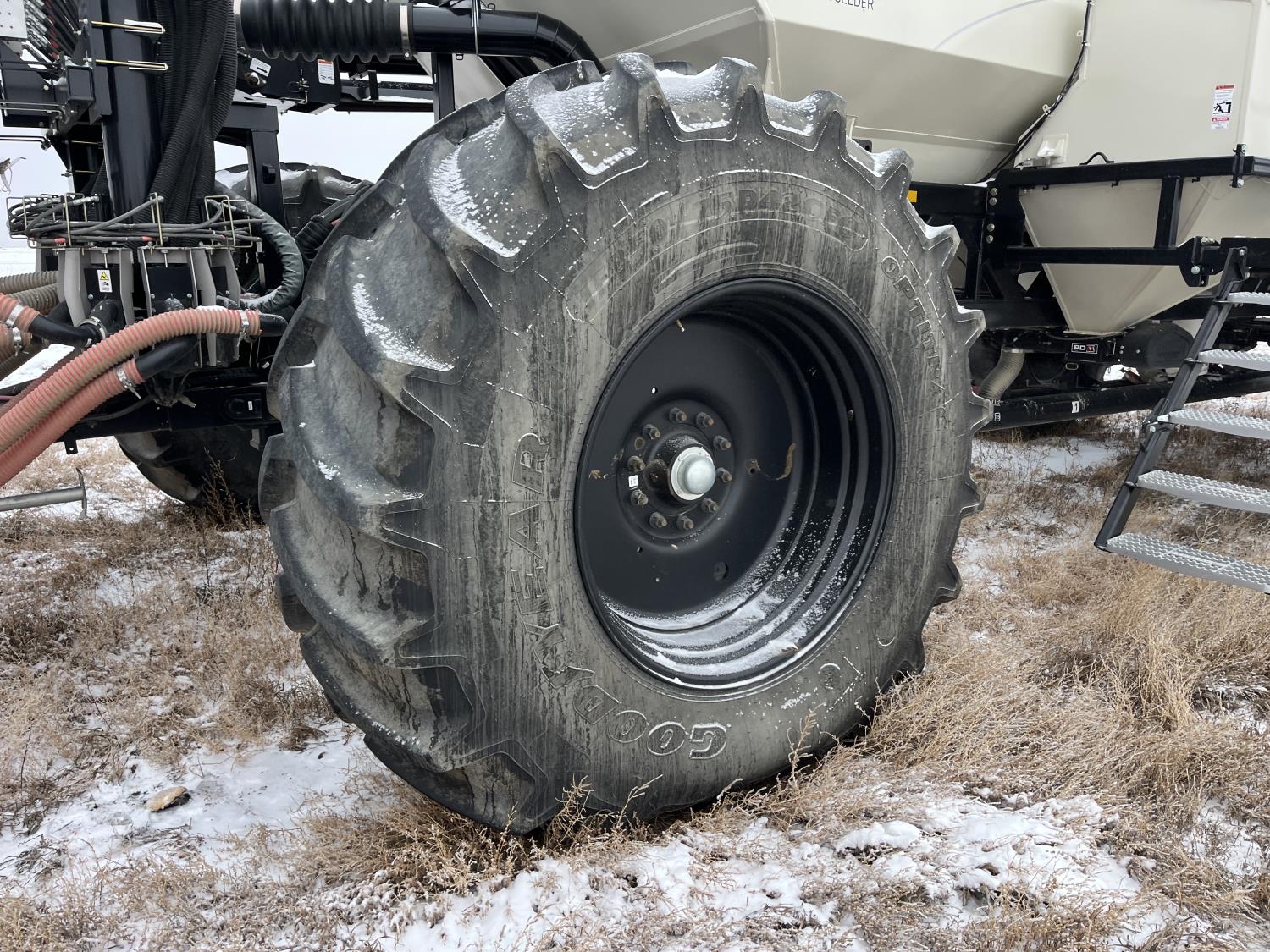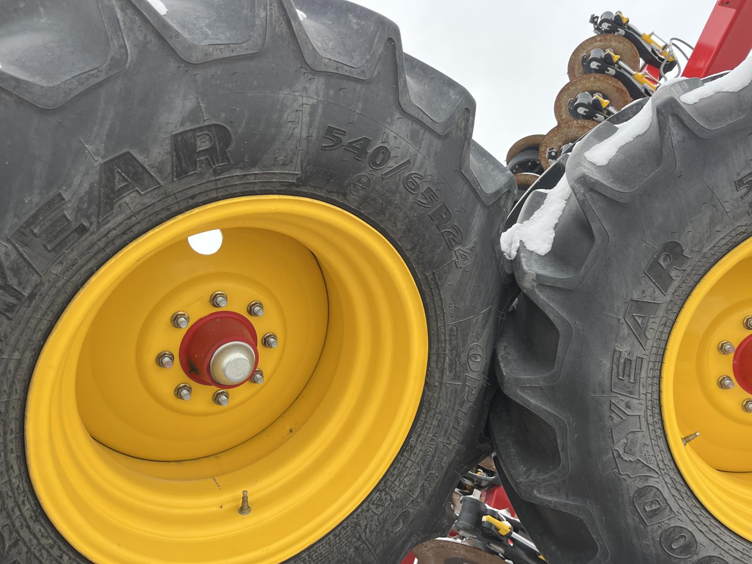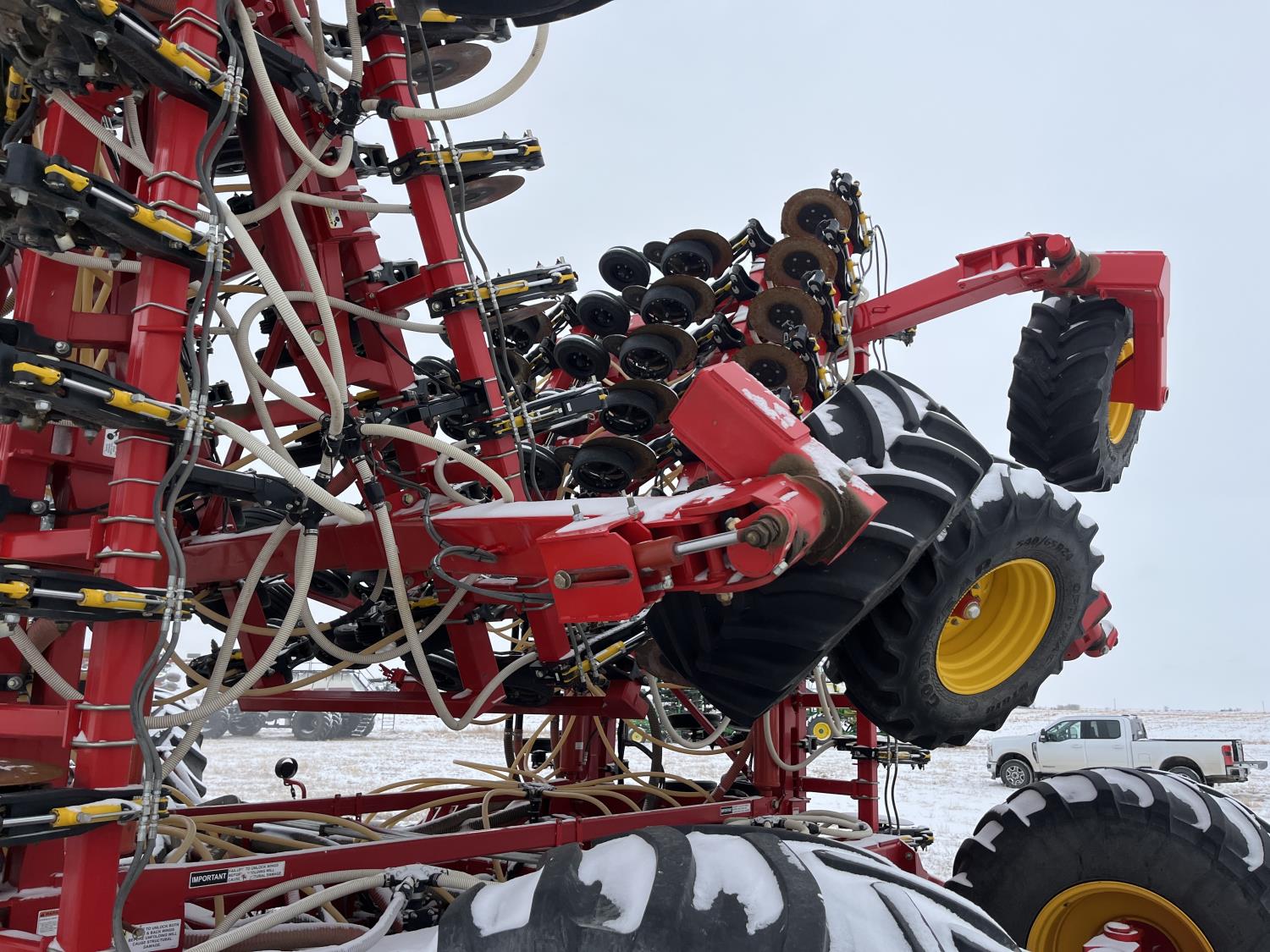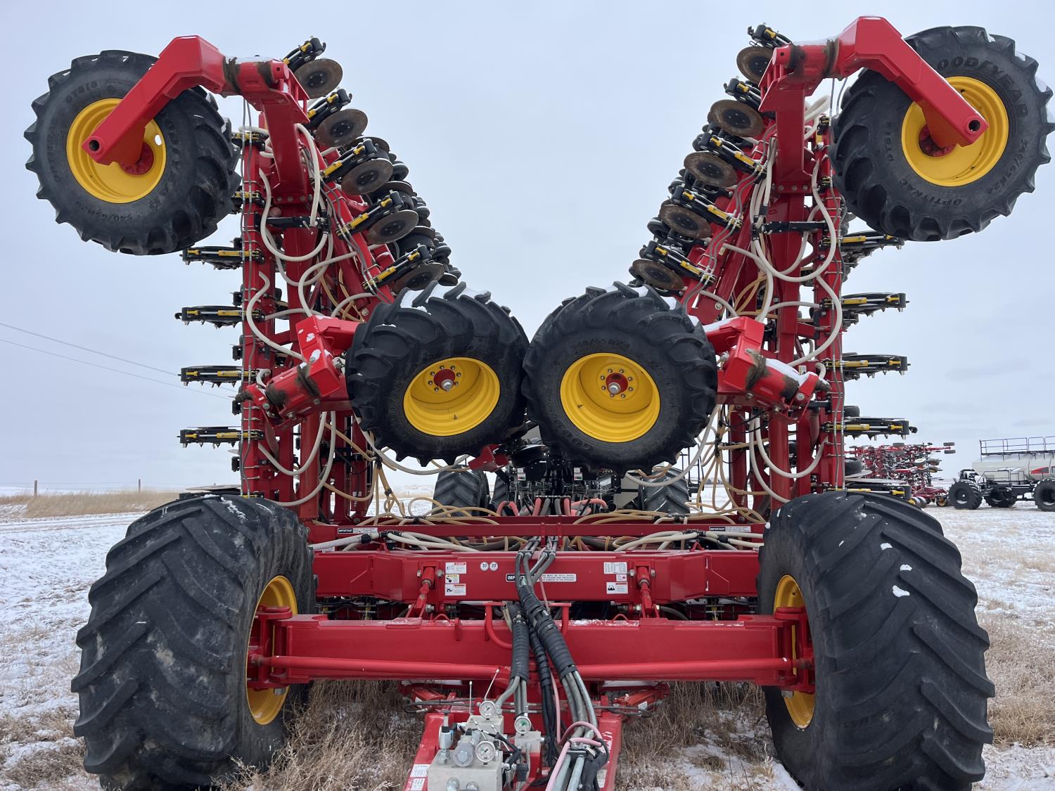 10 inch spacing, double shoot, single row openers, mid row banding, 4.5 inch rubber packers, seed monitor, blockage sensors, TopCon X35 monitor, 5 tank metering with scales, saddle tank, tank cameras, Air Cart: 5 compartments, 15 inch loading conveyor, double fan, variable rate metering, sectional control, TNK 1 : 465 bushel, TNK 2 : 165 bushel, TNK 3 : 100 bushel, TNK 4 : 220 bushel, TNK 5 : 44 bushel, saddle tank, high float, MRB III, TopCon Apollo blockage, high capacity fan, wide gauge wheels, pack master plus lift master, approximately 15,000 acres seeded , 850/75R42 front tires, dual 850/75R42 rear tires