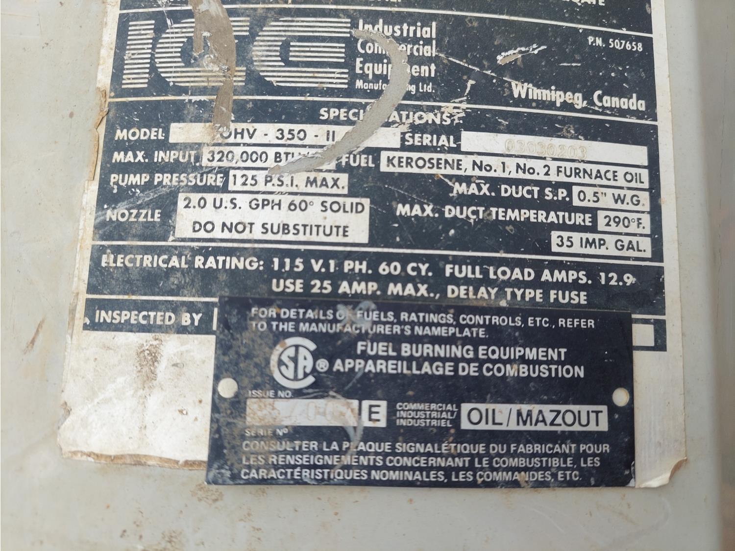 1528 ICE OHV-350 320,000 BTU Frost Fighter Heater (Inoperable)