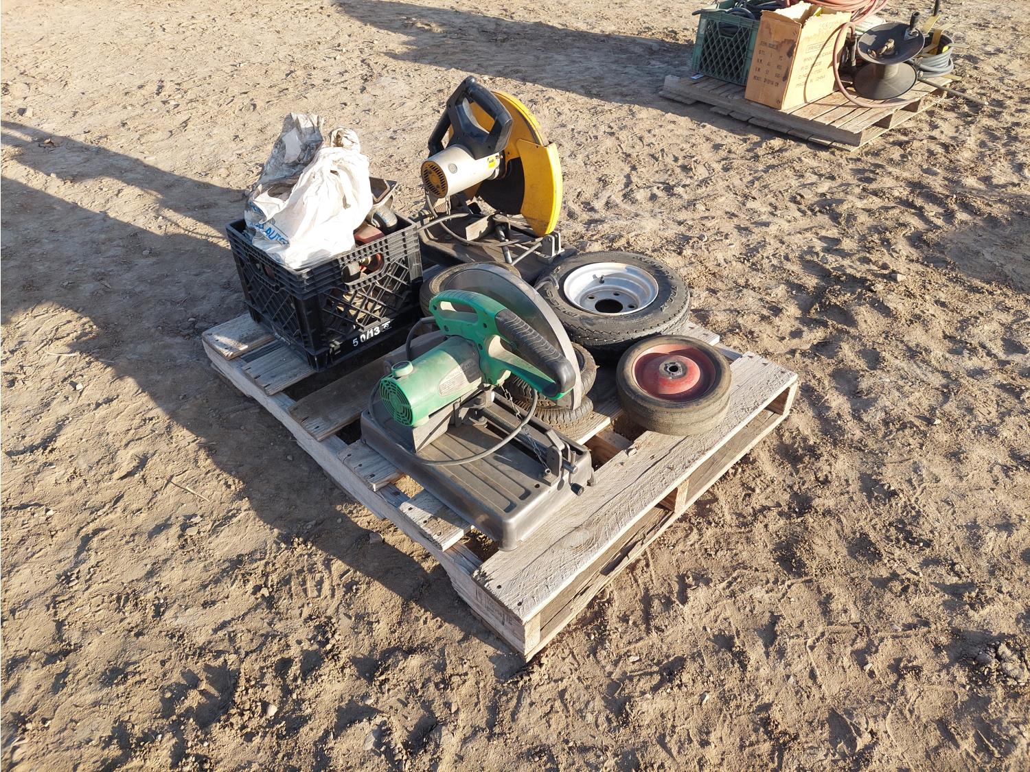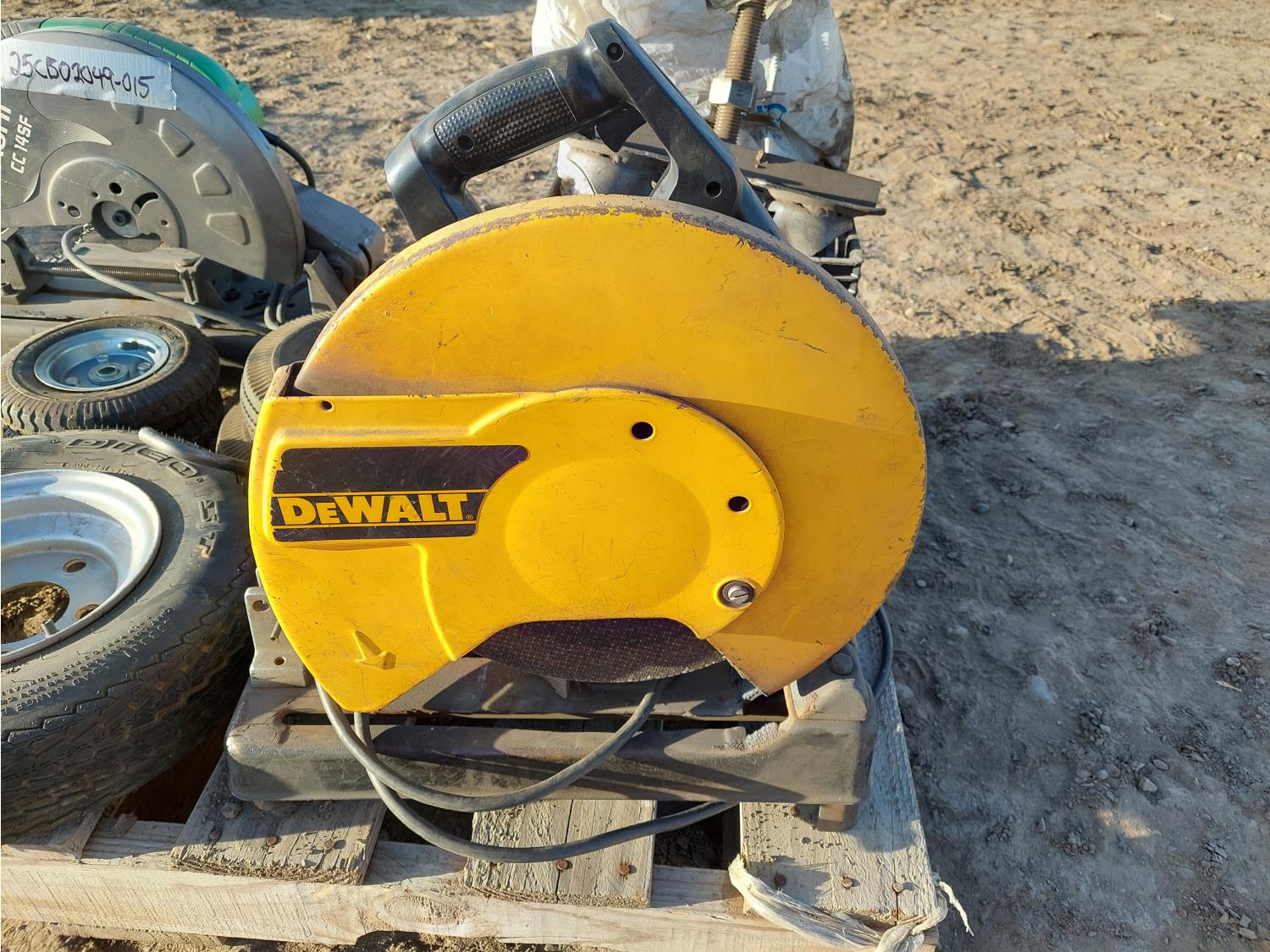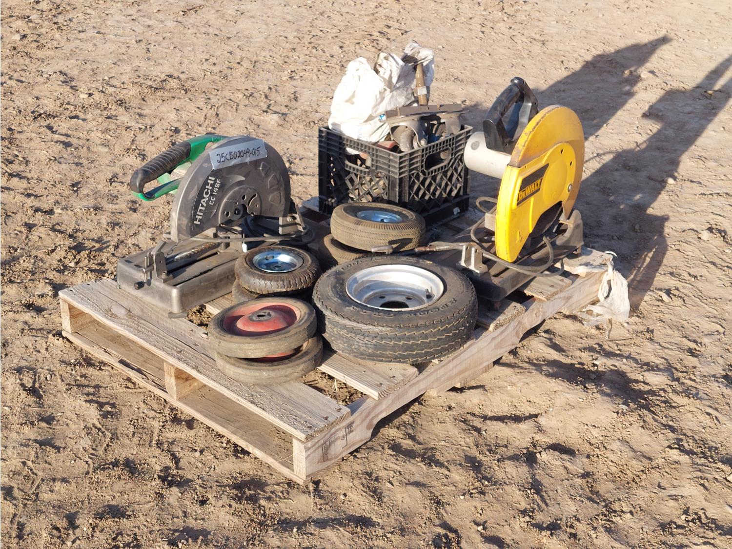 Dewalt DW870, serial number 38475, 120V, 14 Inch blade, 15A. HITACHI CC14SF, serial number C700436 120V. miscellaneous. tires