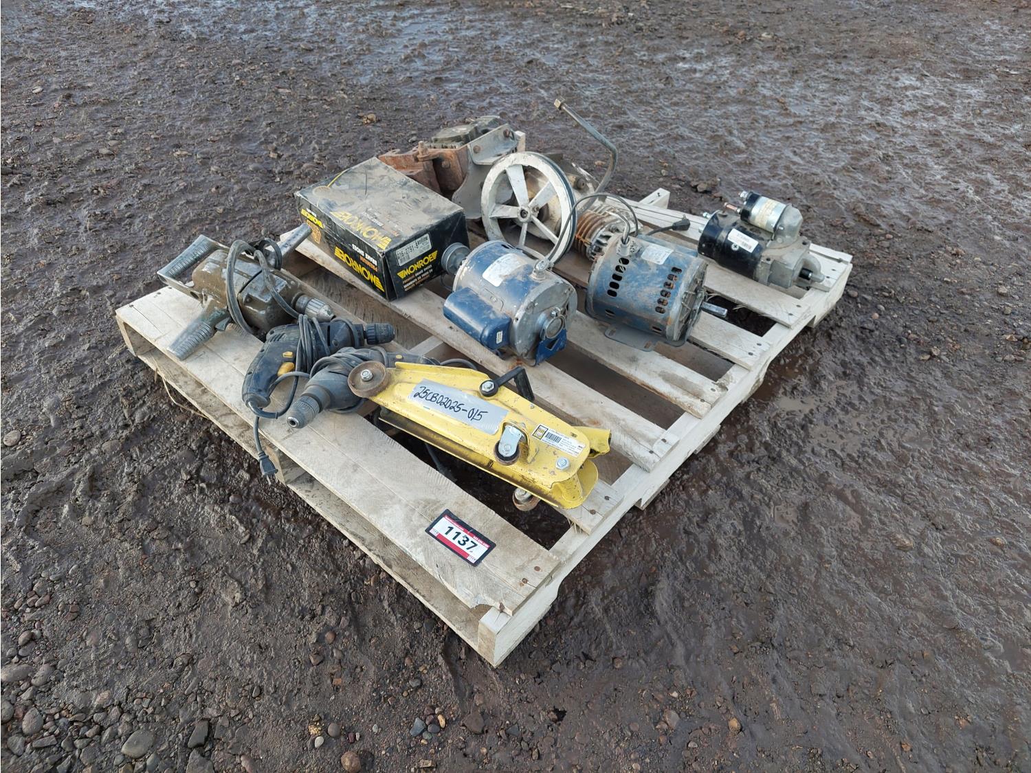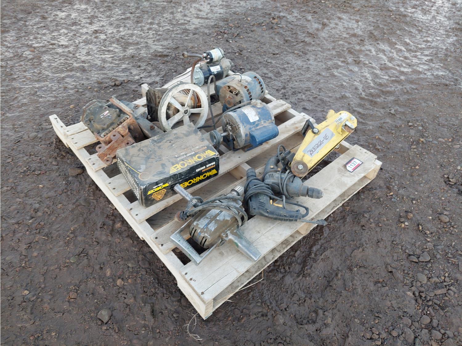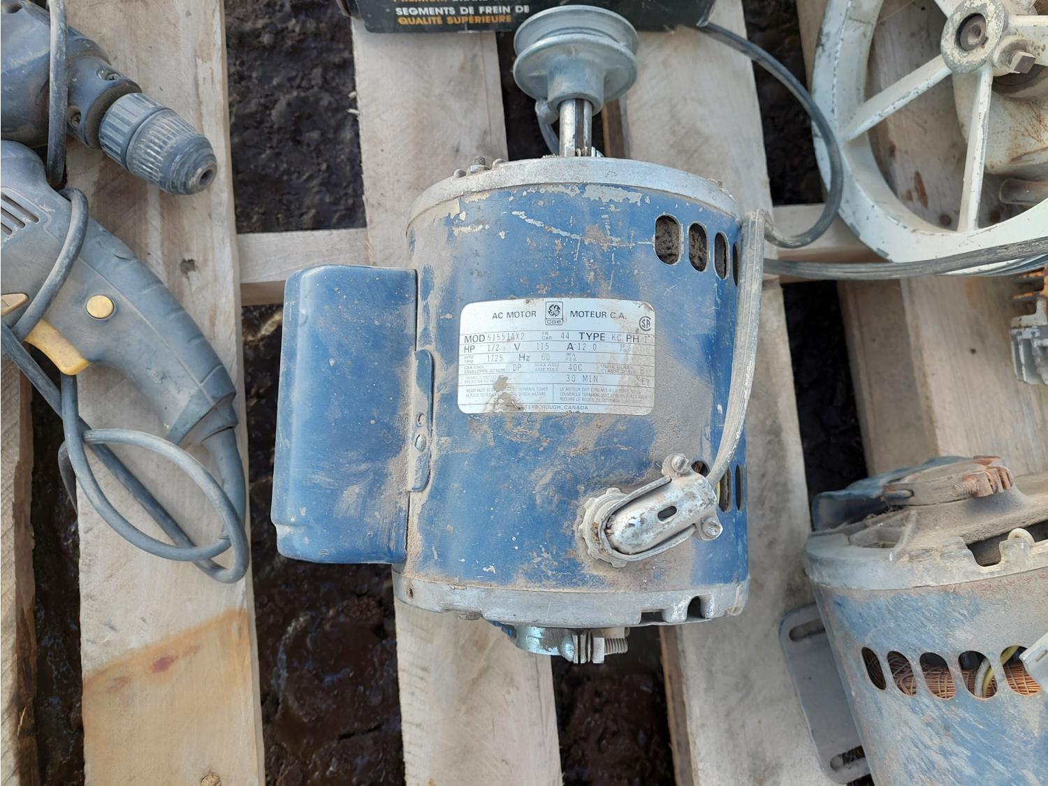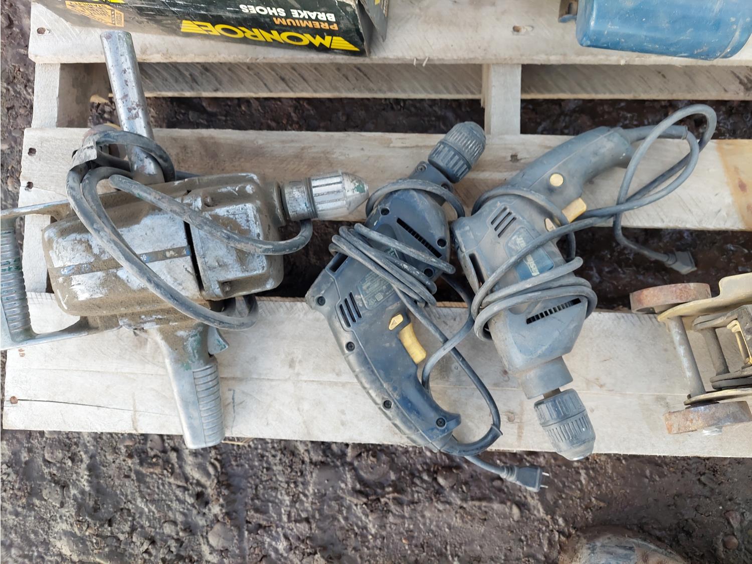 (2) GE 1/2 HP 115V motors, (3) corded drills, (1) 3733MS starter, (1) Power Fist 2 ton floor jack, (1) box Monroe brake pads