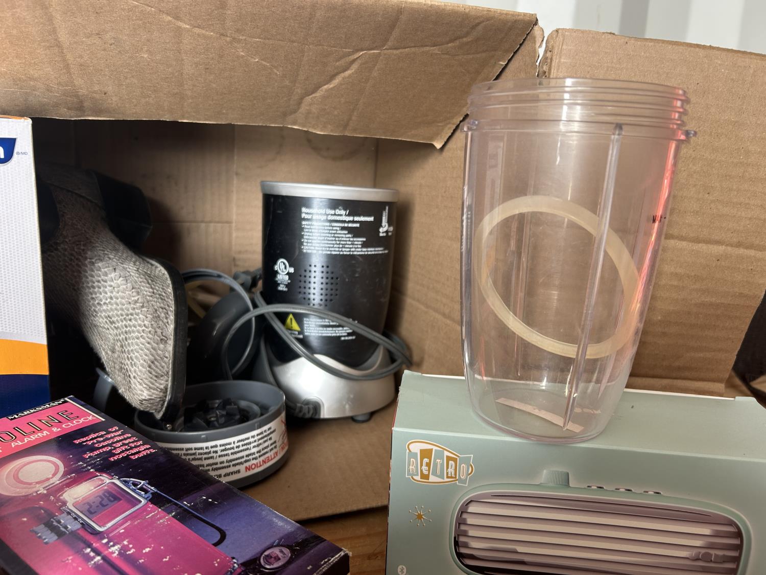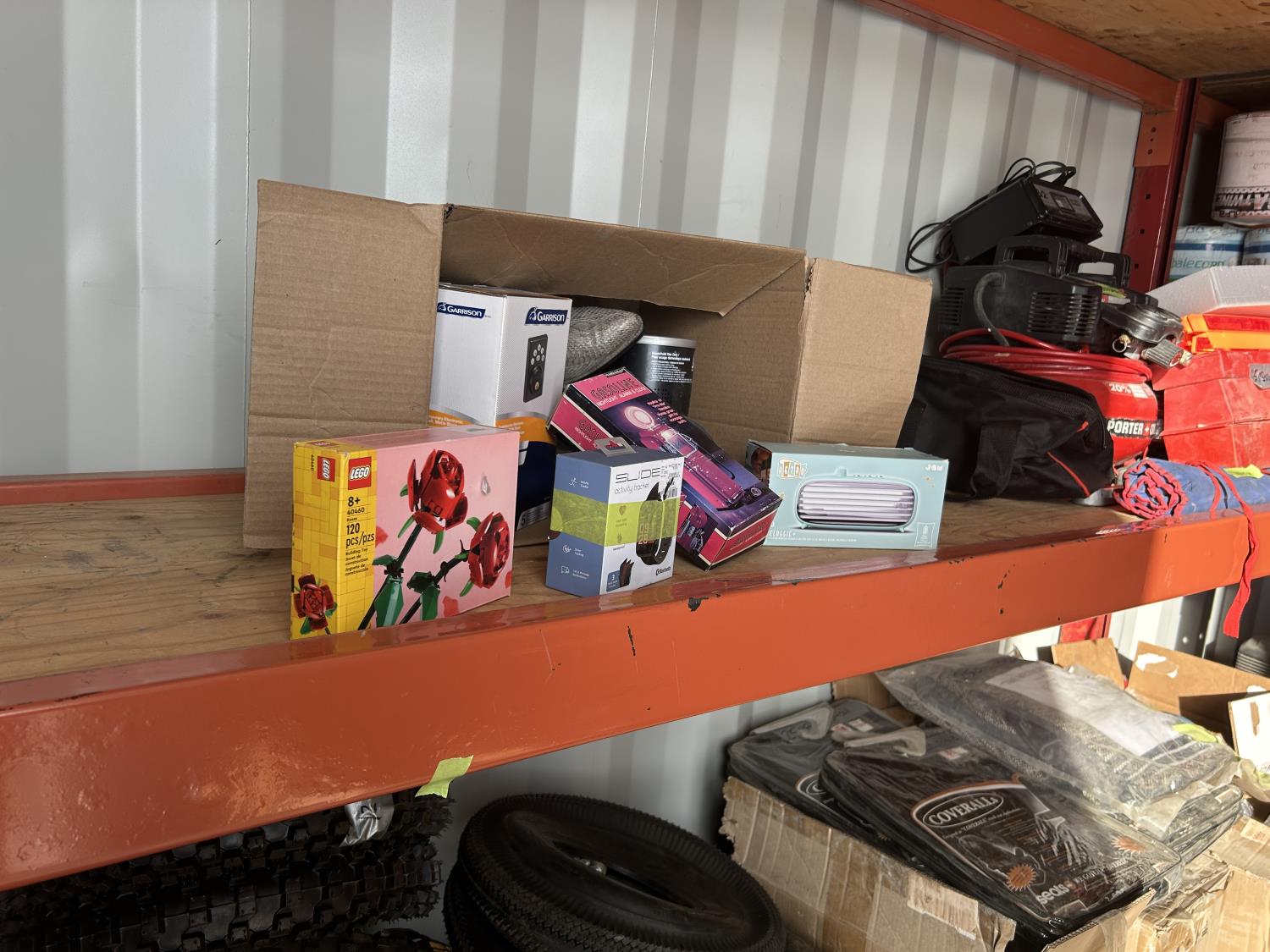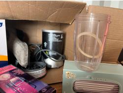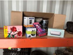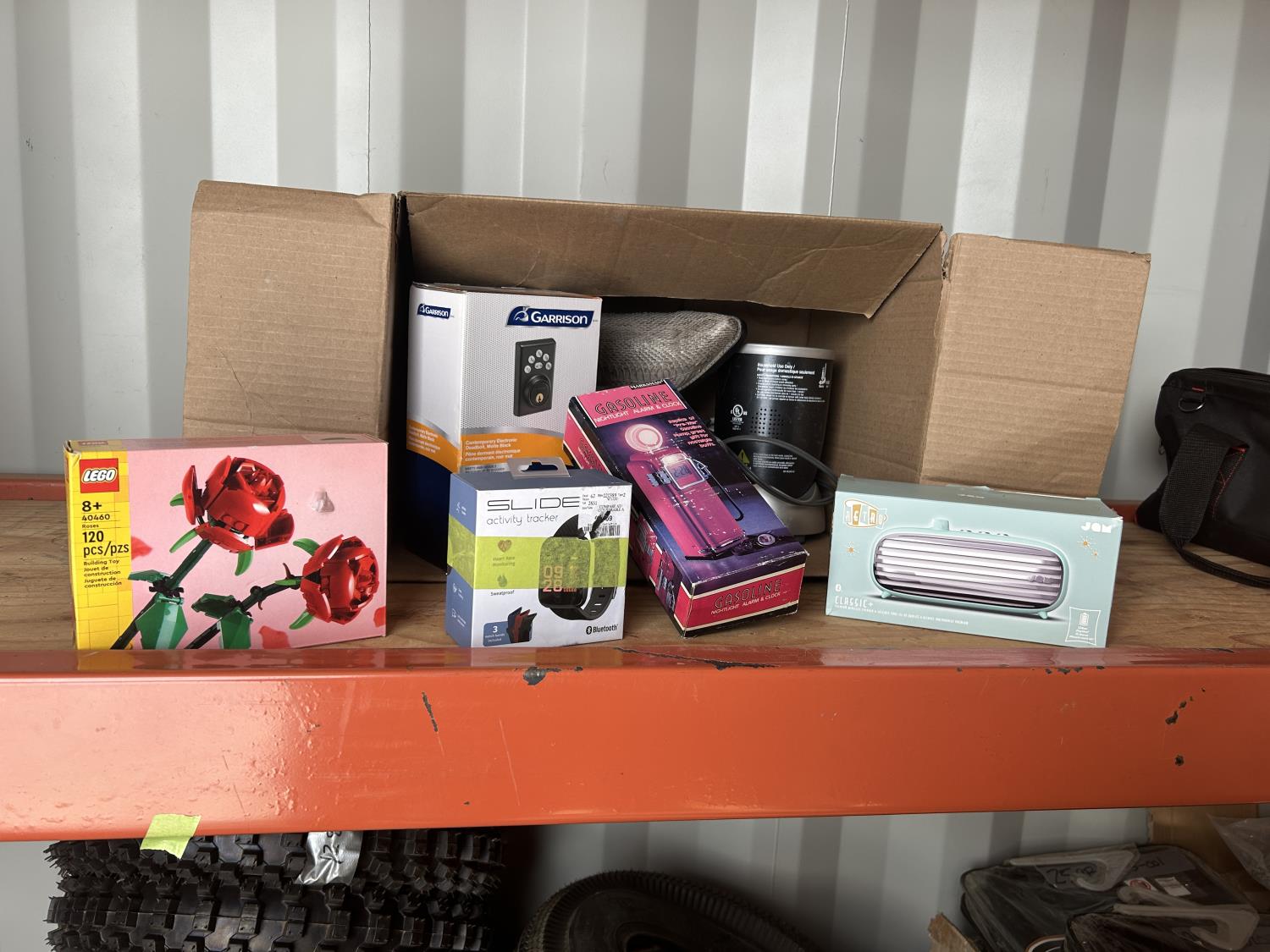 Includes electric door lock, nutri bullet w/ blade and two cups, bluetooth speaker, alarm clock, smart watch, flower lego