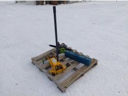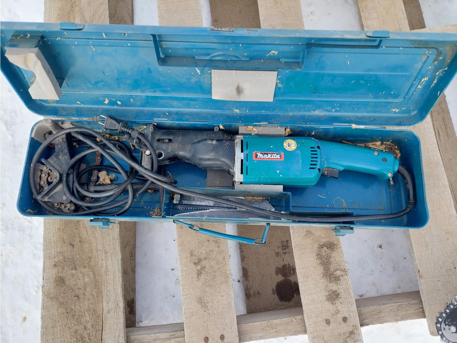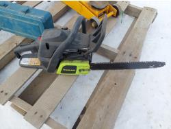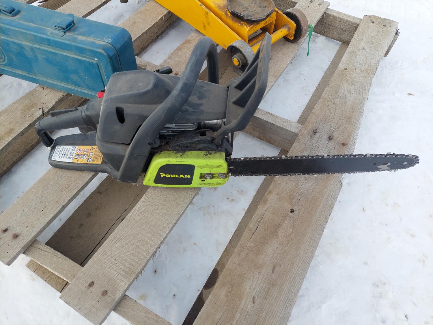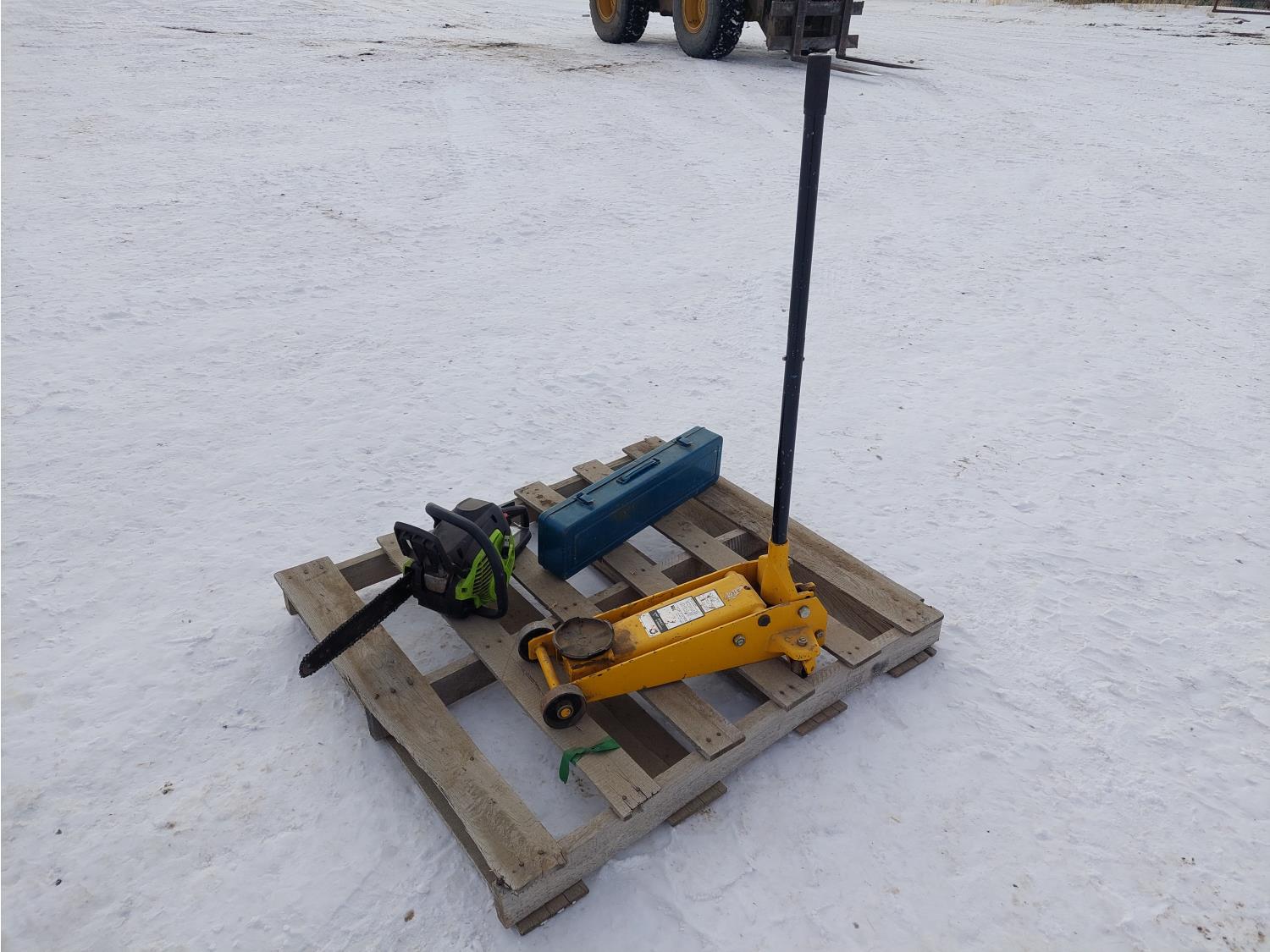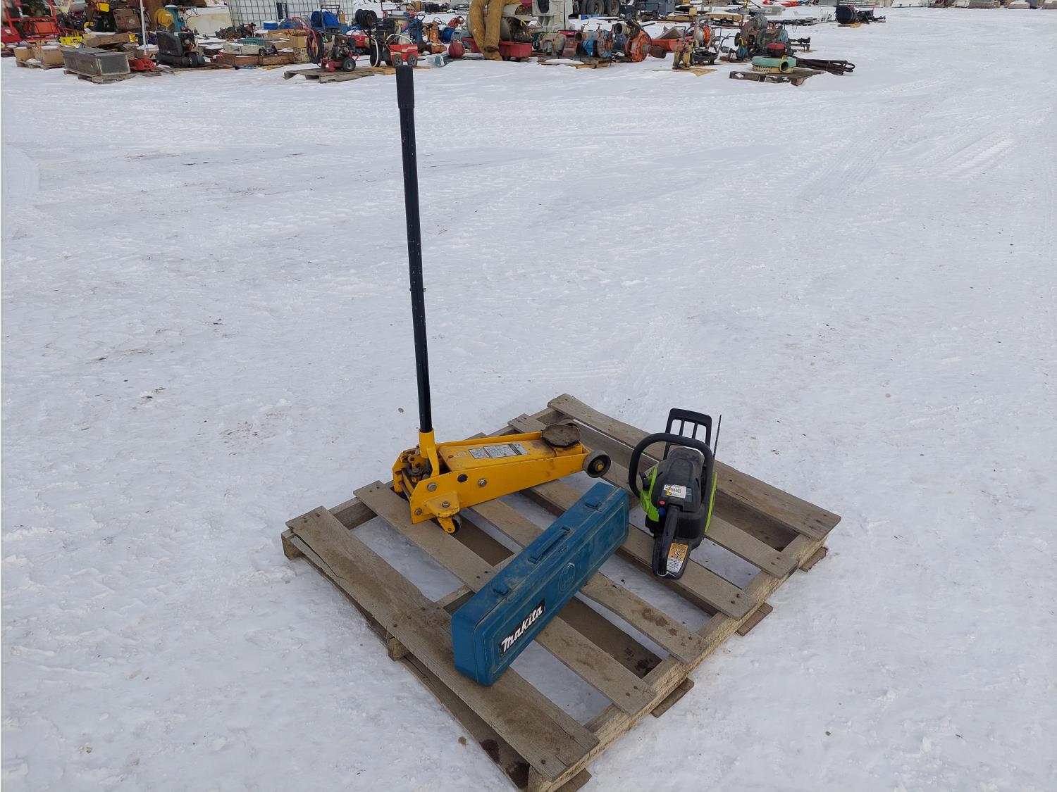 (1) Wilmar 2.5 ton rolling hydraulic jack, (1) corded Mikita reciprocating saw, (1) Poulin PL3314 gas powered chainsaw