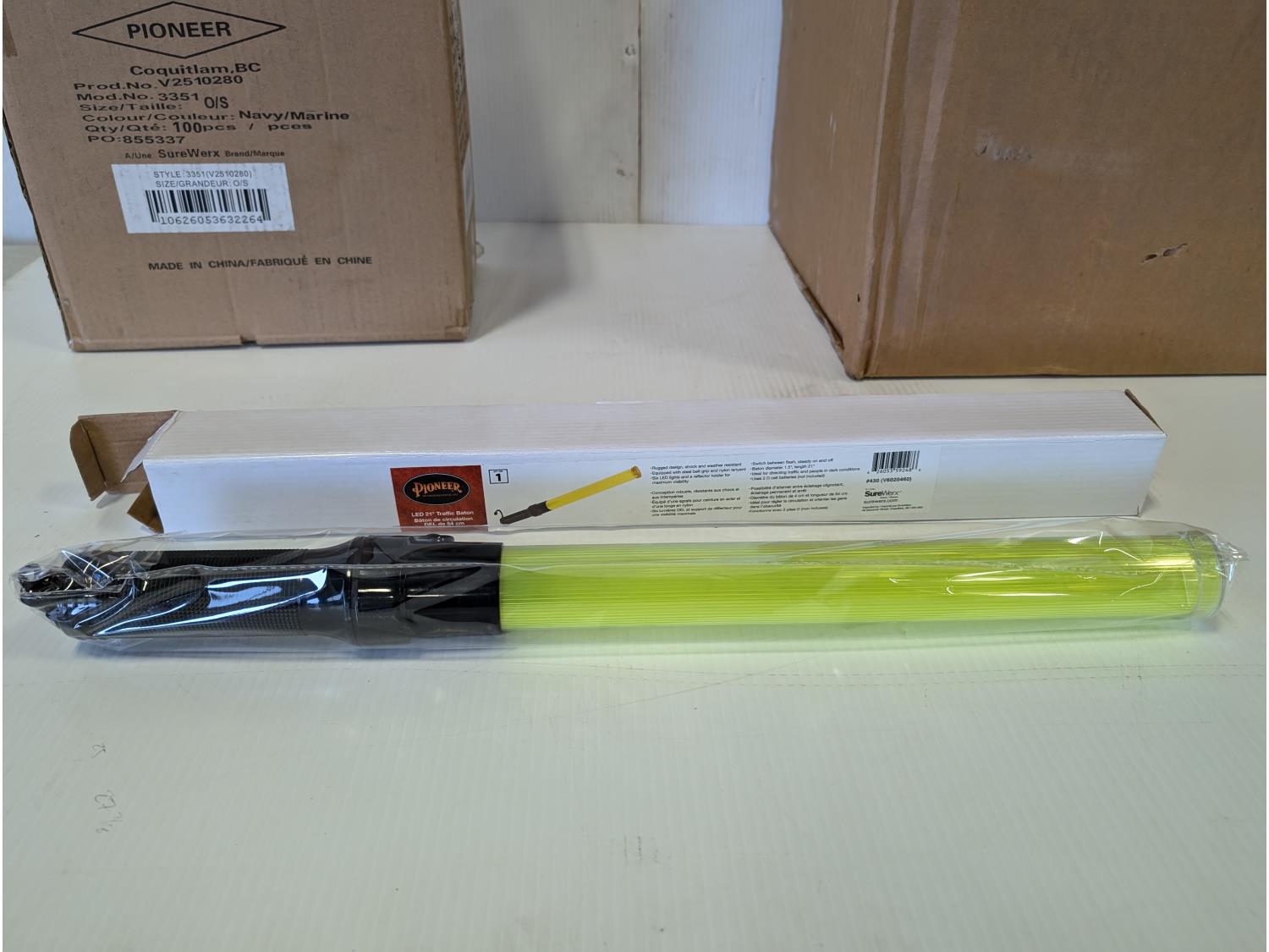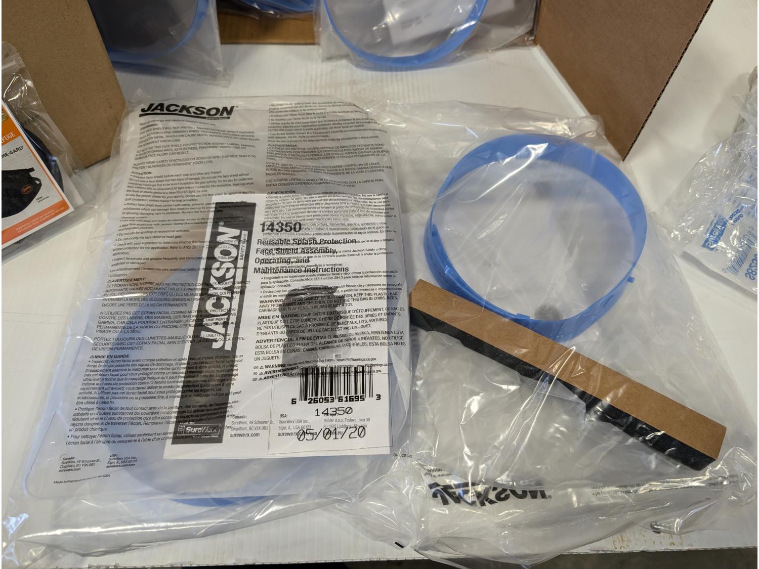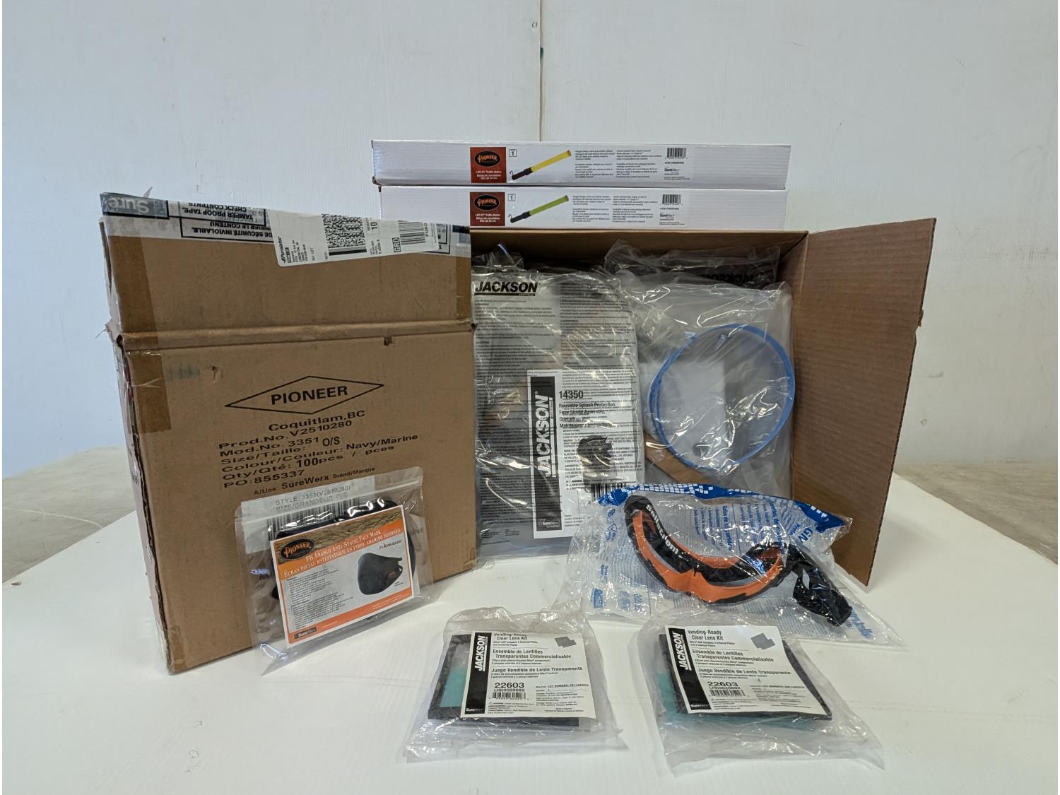qty of face masks, splash protection face shield assemblies, Sellstrom protective googles, jackson clear lens kits, (2) 21 inch LED traffic batons