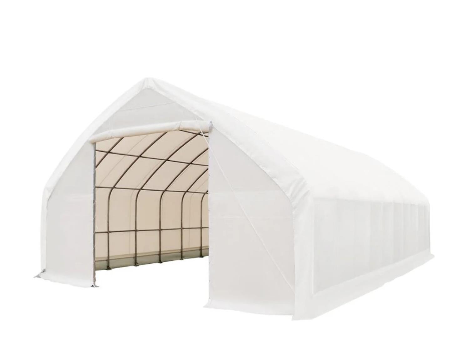collar beams added on end trusses, dirt skirt, roll-up doors, commercial 3-layer galvanized steel frame structure, commercial triple layer ripstop polyethylene tarpaulin cover.
