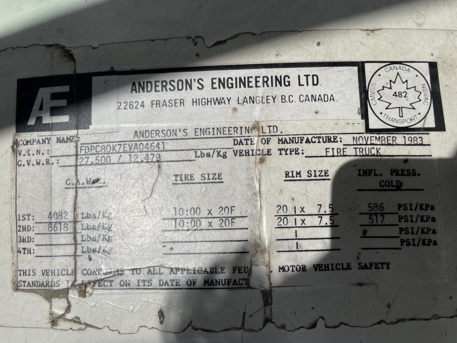Ford Gasoline engine, Ford AT-540 automatic transmission, radio, beacons, Anderson hydraulic pump, Pumper style , 10.00X20.00 front tires, 10.00X20.00 rear tires