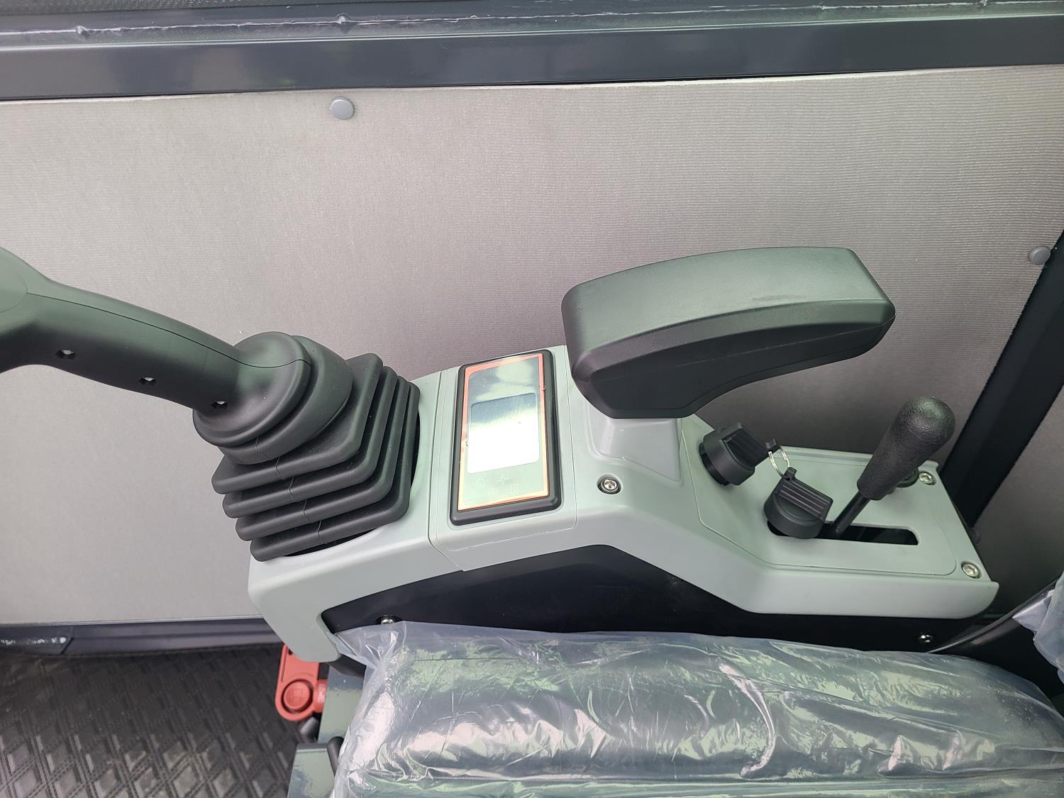 Enclosed cab, pilot controls, RATO gas engine, 16 inch dig bucket, hydraulic thumb, 1 auxiliary hydraulics, swing boom, backfill blade, rubber tracks