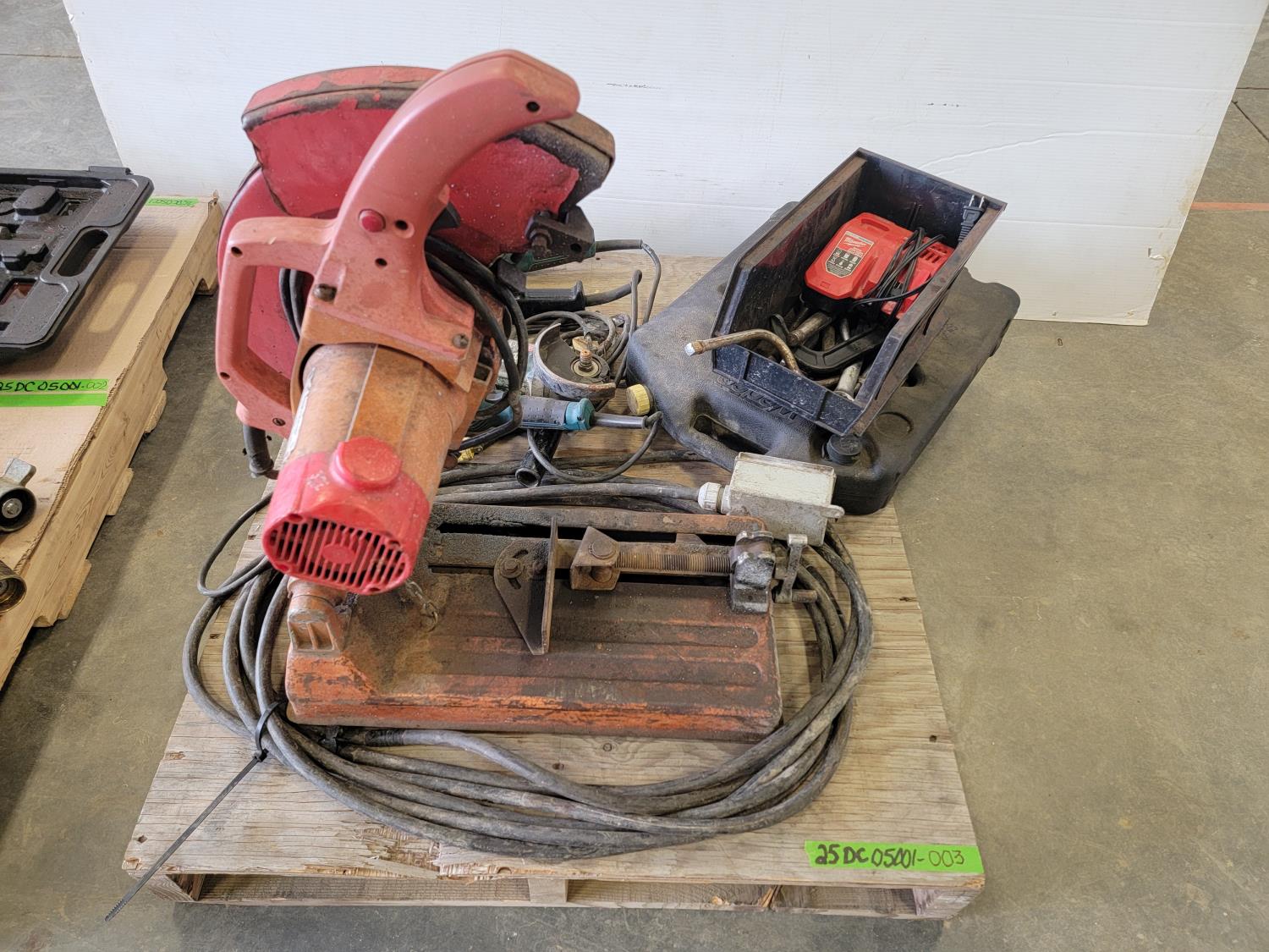 Chop saw, angle grinder, angle grinder for parts, assortment of hand tools, oil pan