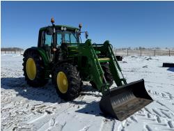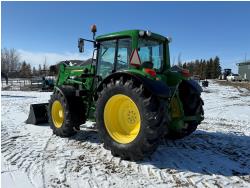 John Deere 633 loader, Q/A, 80 inch bucket, grill guard, 90 HP, diesel engine, 24 speed Auto Quad partial power shift transmission, 50 Km top speed, cab, joystick, A/C, radio, air ride seat, buddy seat, 540/1000 PTO, 3 point hitch, 4 rear hydraulic outlets, 480/70R28 front tires, 580/70R38 rear tires