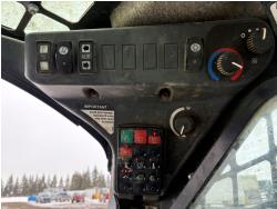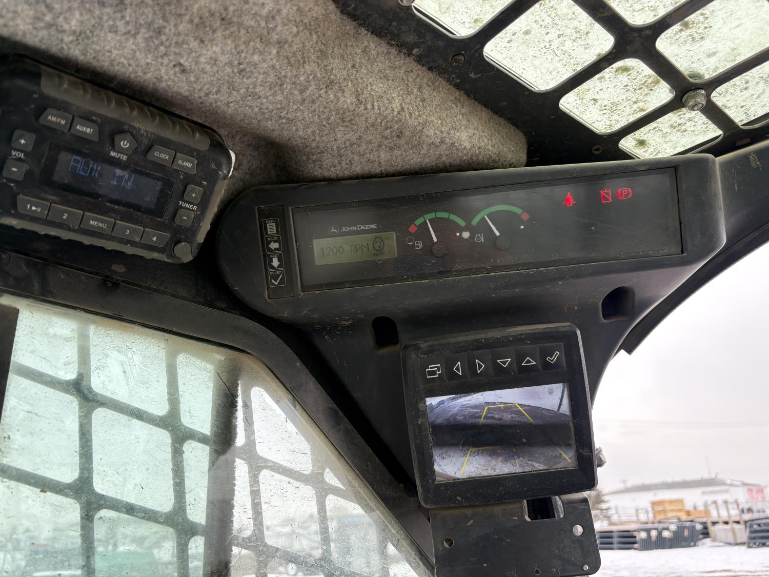 Enclosed cab, A/C, air ride seat, control pattern change, rear view cameras, diesel engine, 2 speed transmission, 72 inch toothed bucket, 1 auxiliary hydraulics, rubber tracks