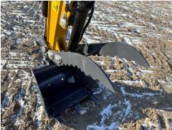 Open station, Rato gas engine, 14 inch dig bucket, hydraulic thumb, backfill blade, 7 inch rubber tracks