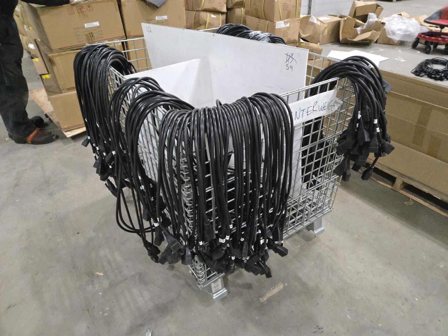 56 of 6 ft, 59 of 7 ft 100 of 3 ft, 54 of 5 ft, 6 of 11 ft all quantities are (±), c/w wire caged tote