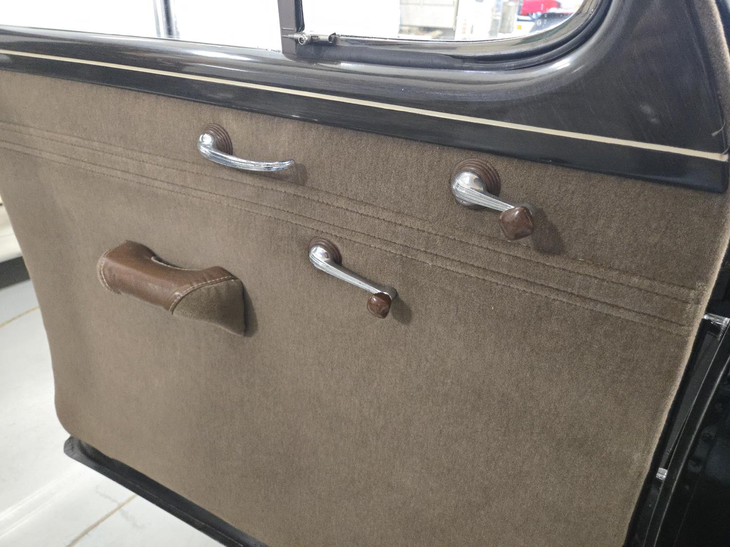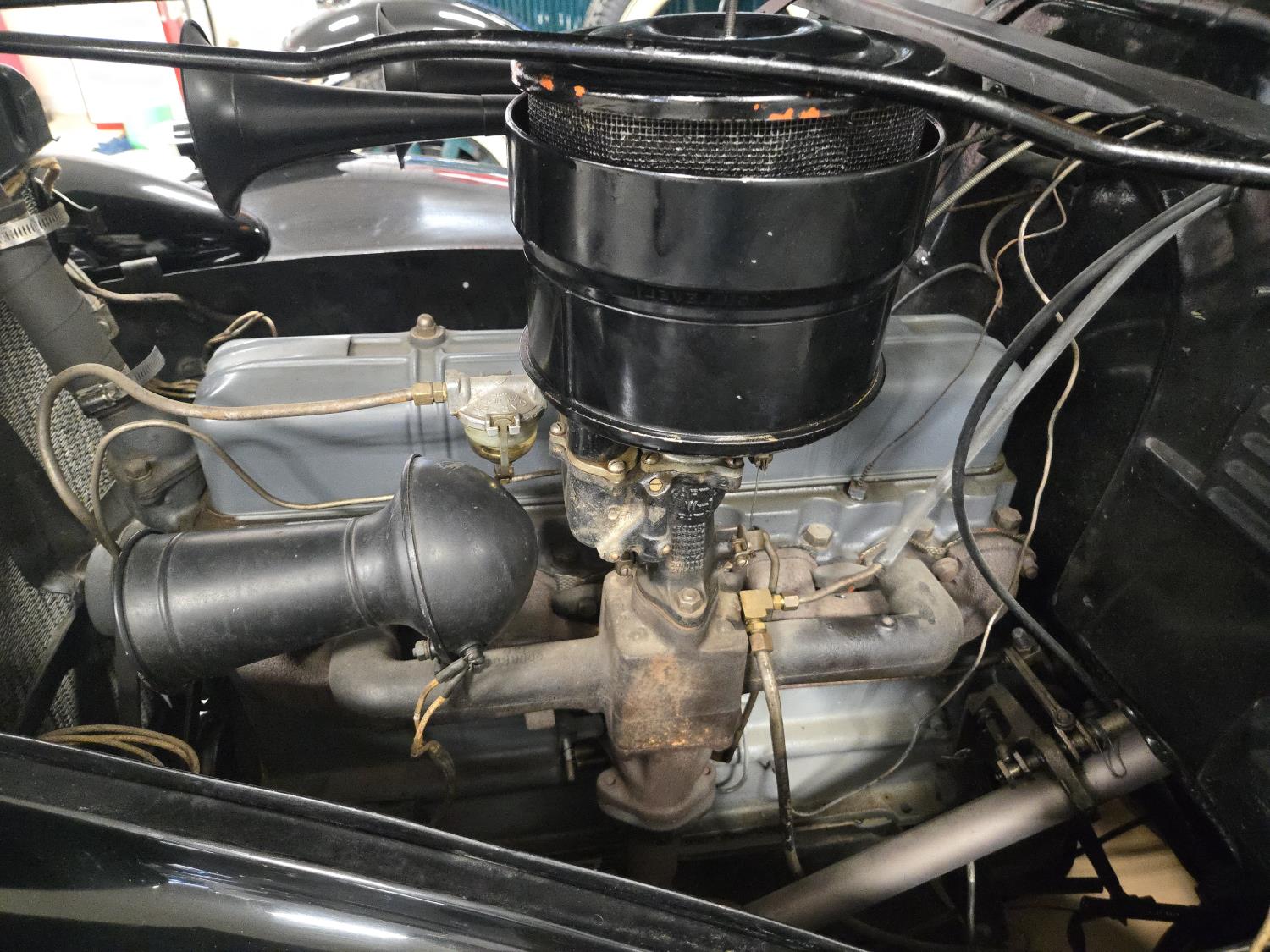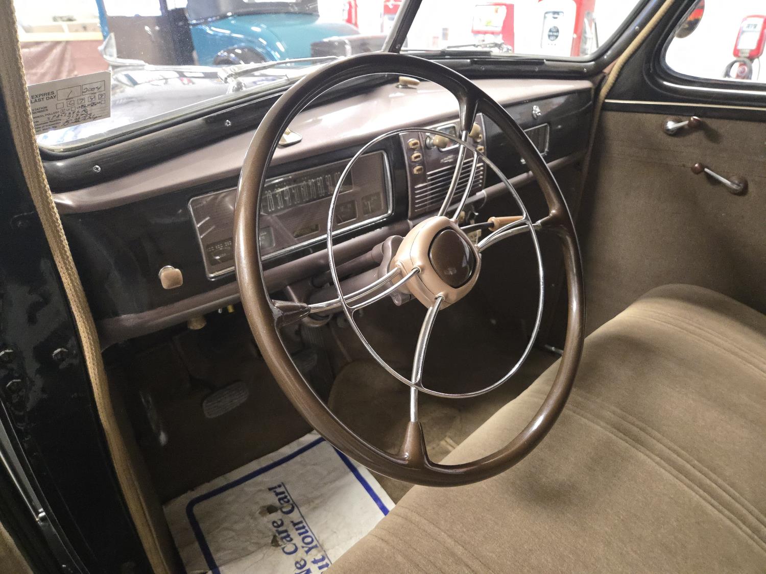 6 cylinder, 3 speed manual transmission, clock in glove box door, 6.00-16 wide white wall tires, total restoration looks like very nice