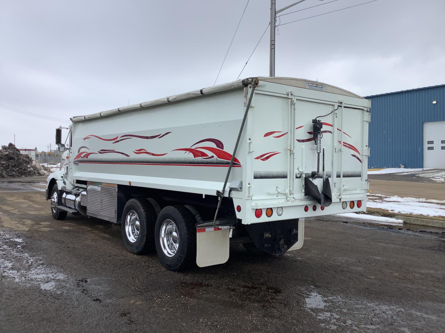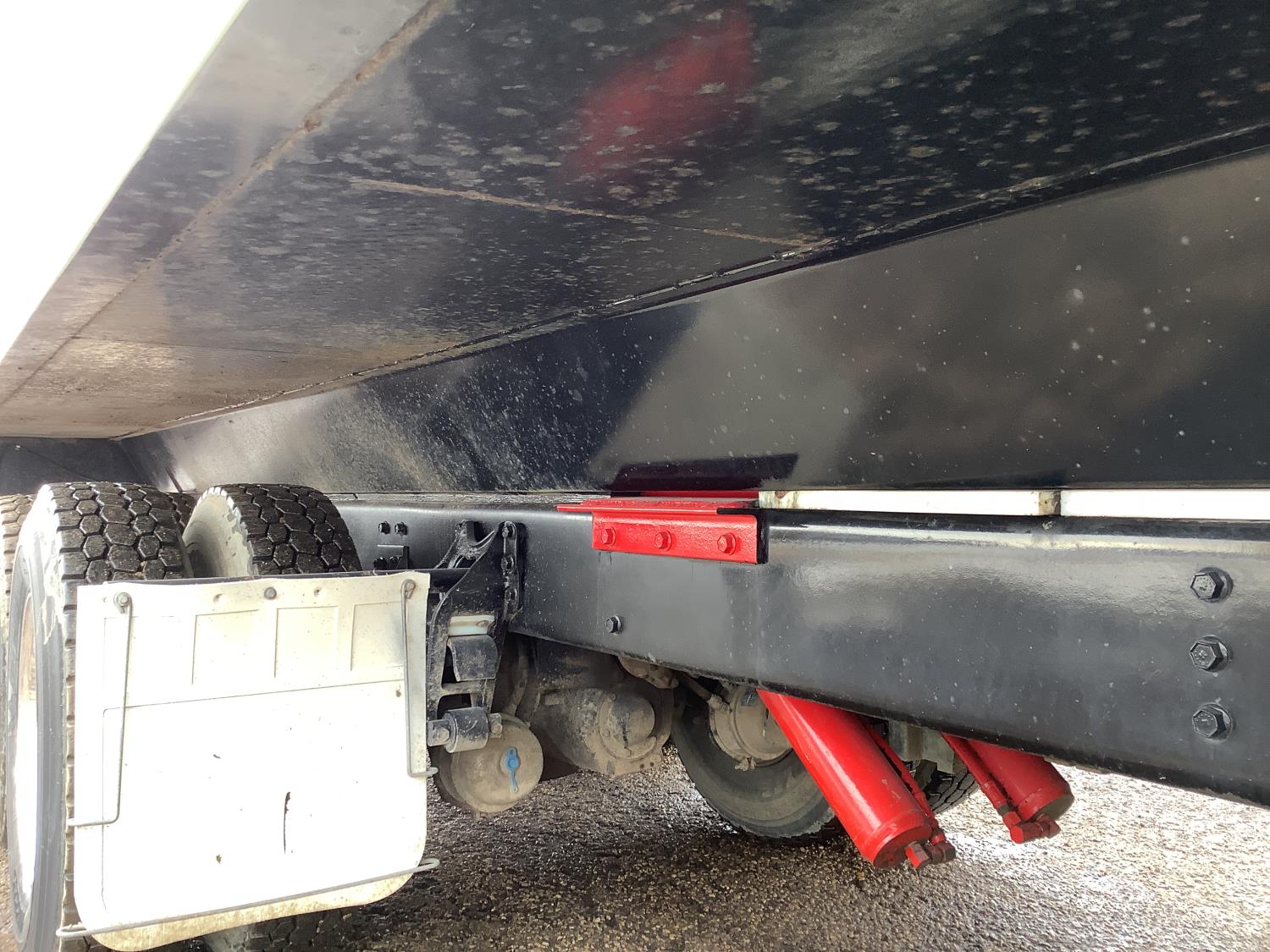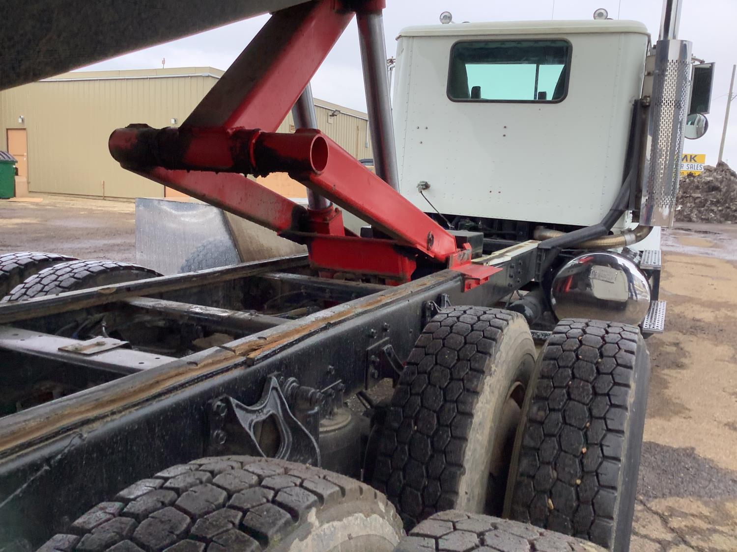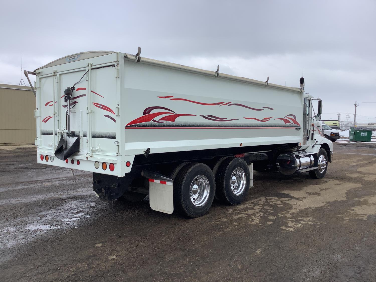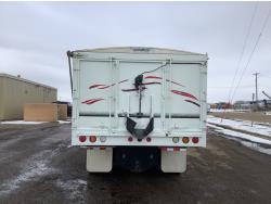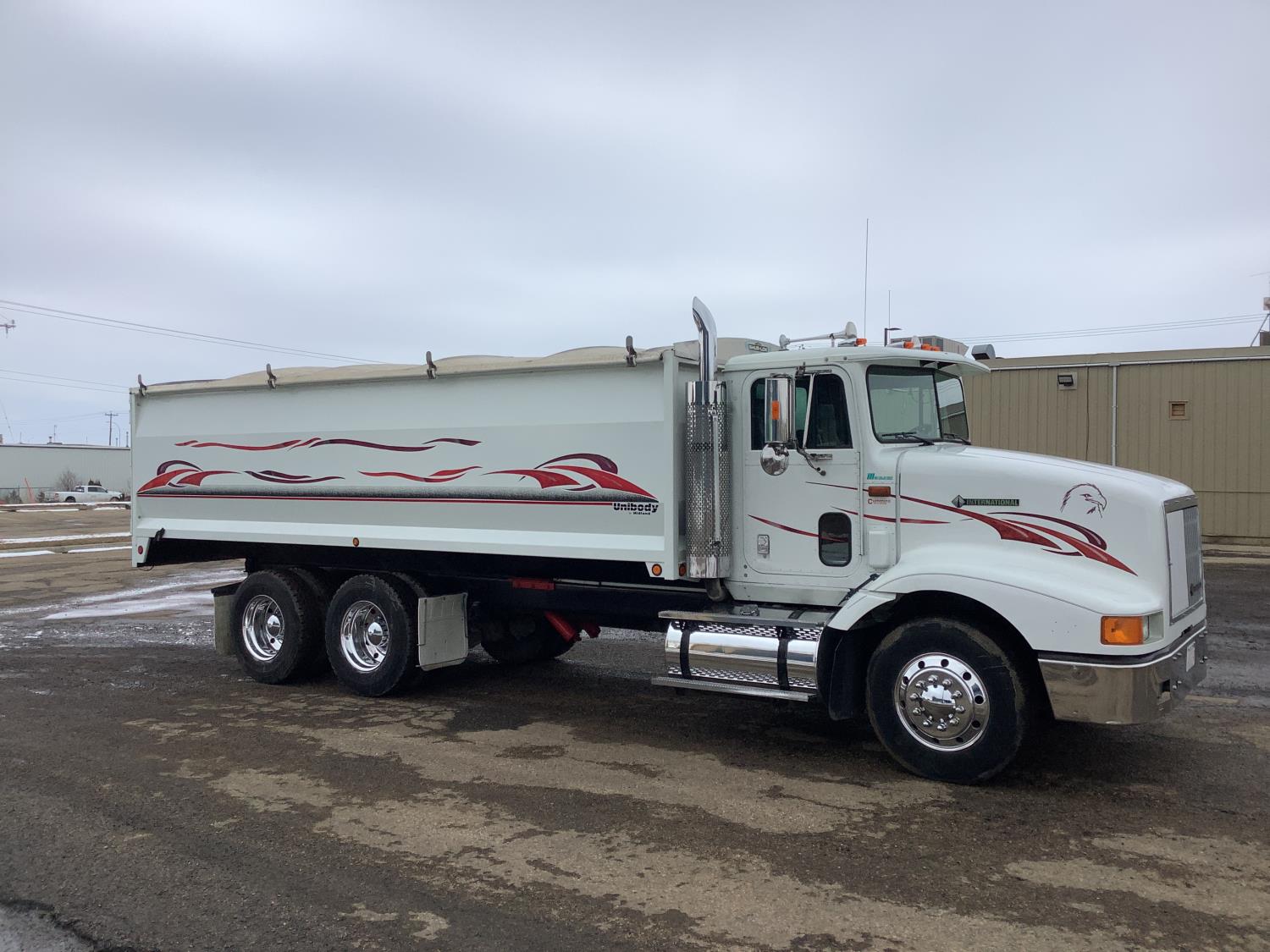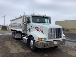 Cummins M11 6 cylinder 370 HP engine, engine brake, 10 speed manual transmission, A/C, cruise control, air ride driver seat, radio, Eagle interior package , air shift PTO, side mount tool box, 20 ft Midland Unibody grain box, roll tarp, Harsh hoist, 3 piece tailgate, wireless remote for hoist and rear tailgate chute, air brake control, pintle hitch, air ride suspension, 12,500 lb front axle, 40,000 lb rear axles, 3 way diff locks, all aluminum wheels, 11R22.5 tires