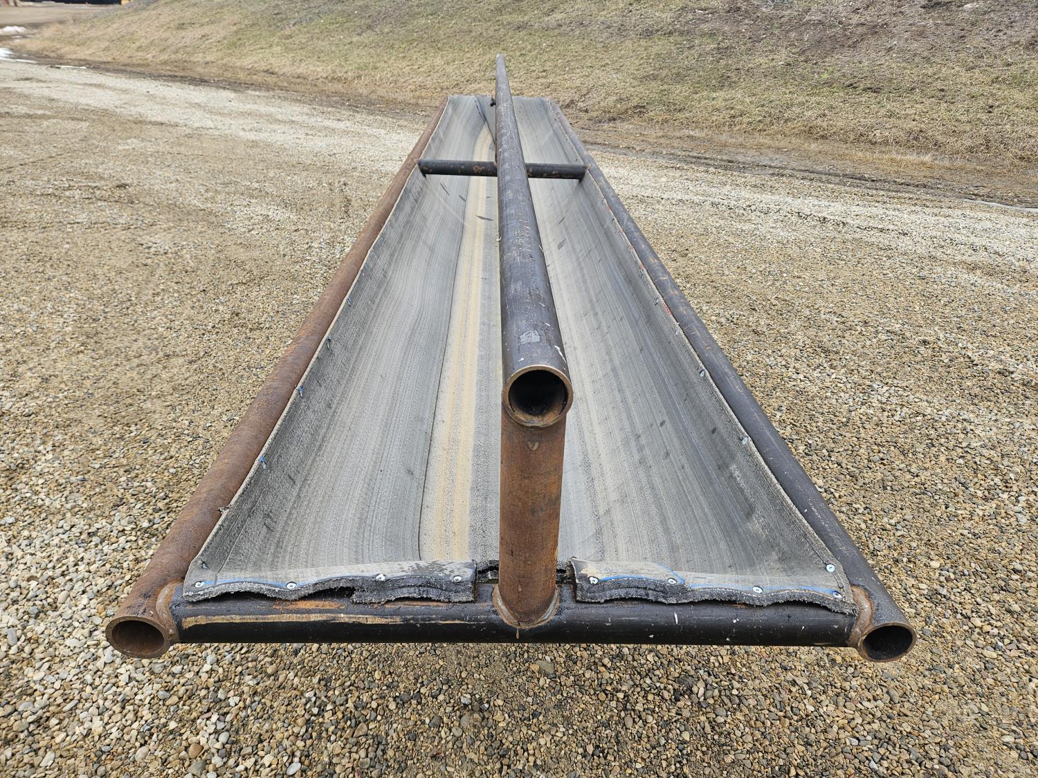 34 inch wide, 28" tall, 2-7/8 inch steel pipe construction, lift bar, conveyor belting interior