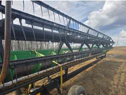 pickup reel, fore & aft, poly skid plates, full finger auger, single knife drive, Elmers transport, came off S670 combine