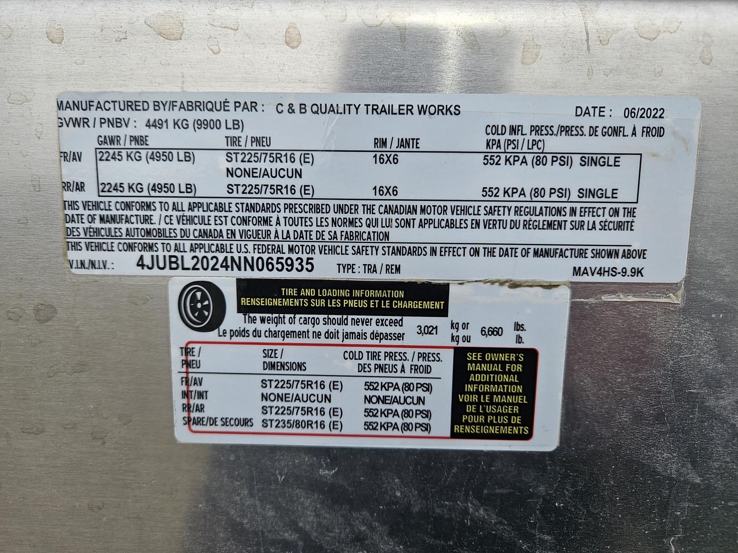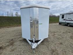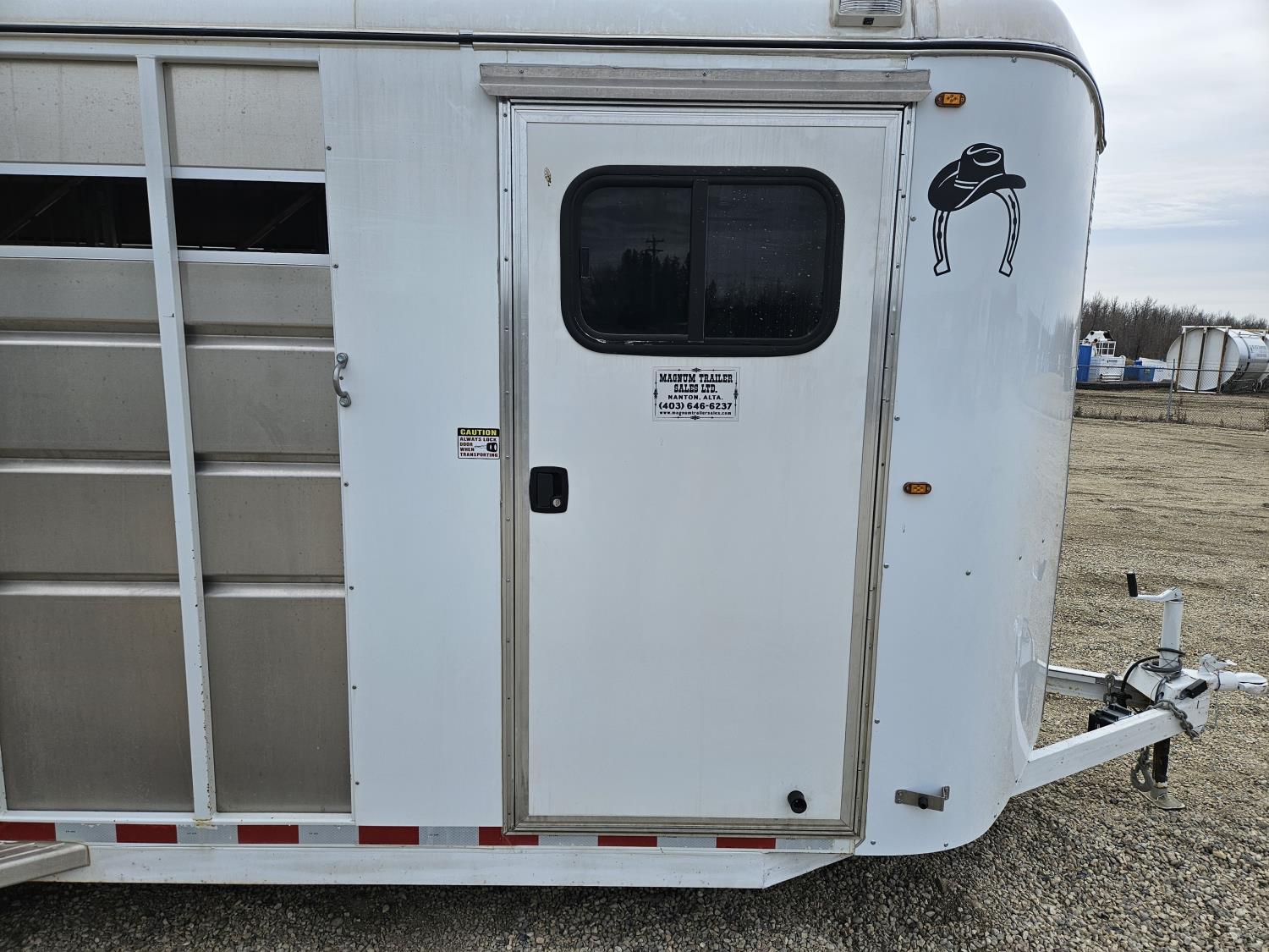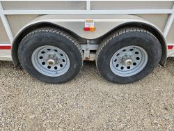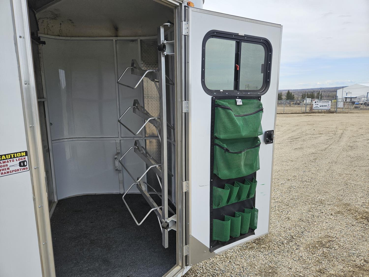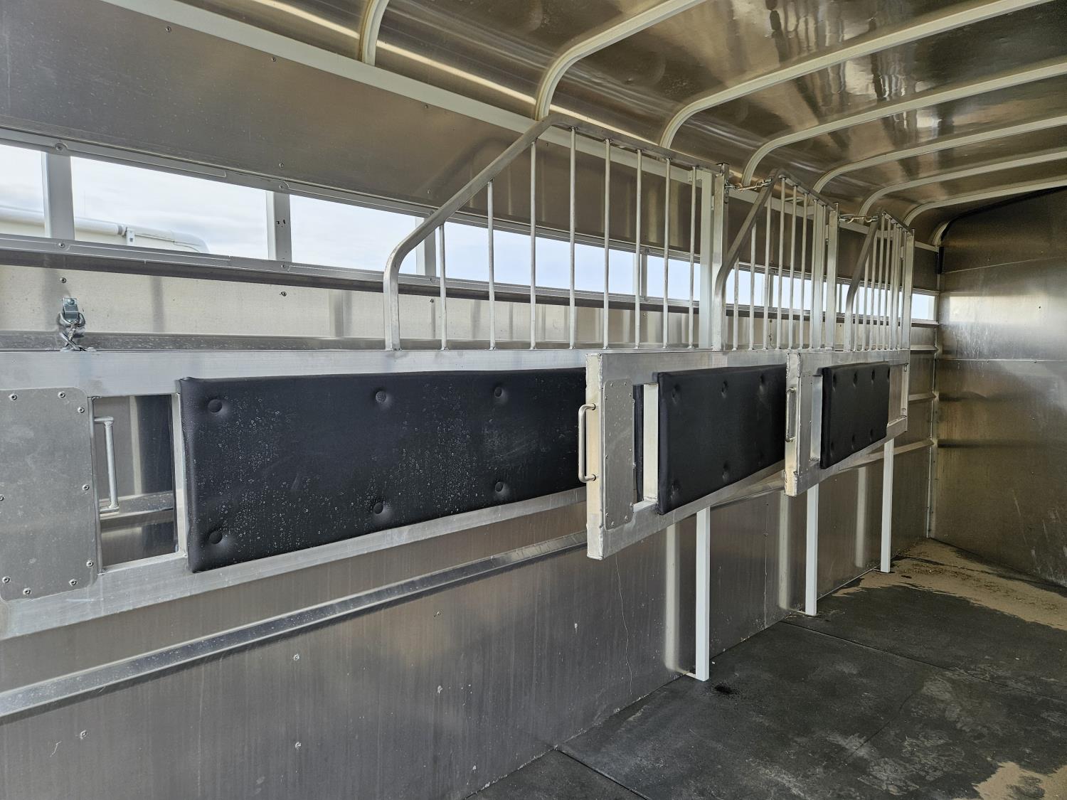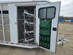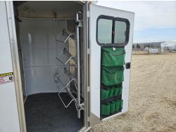3 padded dividers, 36 inch front tack room with saddle rack, 84 inch high, 83 inch wide, rear swing out door, 2-5/16 inch ball, 5000 lb axles, 225/75R16 tires