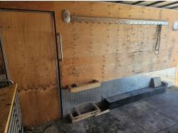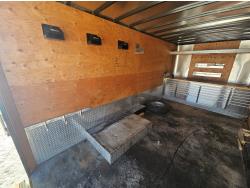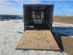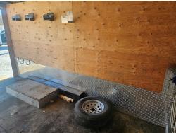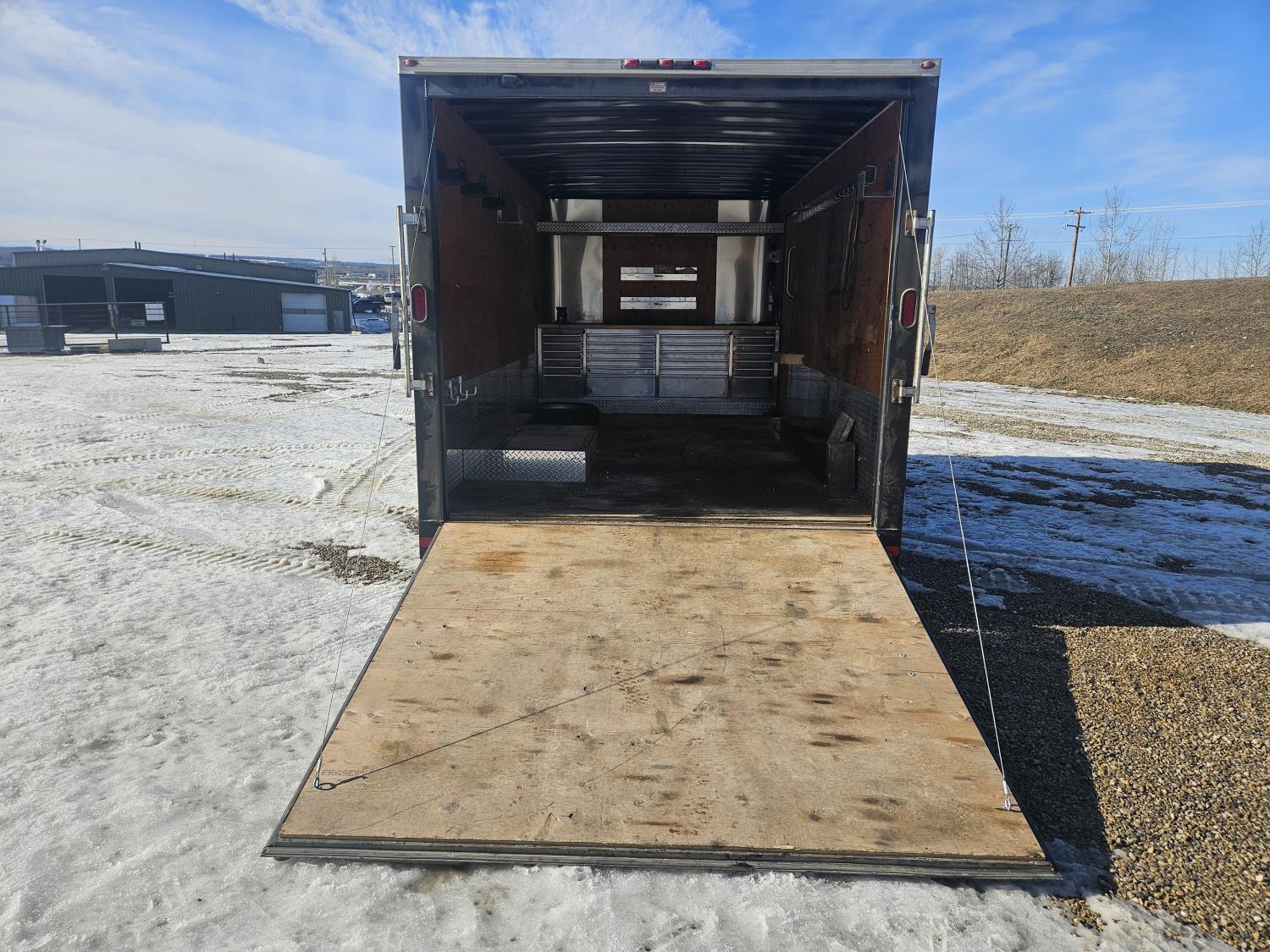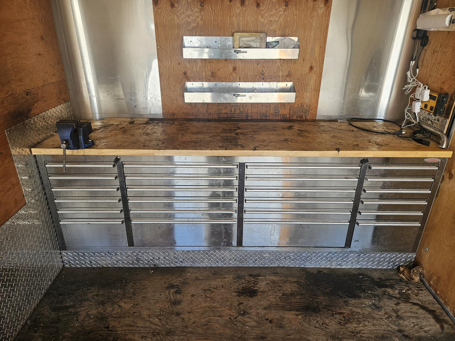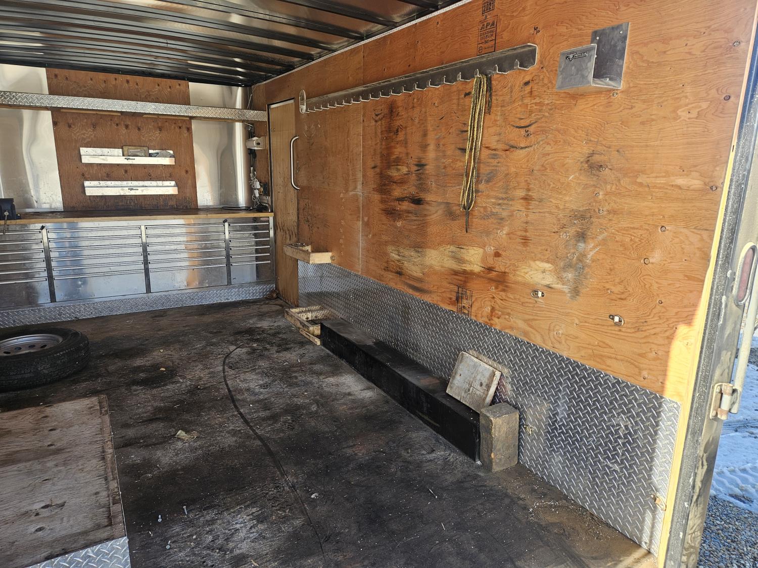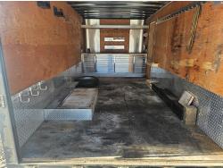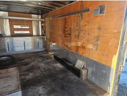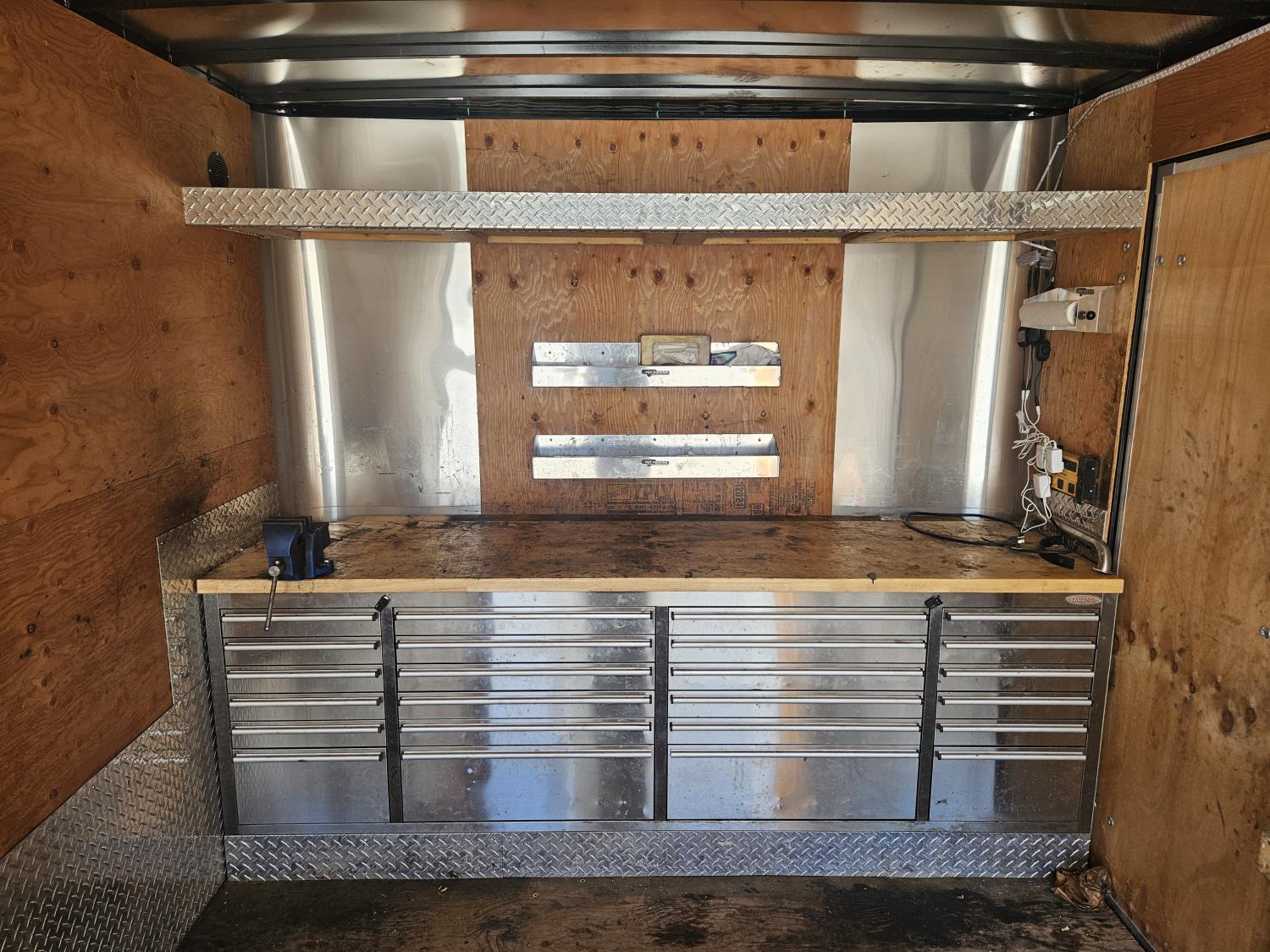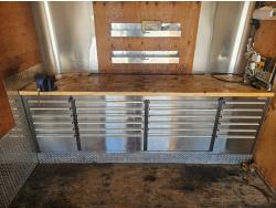 96 inch interior width, 88 inch interior height, ball hitch, side door, fold down door, electric brakes, spring suspension, 8 ft 24 drawer work bench tool chest, 4" vise, LED strip lighting, shelves, hangers, spare tire, 3500 lb axles, 225/75R15 tires