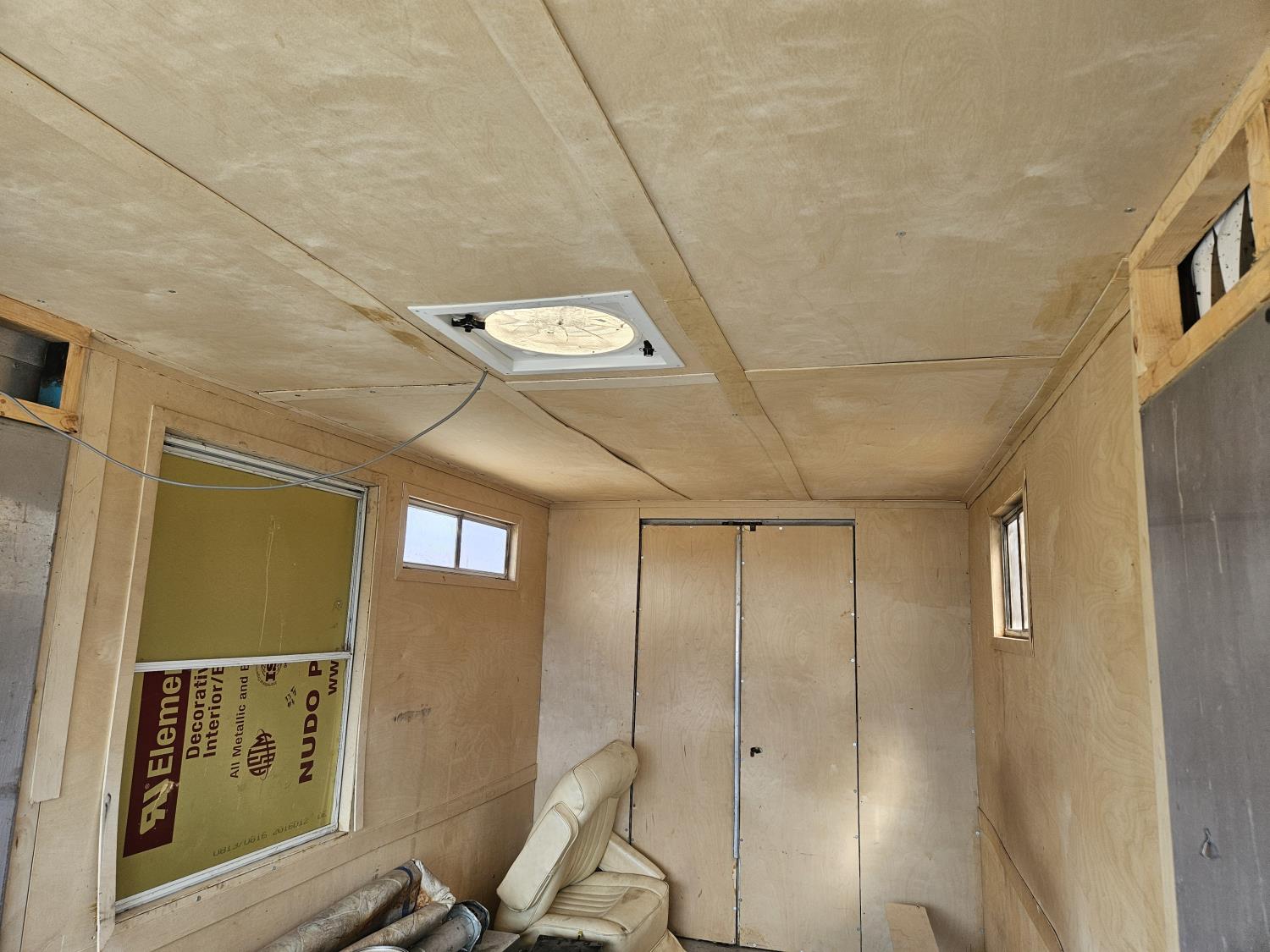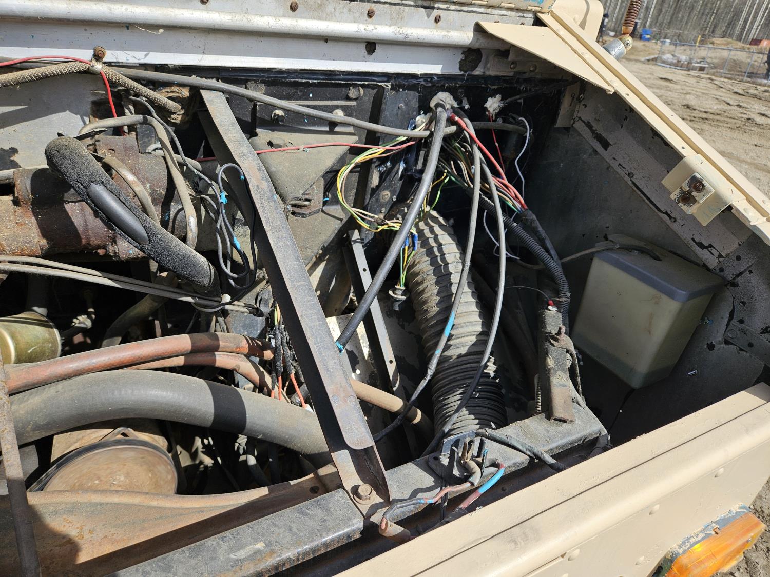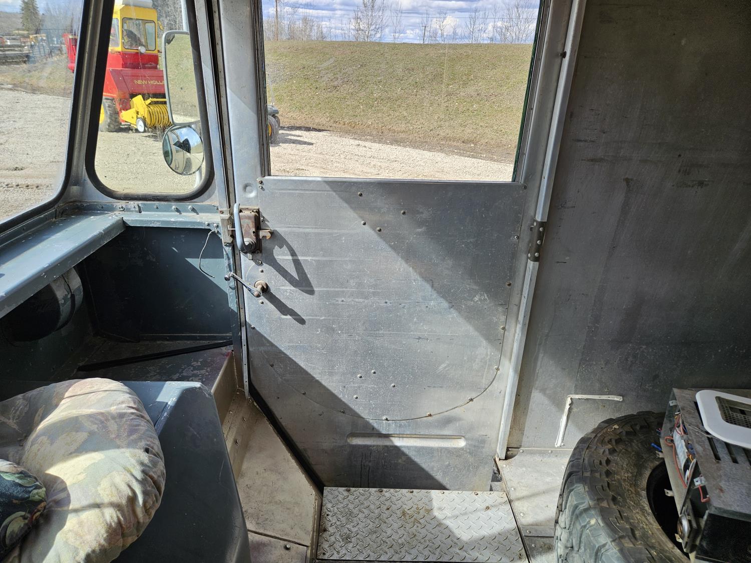 292 cu in, 6 cylinder, gas, 4 speed manual transmission, 410 carrier rear end, ceiling fan, leather captain seat not installed, diesel furnace not installed, spare tire, 33X12.50R17 tires