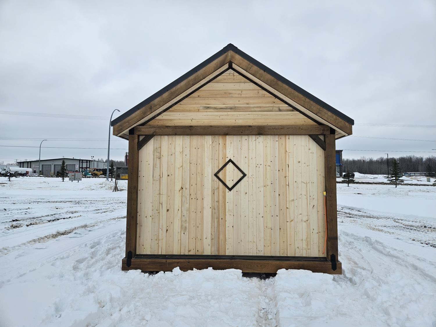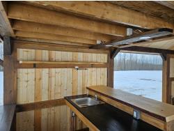 24 ft x 12 ft, kitchen counter and sink, wired with lighting and receptacles, portable propane fire place, picnic table. loft, timber bench, tin roof, on skids