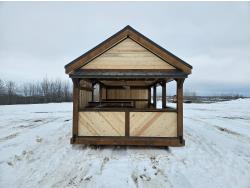 24 ft x 12 ft, kitchen counter and sink, wired with lighting and receptacles, portable propane fire place, picnic table. loft, timber bench, tin roof, on skids