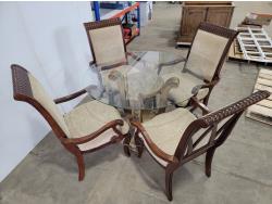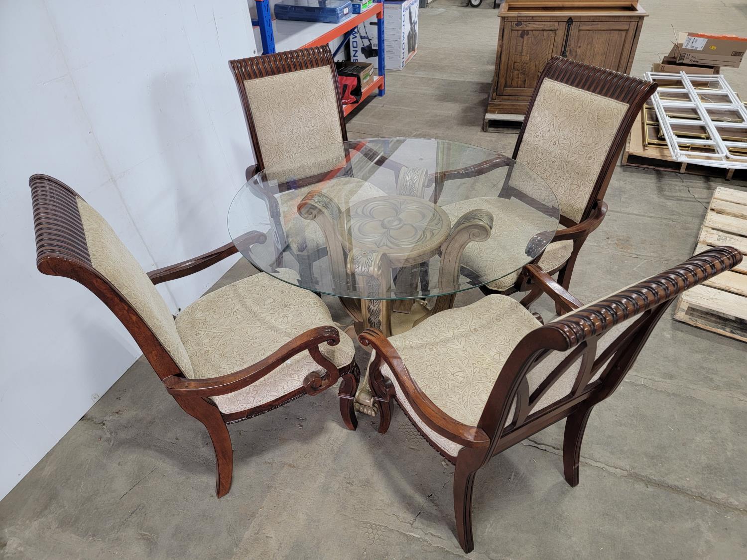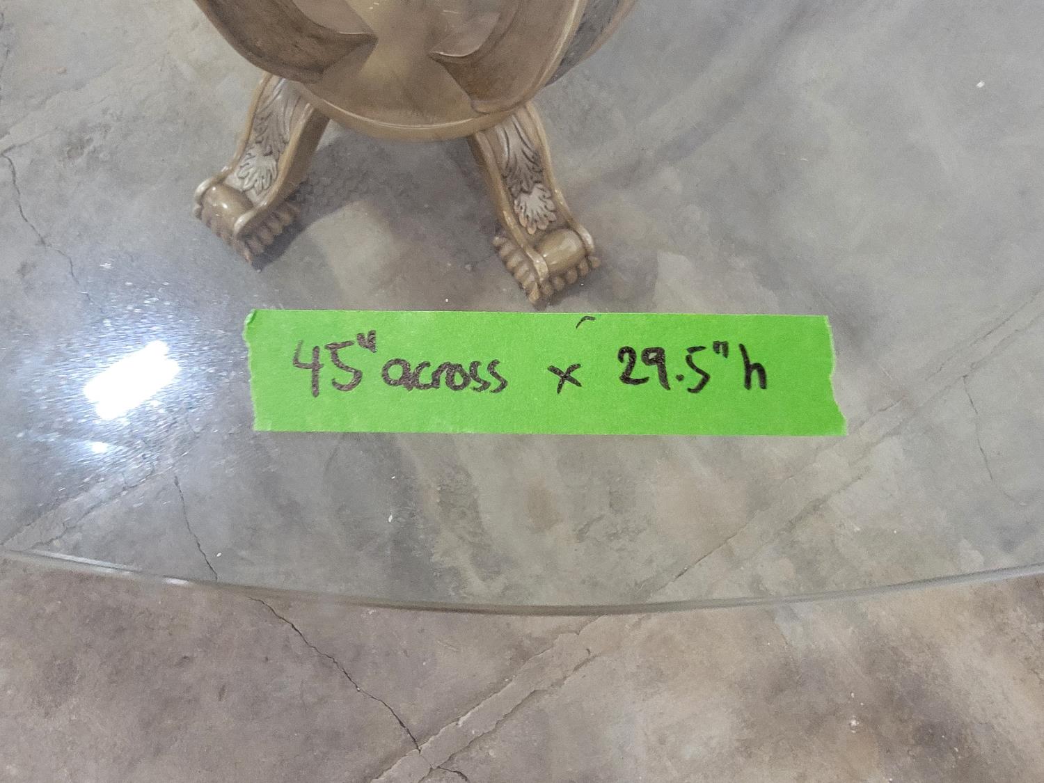 round glass top table 45 inch across 28-1/2 inch h, and (4) chairs