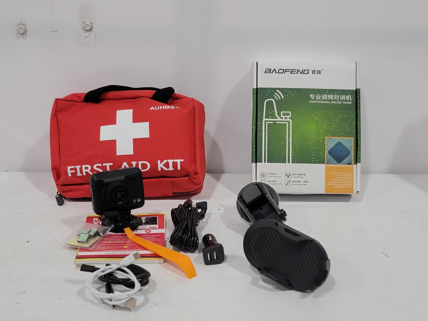 1084 First Aid Kit, Dashcam, Walkie Talkies, Phone Holder (Unused)