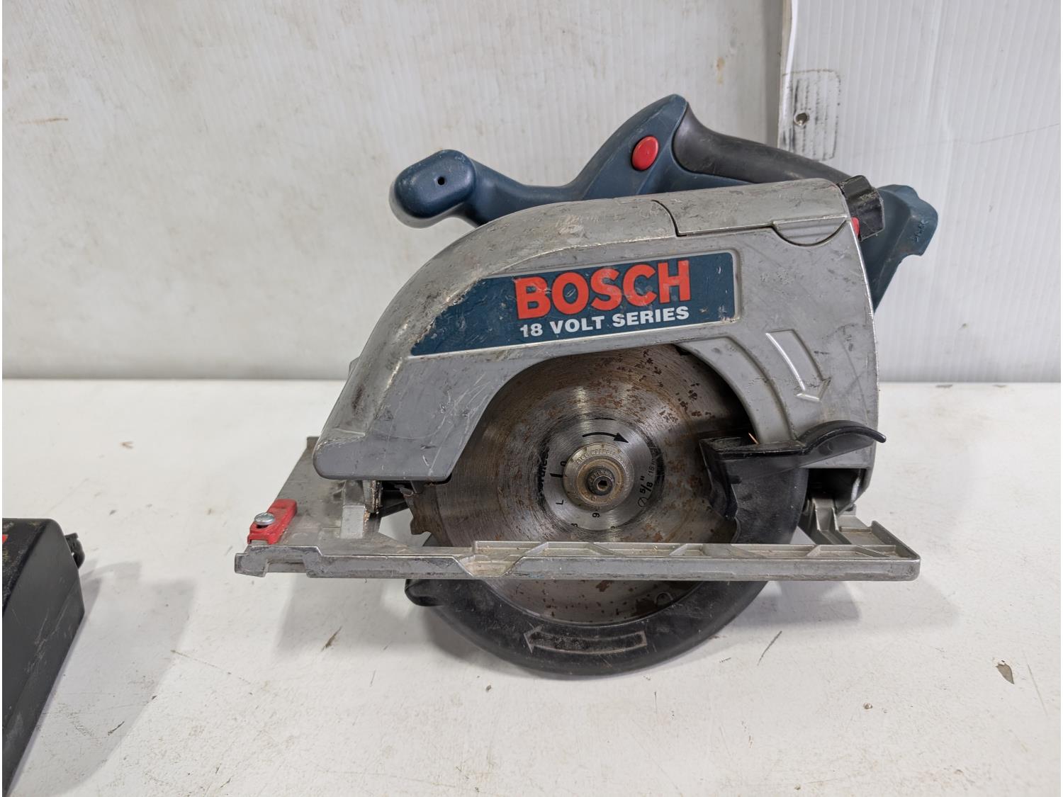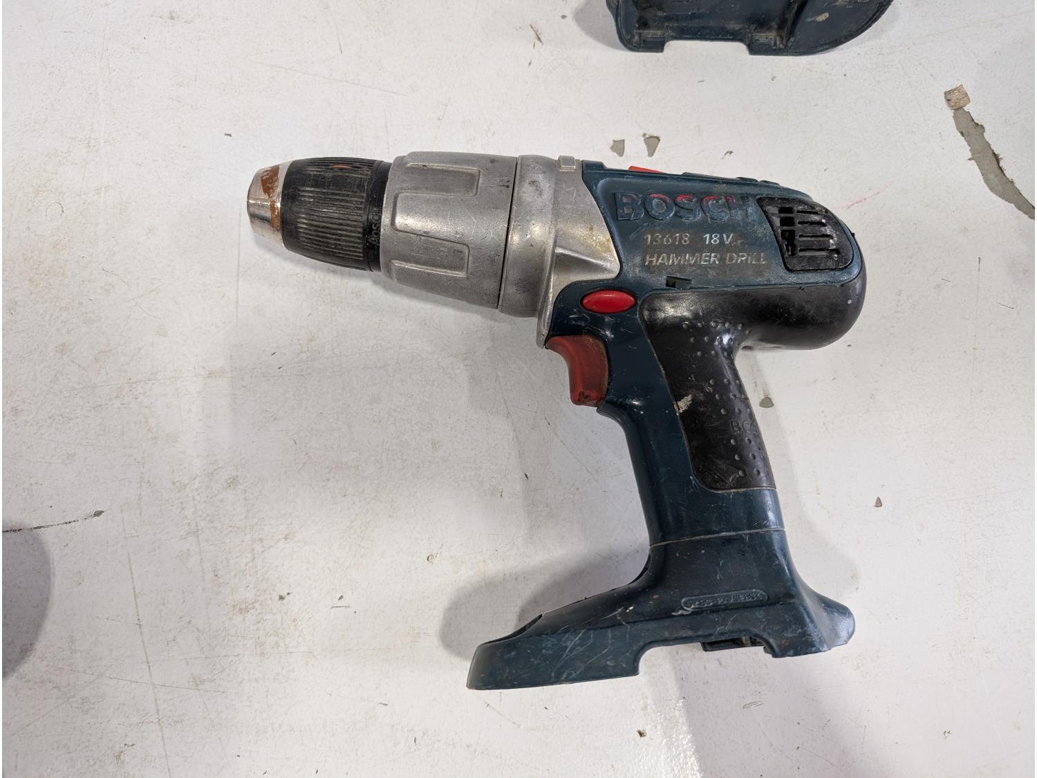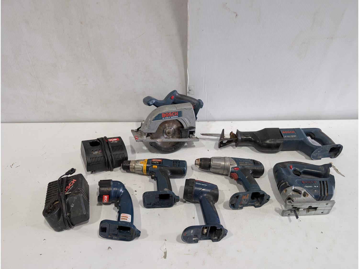 18 V reciprocating saw, 18V jig saw, 18V hammer drill, 18V flashlight, 14.4V Ryobi drill, 14.4V Ryobi Flashlight, Bosch 18V 6-1/2 inch circular saw, Bosch battery charger, Ryobi battery charger