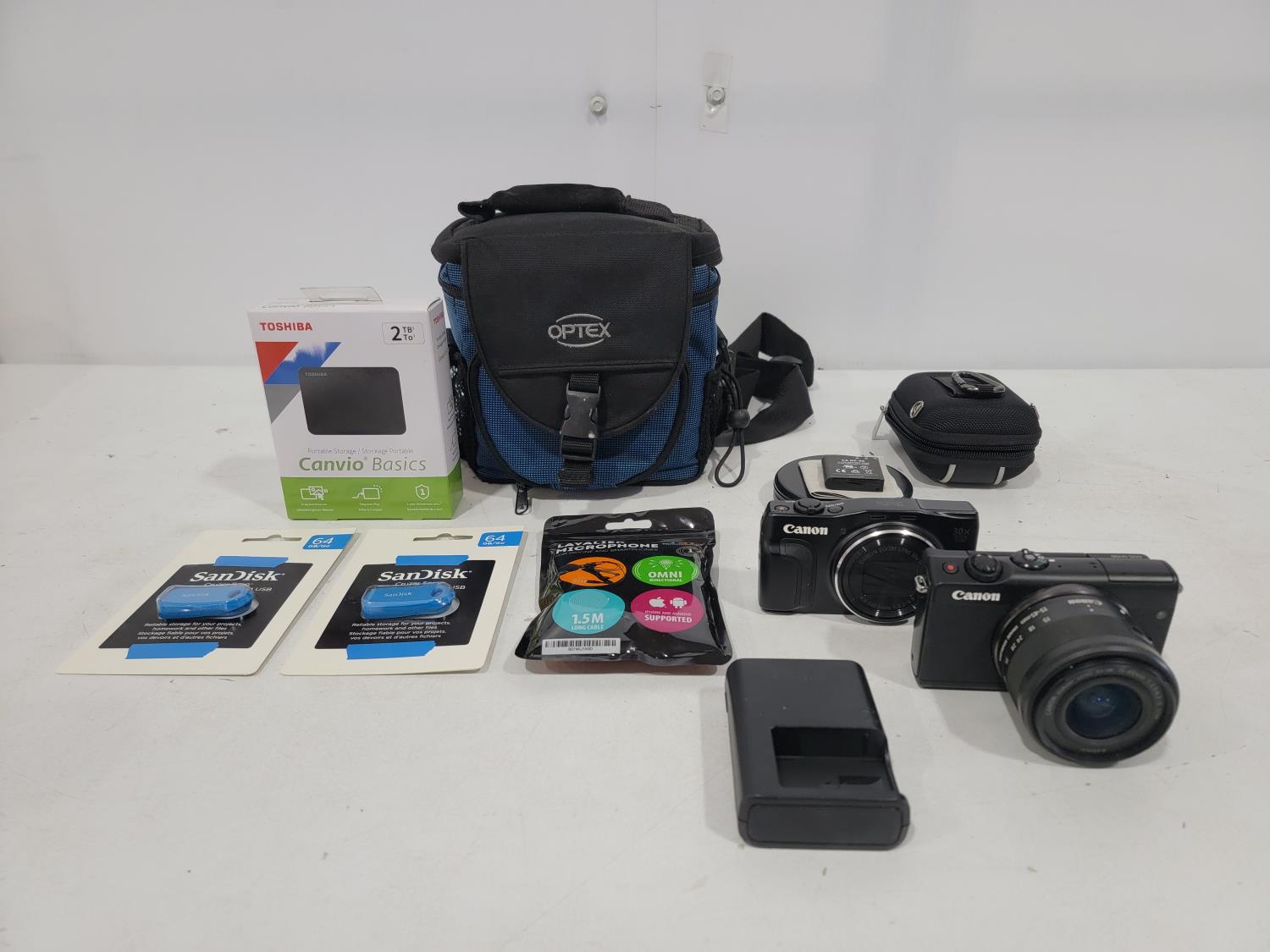 (2) cameras, portable storage, usb flash drives, mic, storage bags