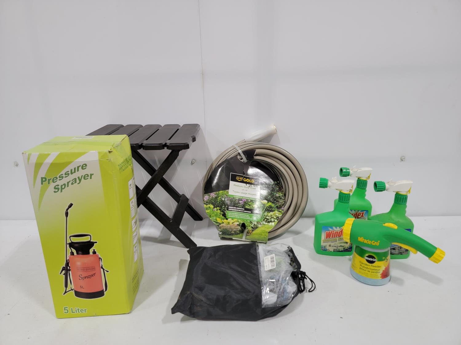 pressure sprayer, garden hoses, folding seat