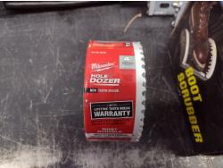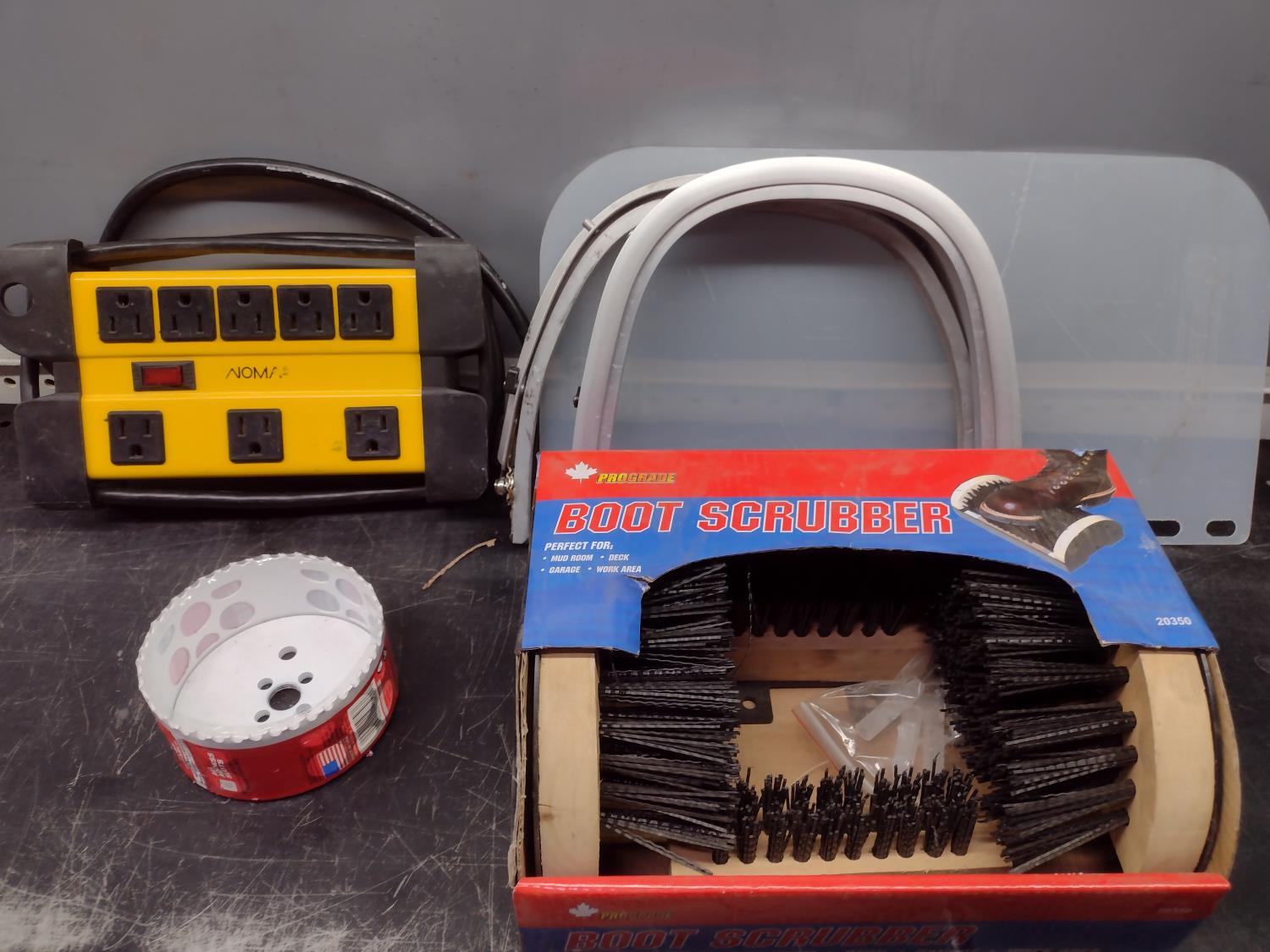Size 11 rubber boots, boot brush, new Milwaukee hole saw, power bar, hard hat safety shields