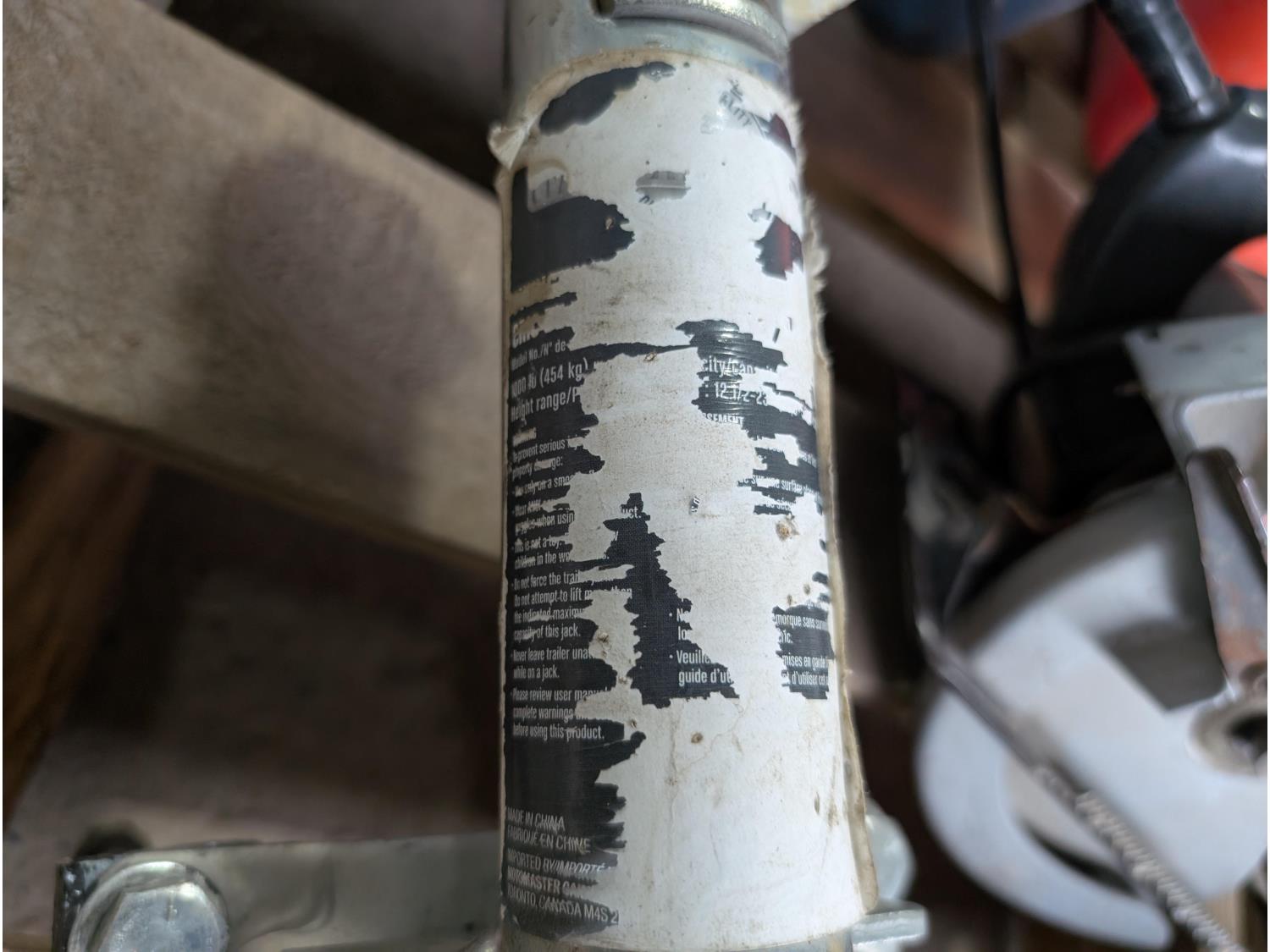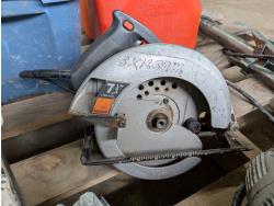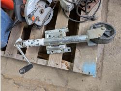 Truss mending plates, (2) jerry cans, trailer jack, (3) circular saws (untested), 500 W work light