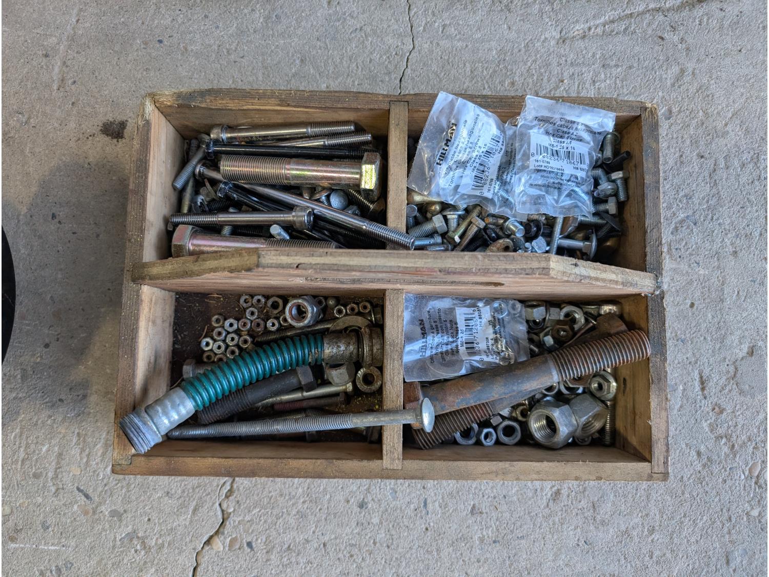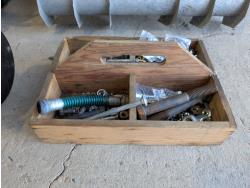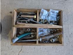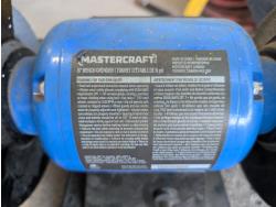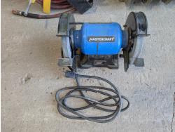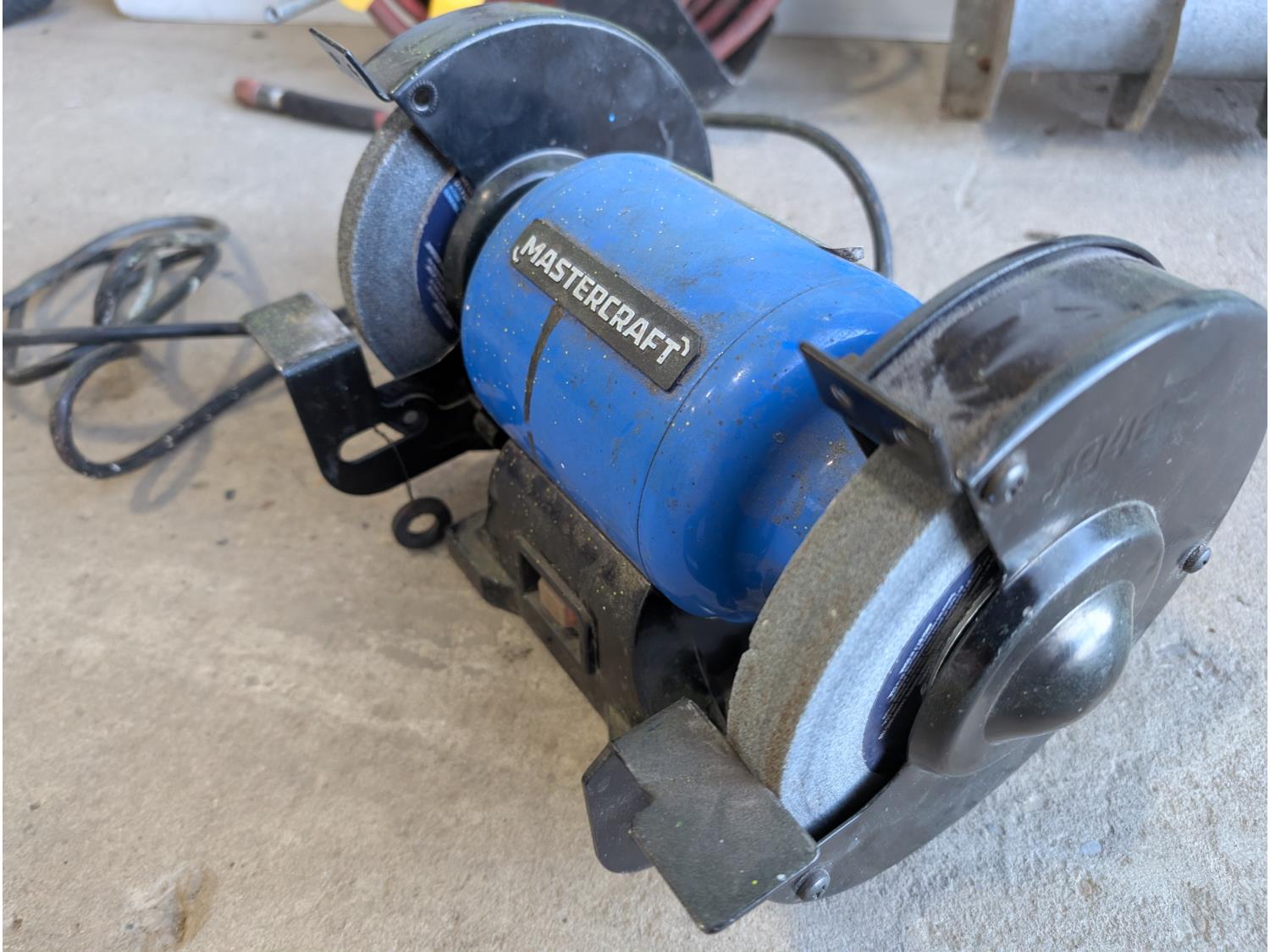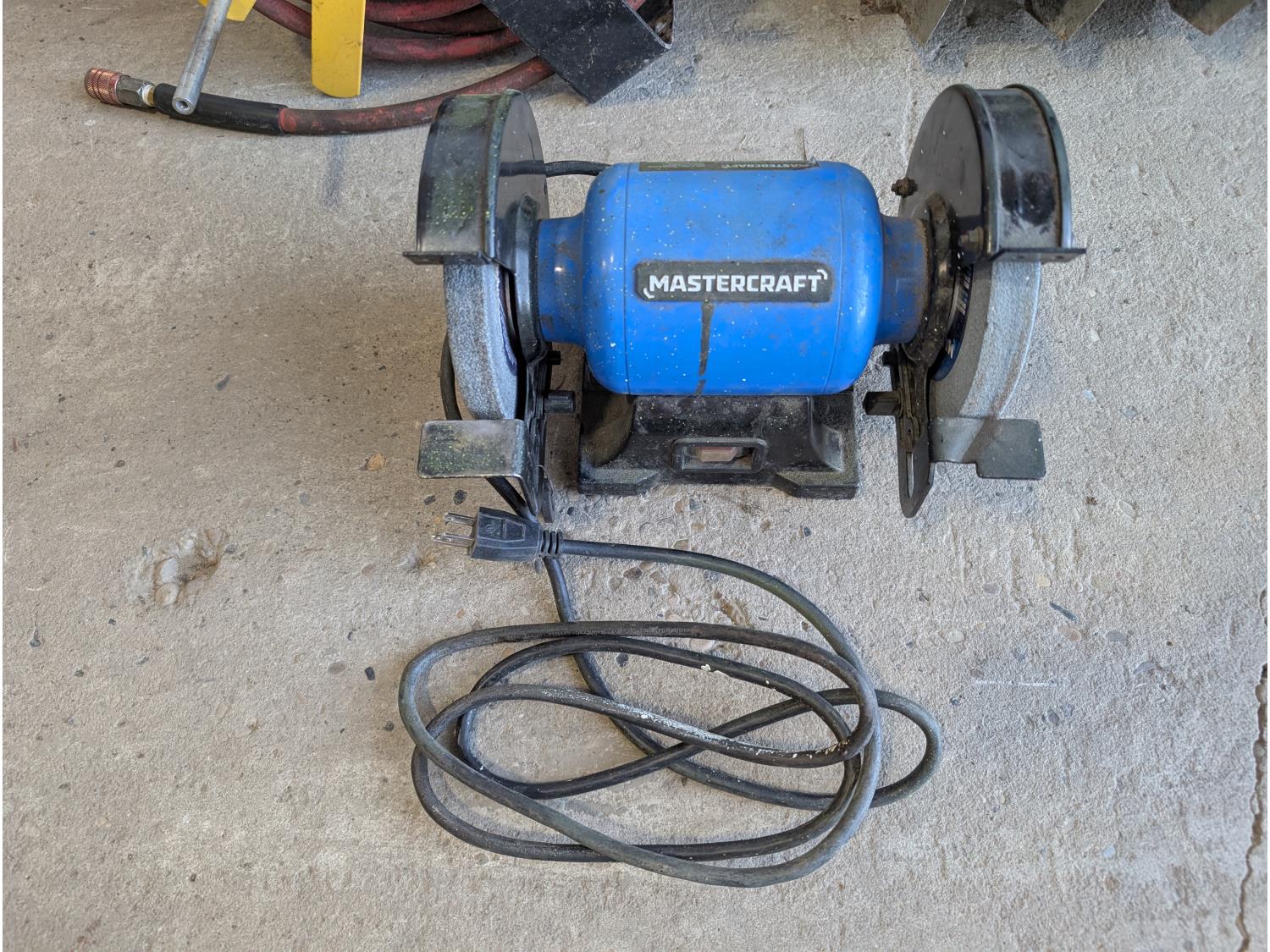 Bolt bin with contents, air hose with reel, Mastercraft 6 inch bench grinder