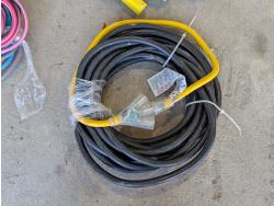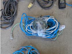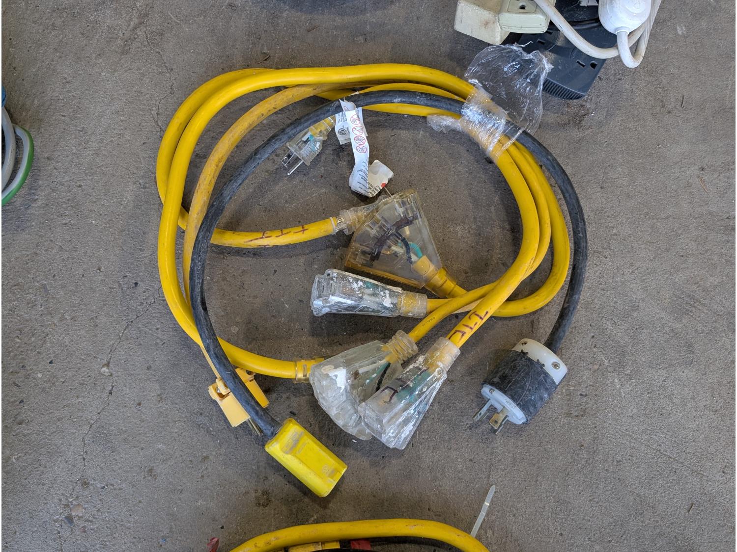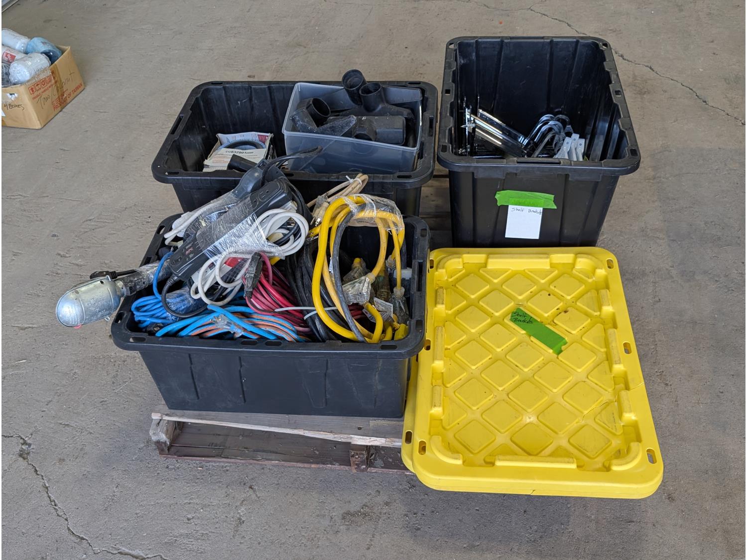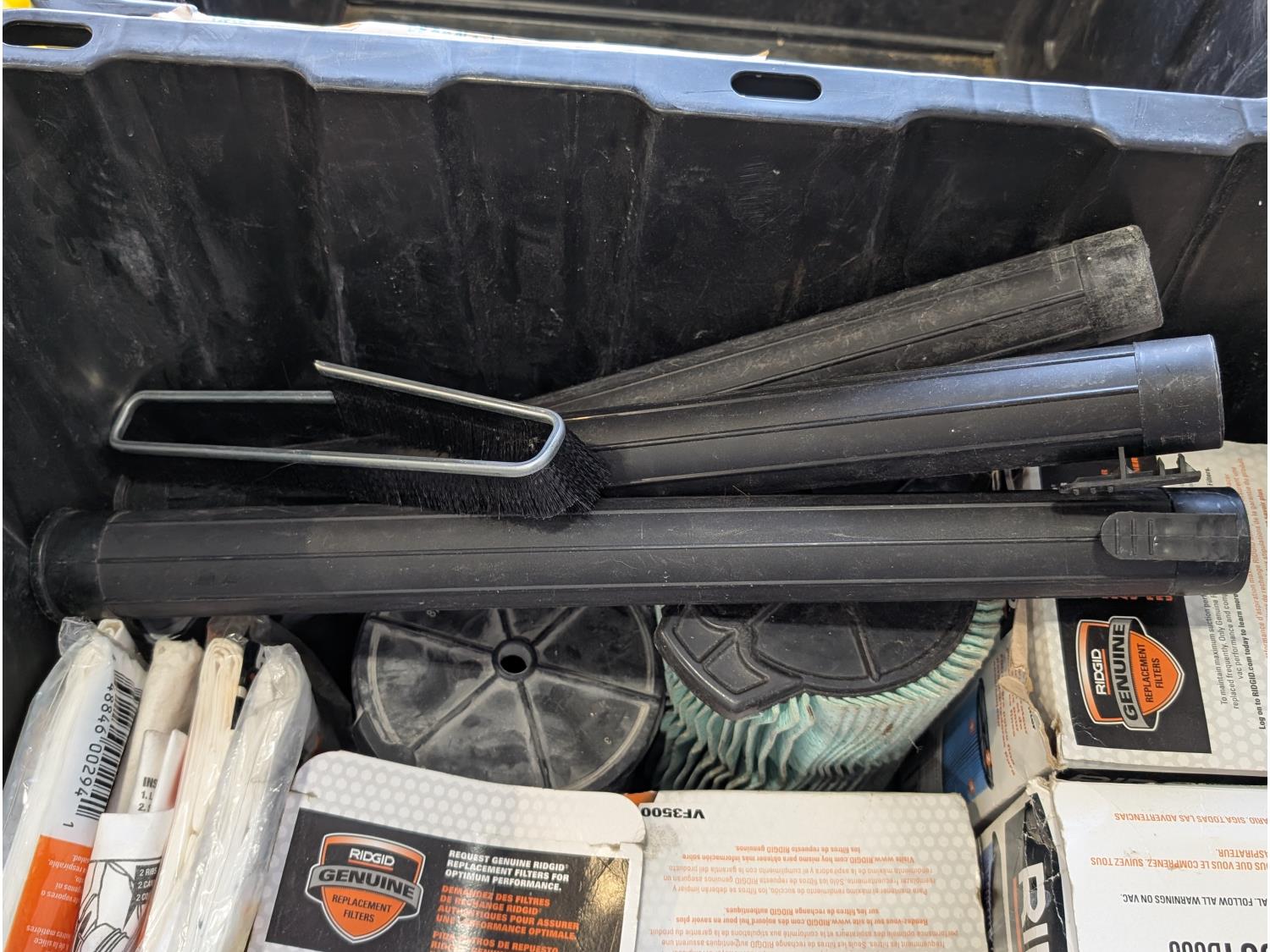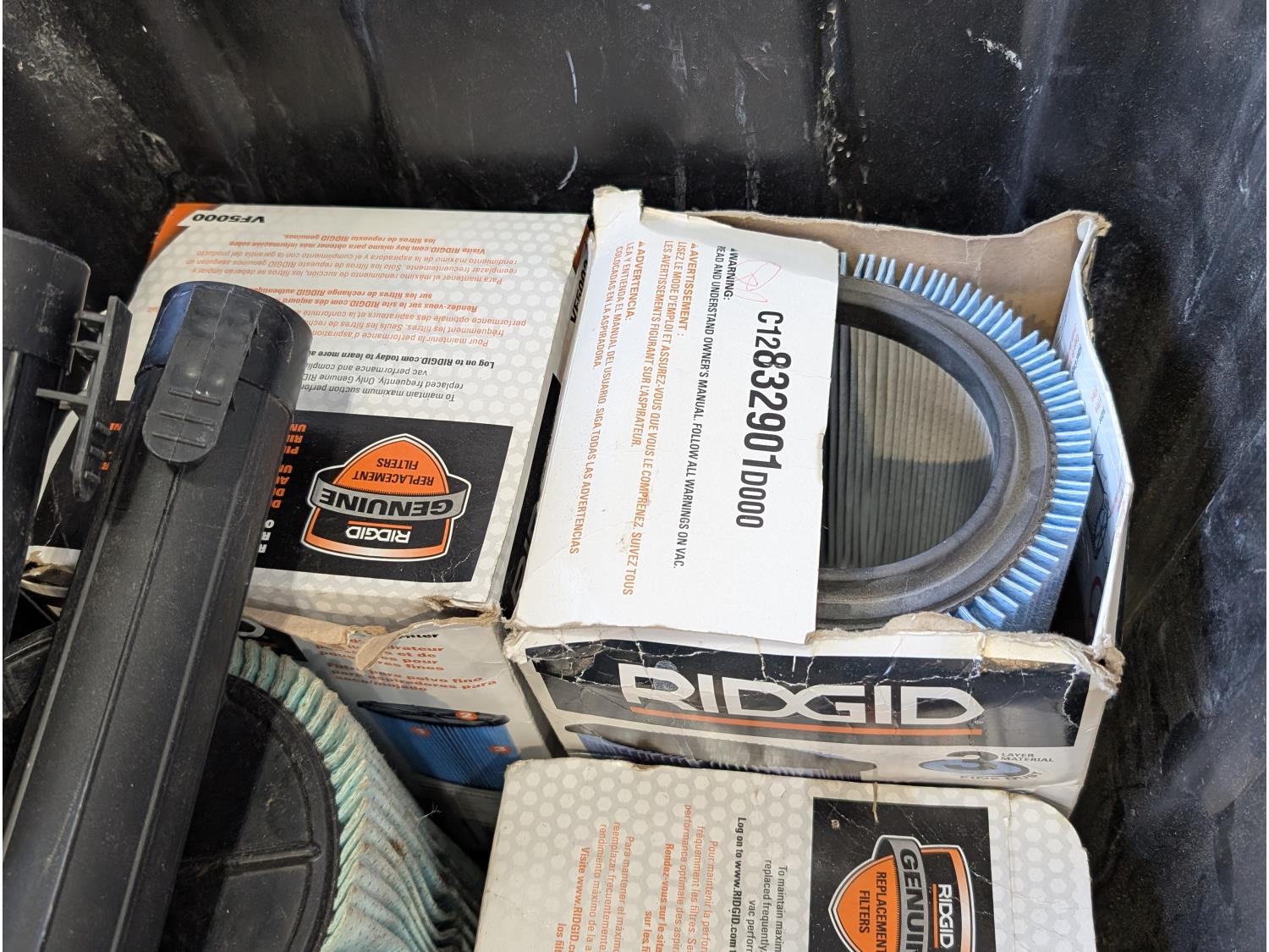 Shelf brackets, Ridgid vacuum air filters and filters, power bars, extension cords, adapter cords, (3) bins
