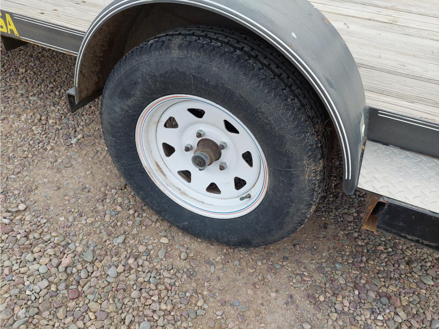 77 inch wide deck, slide in ramps, spring suspension, ball hitch, tool / storage box, 3000 lb axles, 205/75R15 tires