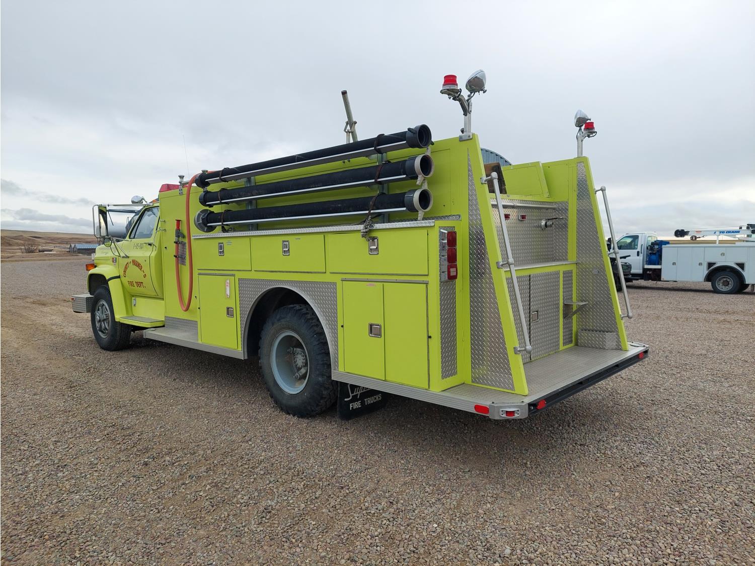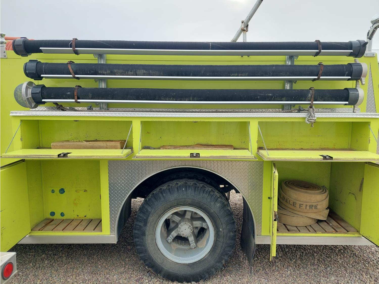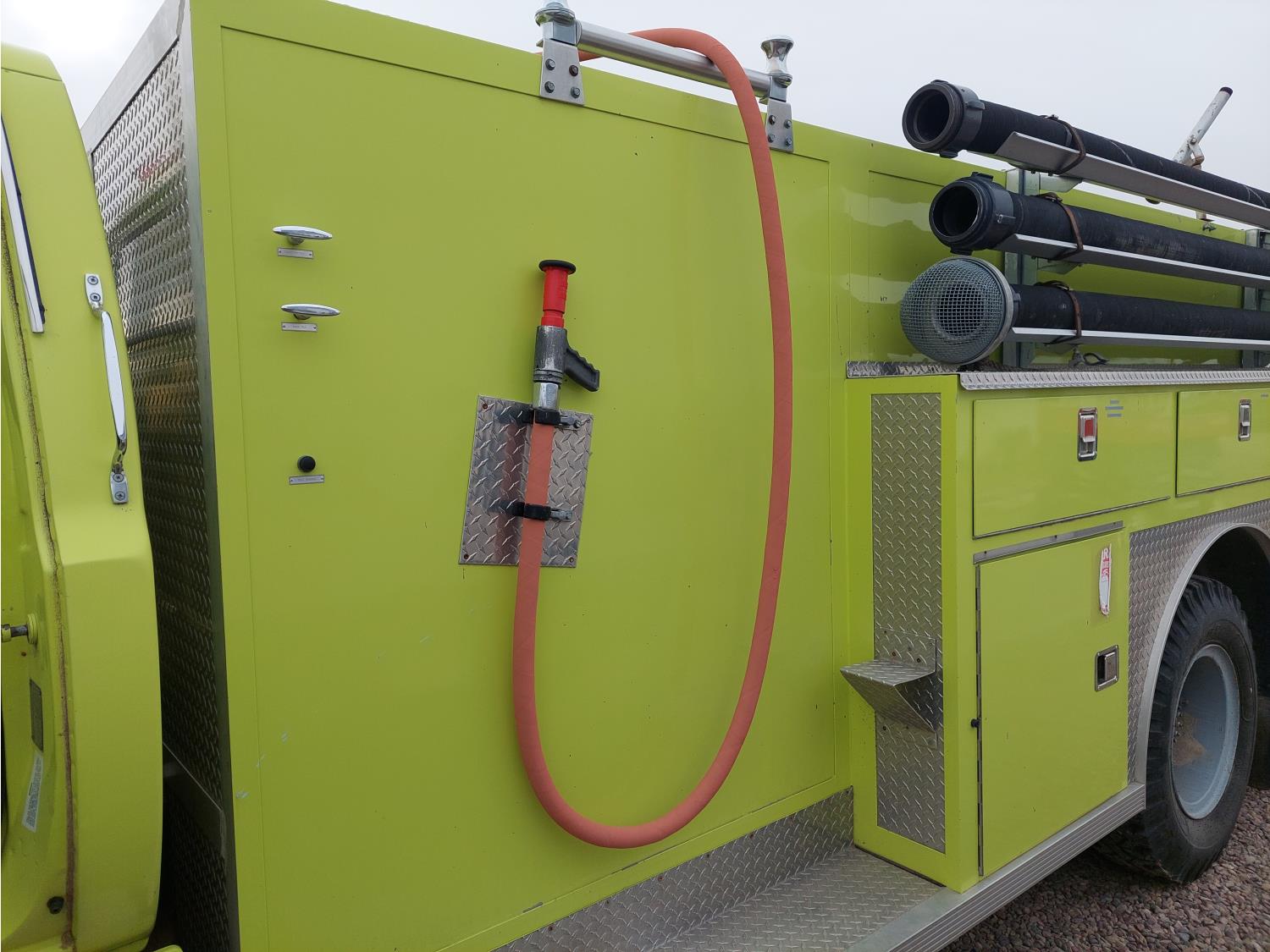 7.0L V8 gas engine, Hale P75-3 pump, 3 inch and 6 inch inlets and outlets, automatic transmission, wood upper deck, 16 ft body, 9000 lb front axle, 18,500 lb rear axle, 10.00-20 tires