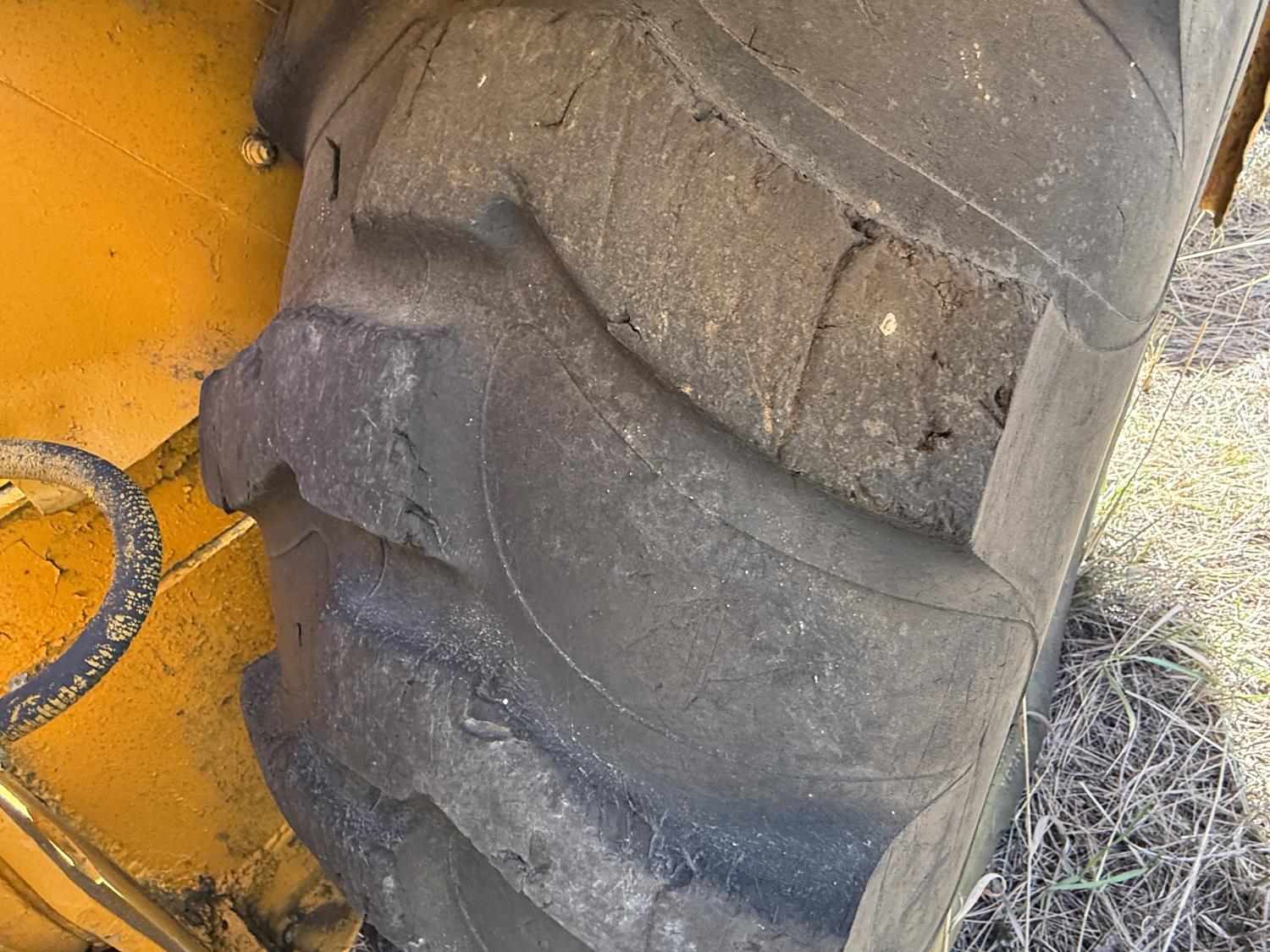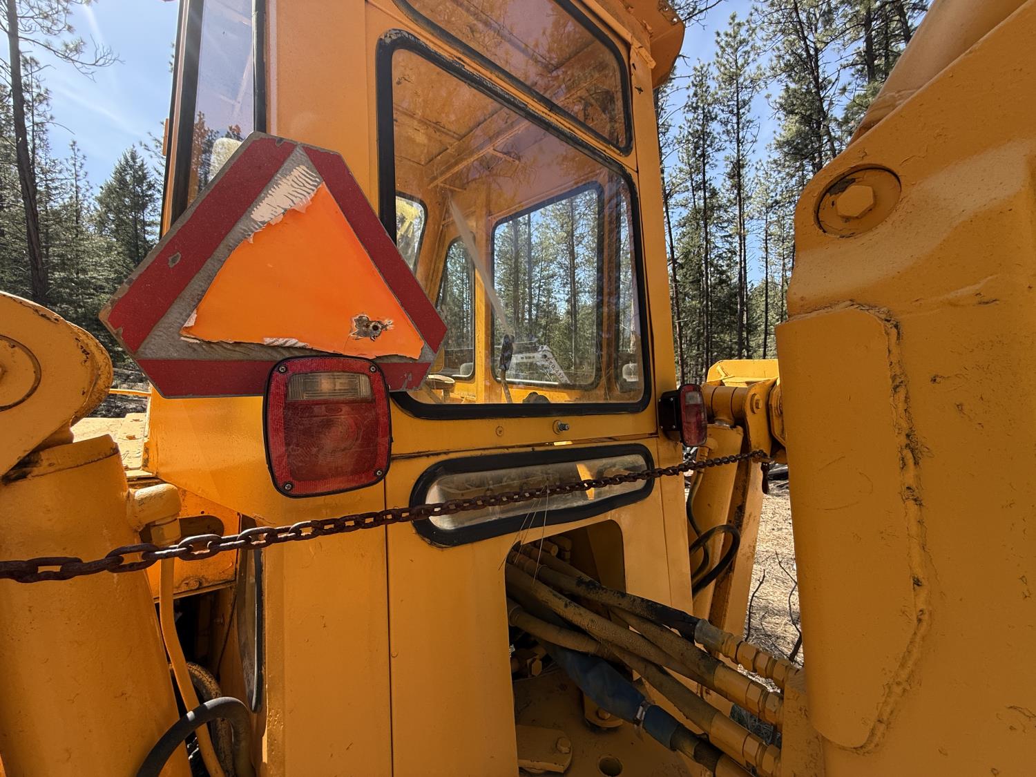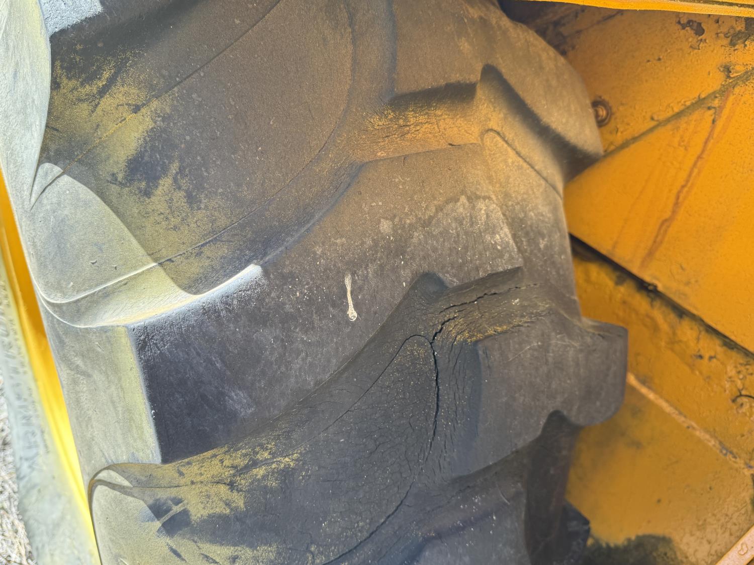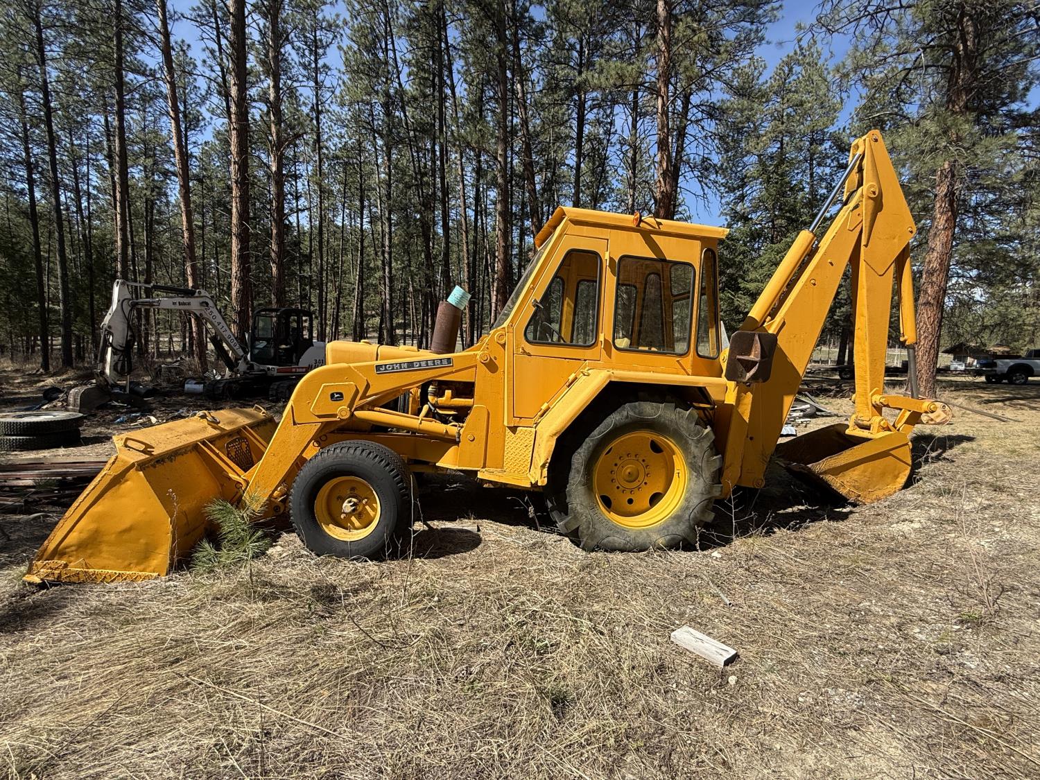 Enclosed cab, powershift transmission, 90 inch smooth loader bucket, 24 inch dig backhoe bucket, manual coupler, 5 Ft stick, outriggers, 14X17.5 front tires, 18.4X28 rear tires