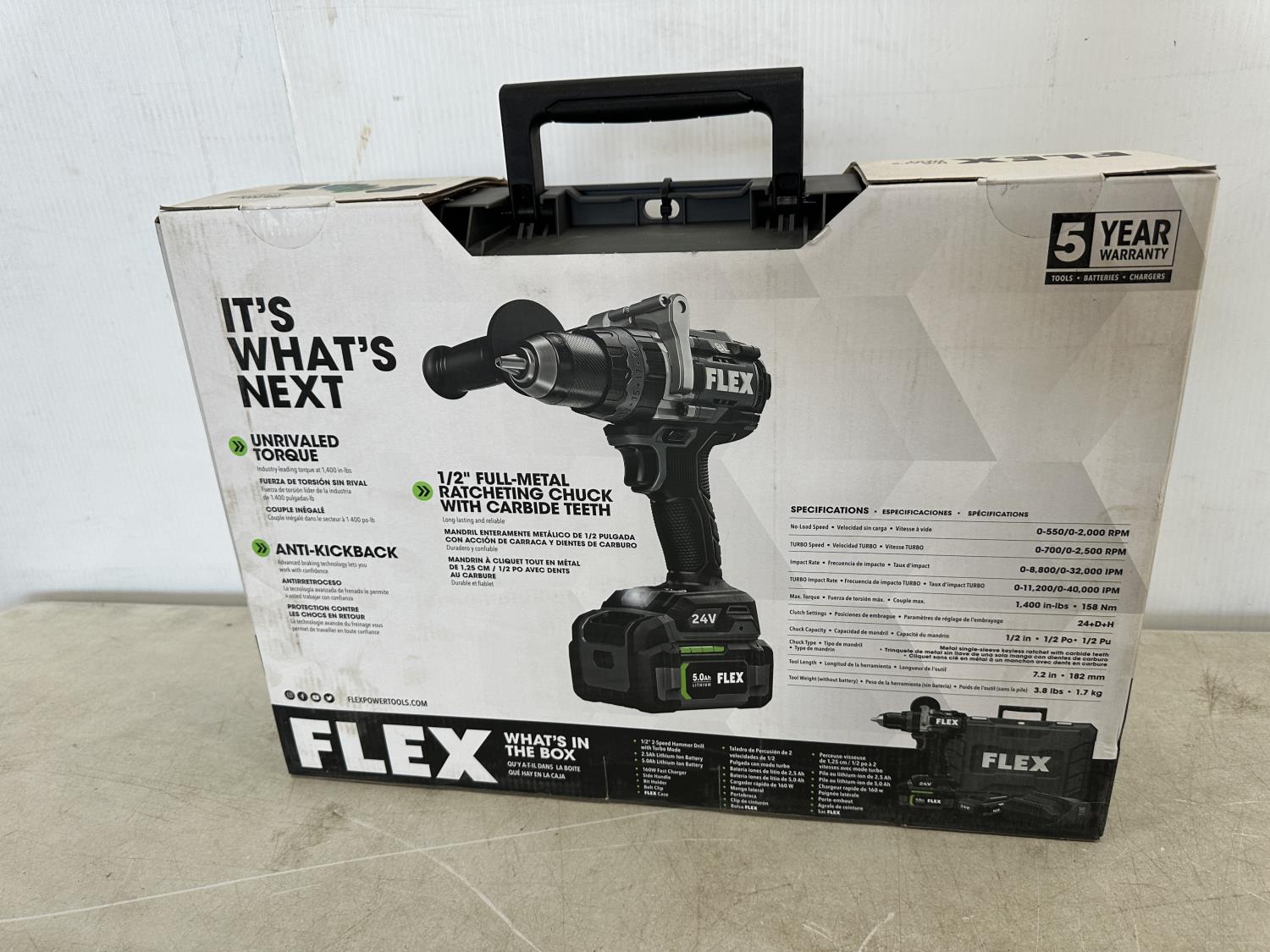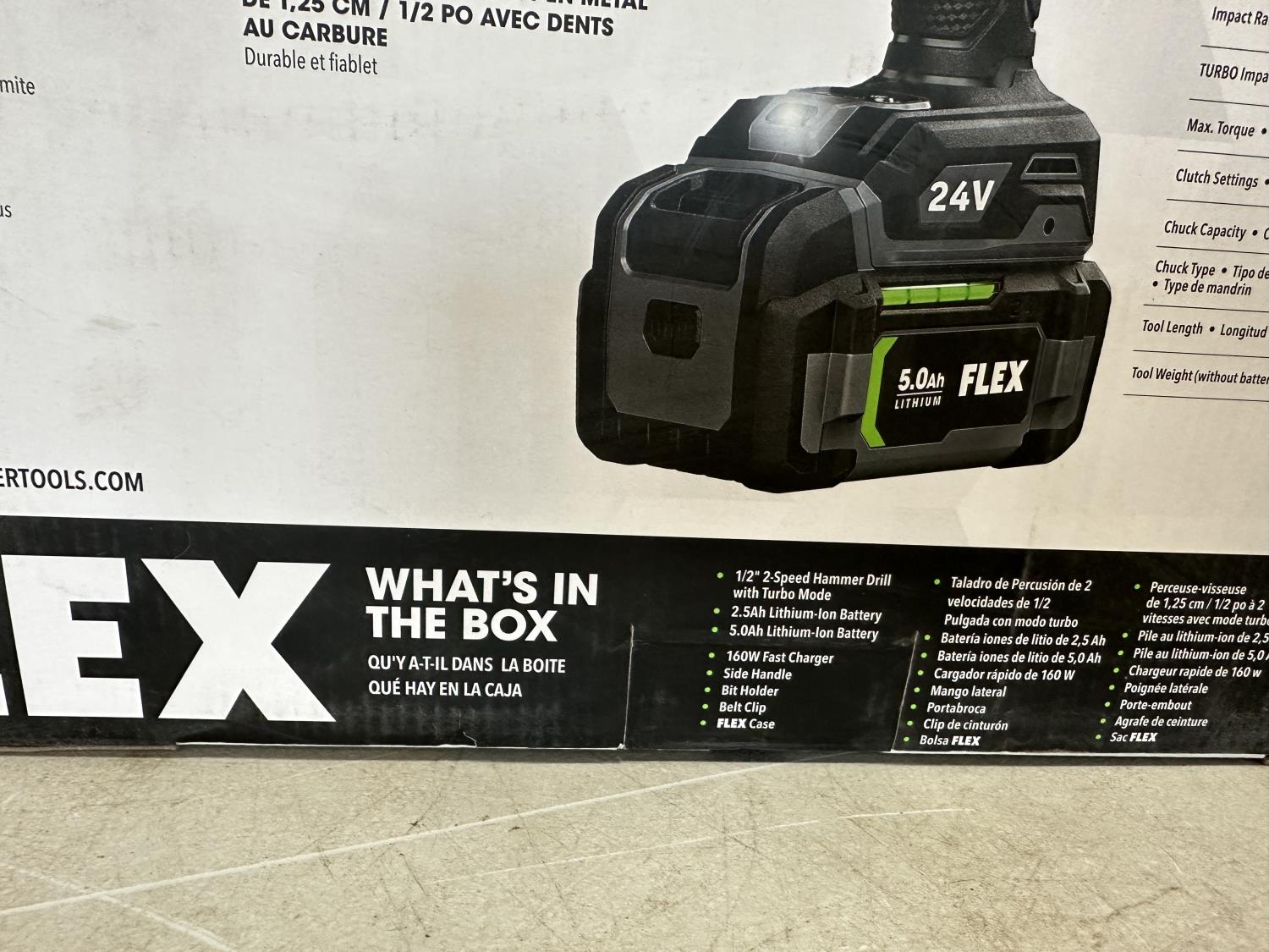 comes with 2.5Ah and 5.0Ah lithium-ion batteries, 160W fast charger, side handle, bit holder, belt clip and FLEX case