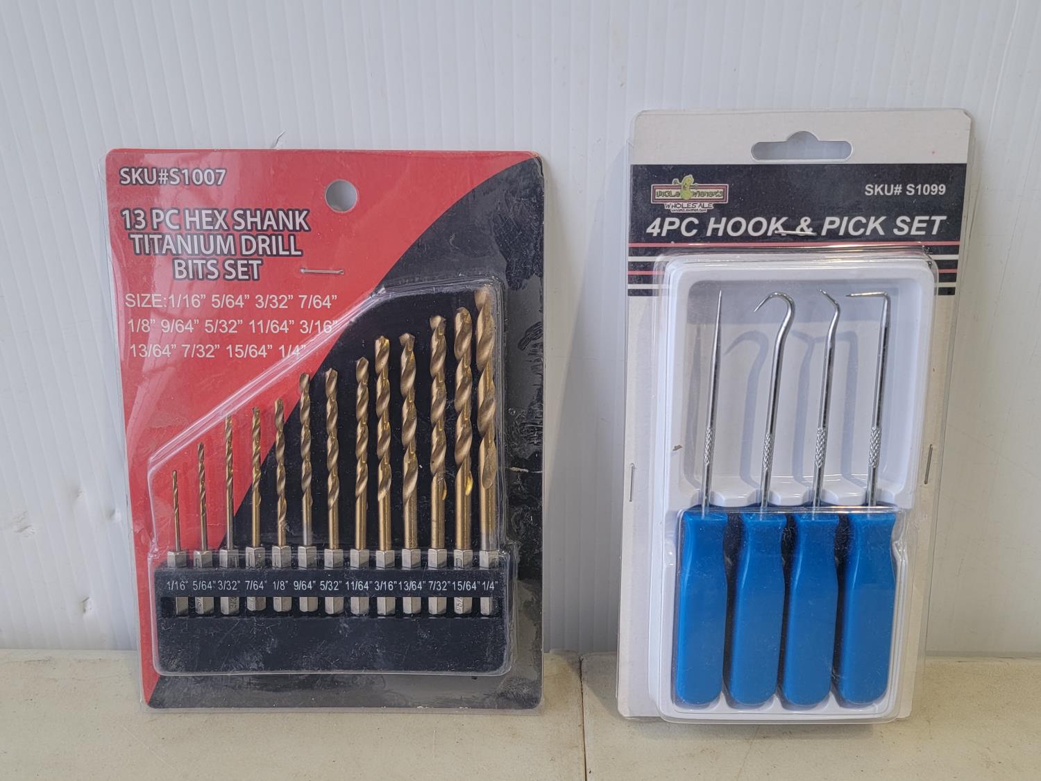 1812 13 Piece Hex Shank Titanium Drill Bit Set and 4 Piece Hook & Pick Set (Unused)