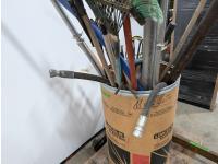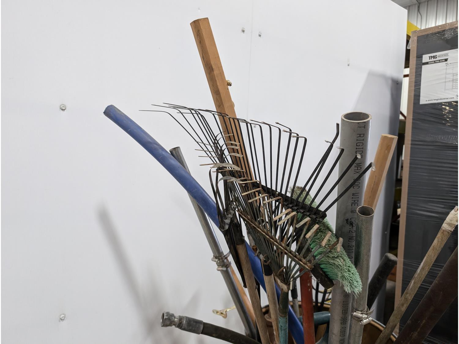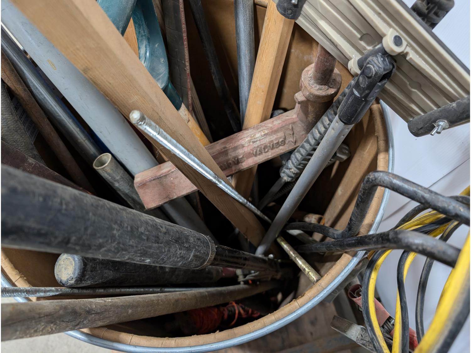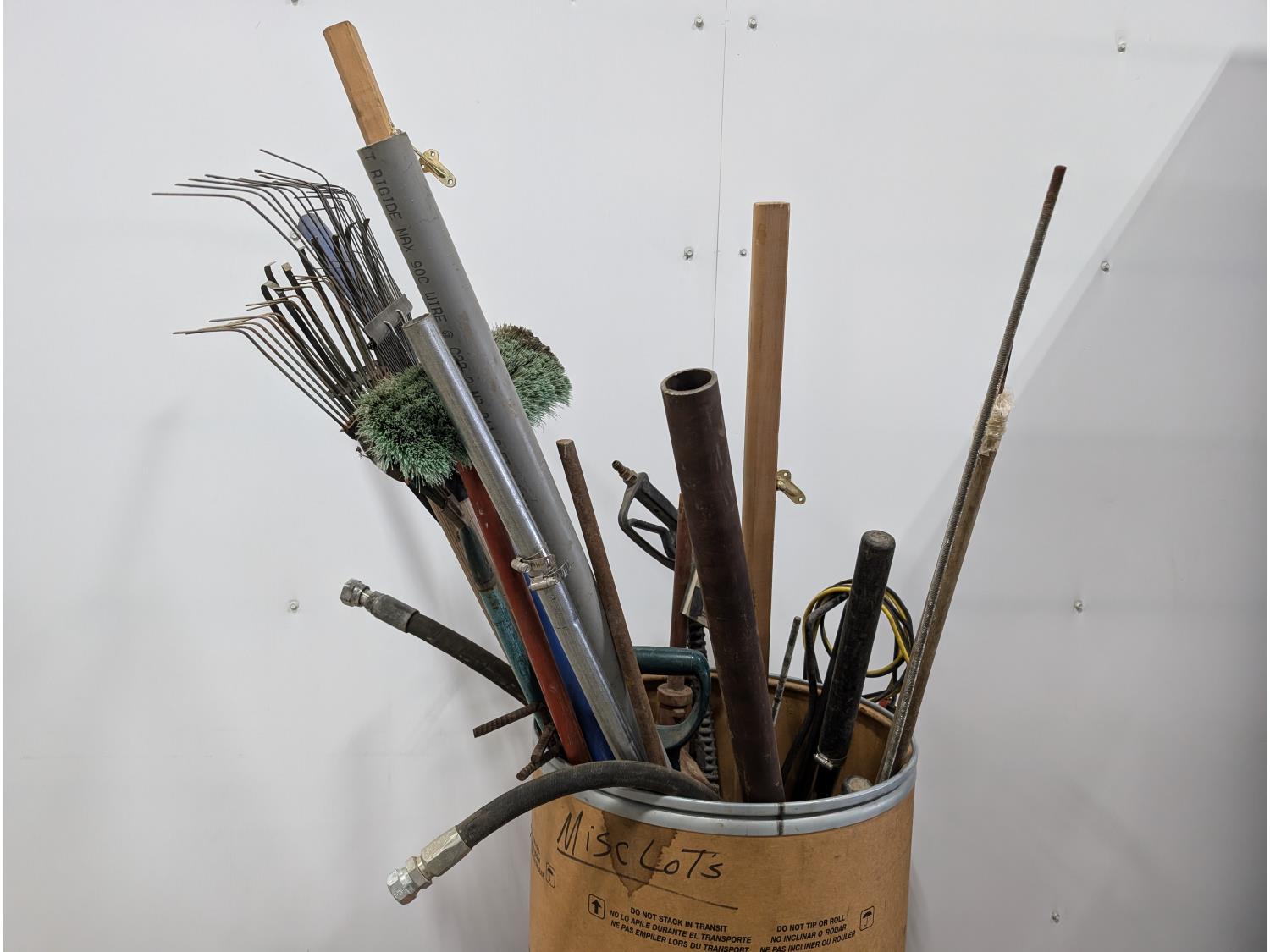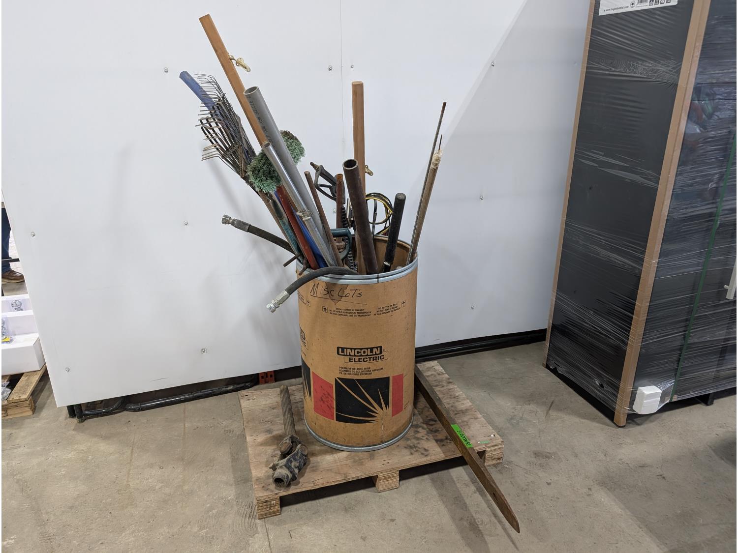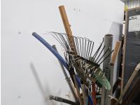 Pipes, handrails, rakes, 4 ft pallet fork, 1000 PTO shaft, miscellaneous items