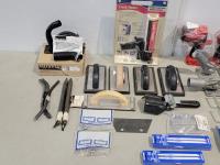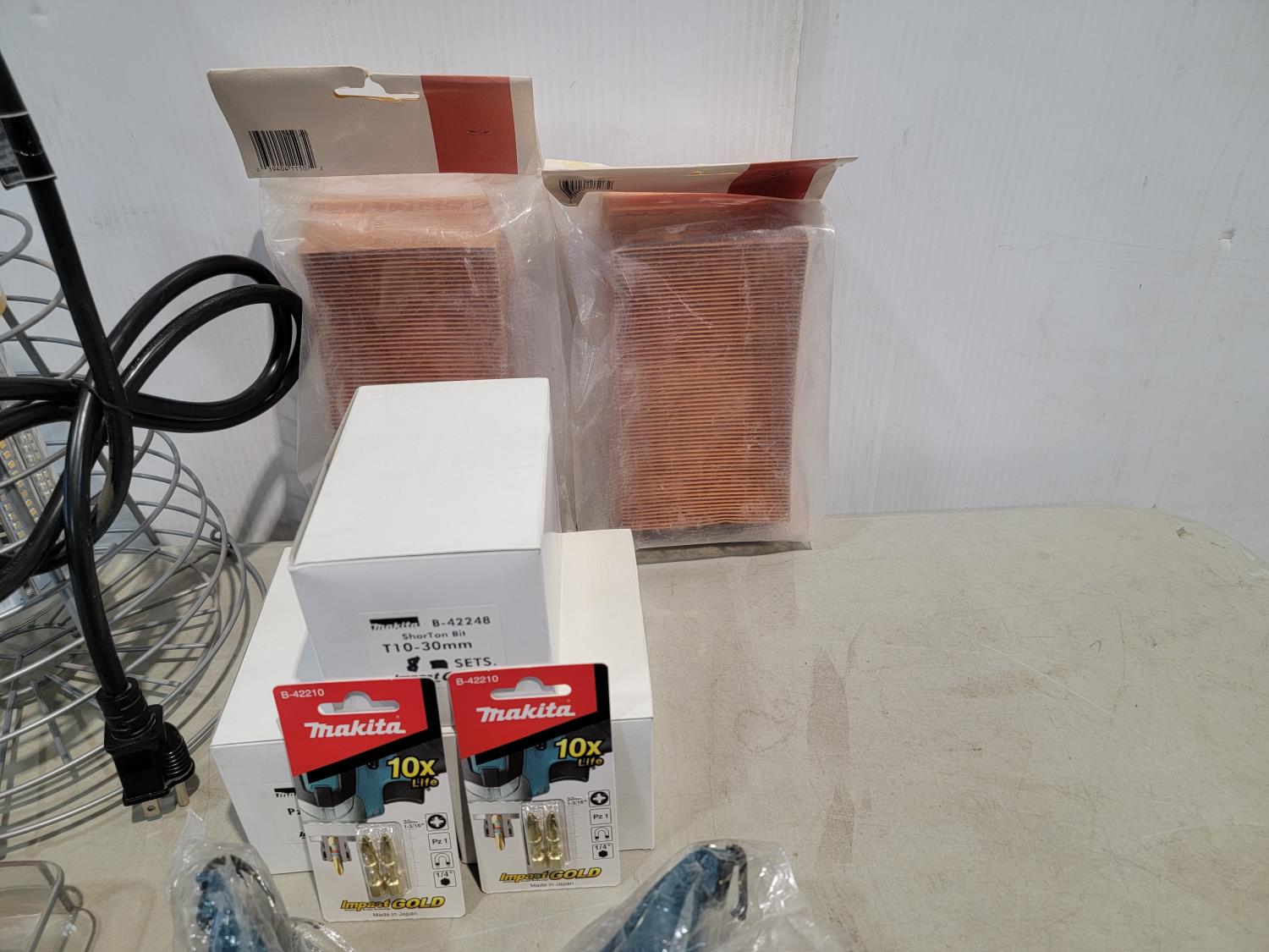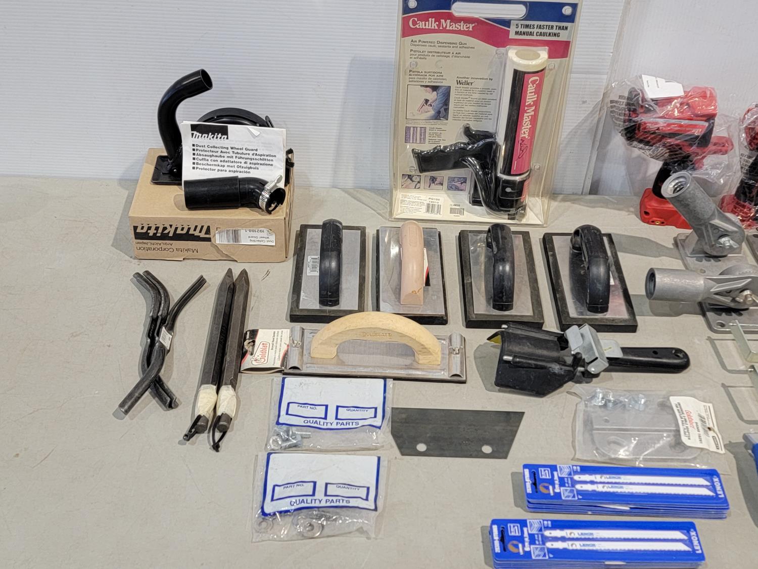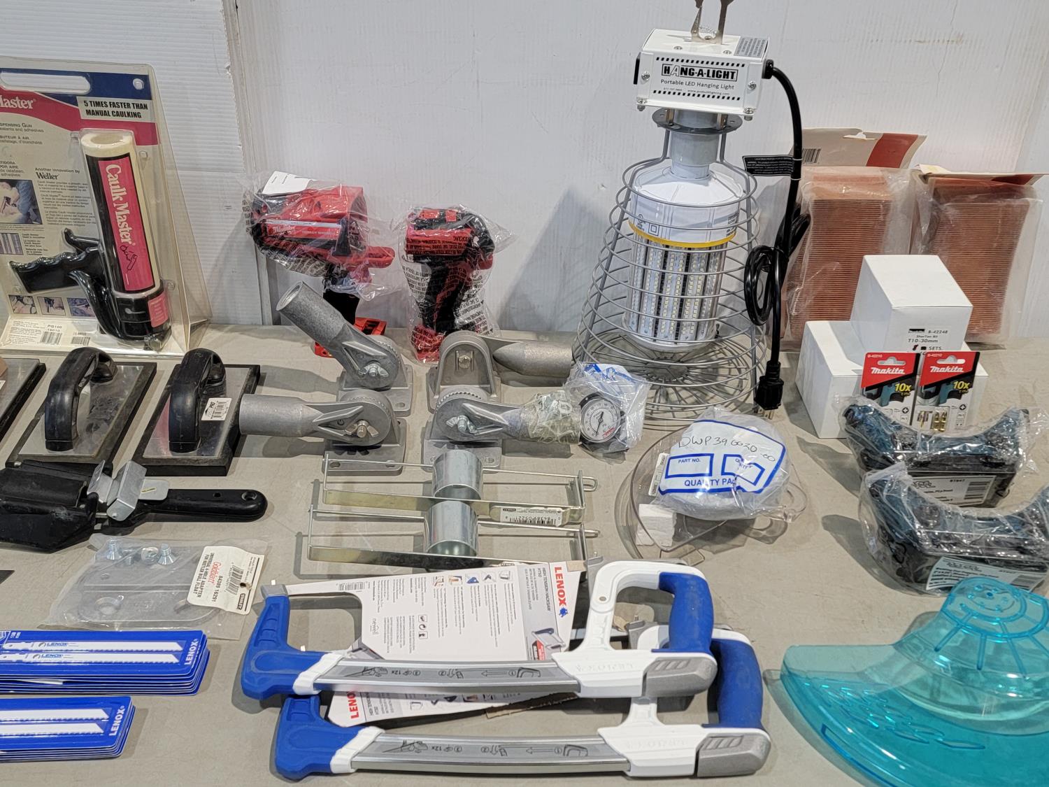 Makita dust collecting wheel guard, jigsaw blades, Caulk Master, hacksaws, portable LED hanging light, air filters